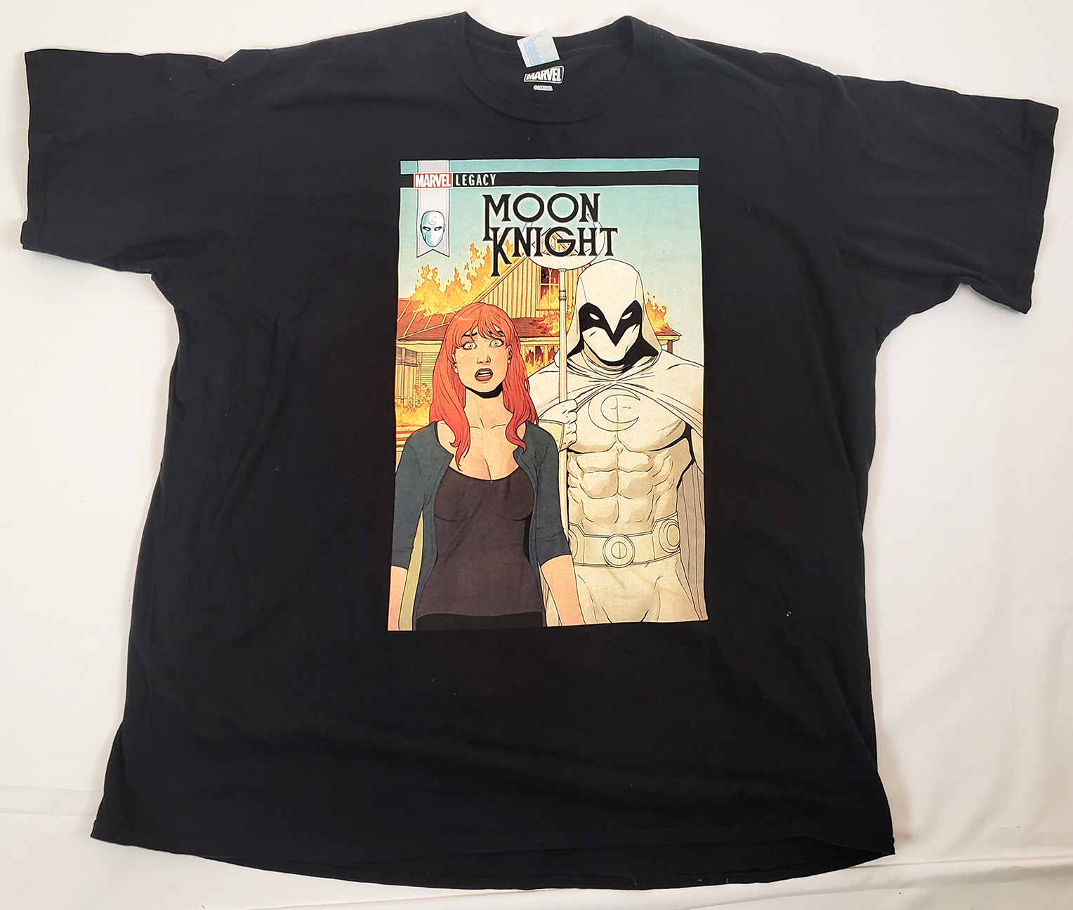 I have very little information about this shirt. It was a gift, and it looks like it might be made to order, although it does have official Marvel branding on it. It depicts the cover of Moon Knight 191 with art by Jacen Burrows and Mat Lopes. It is an homage to the famous painting American Gothic. It's particularly difficult to date shirt releases because so few of them include dates on their tags.