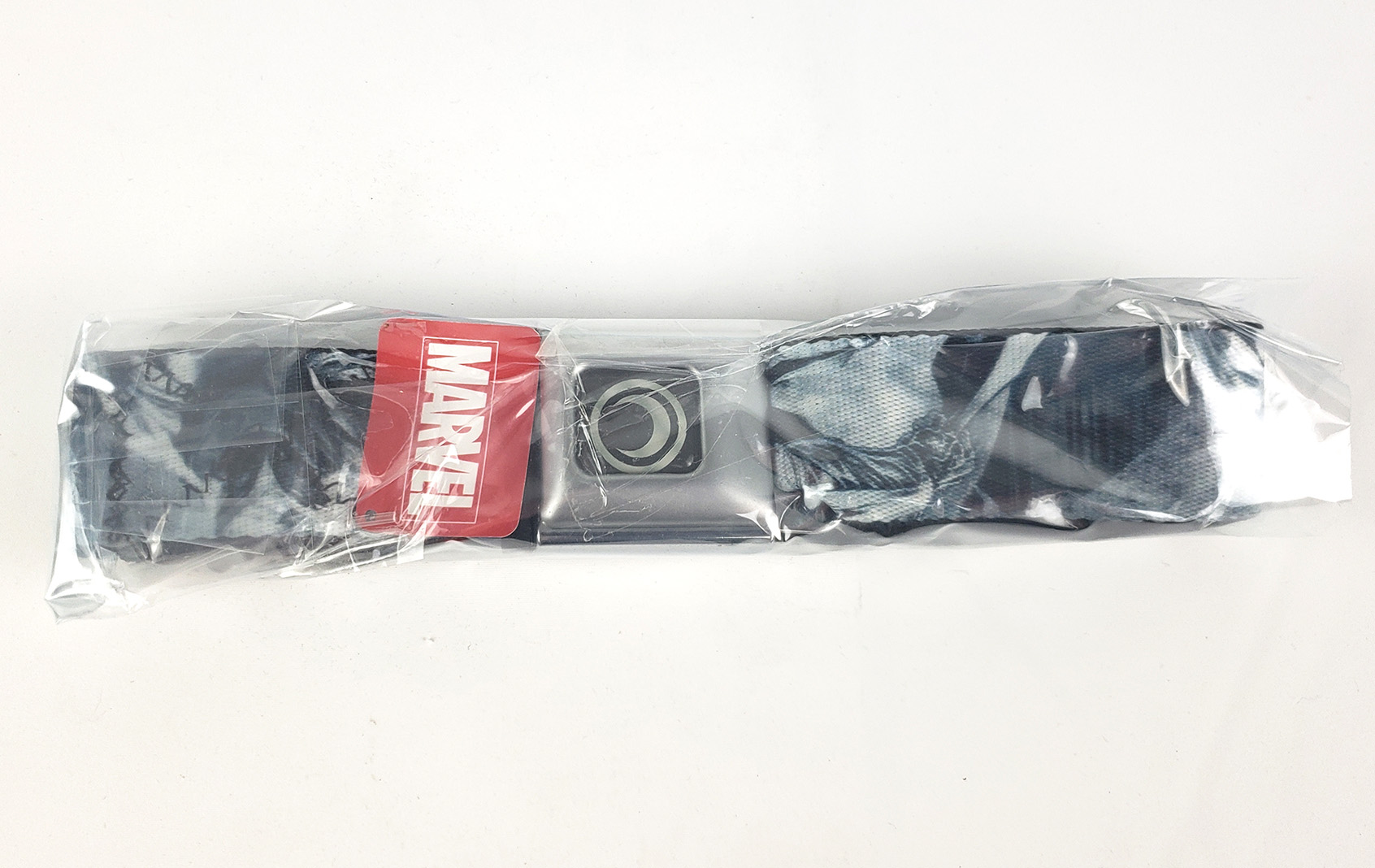 In 2013, Buckle Down produced a licensed Moon Knight themed belt. It features a car seatbelt style buckle, as well as art from various Moon Knight series in production around the time of the belt's manufacture. Its dimensions are 1.5 inch wide, and adjustable between 24 and 38 inches in length.
