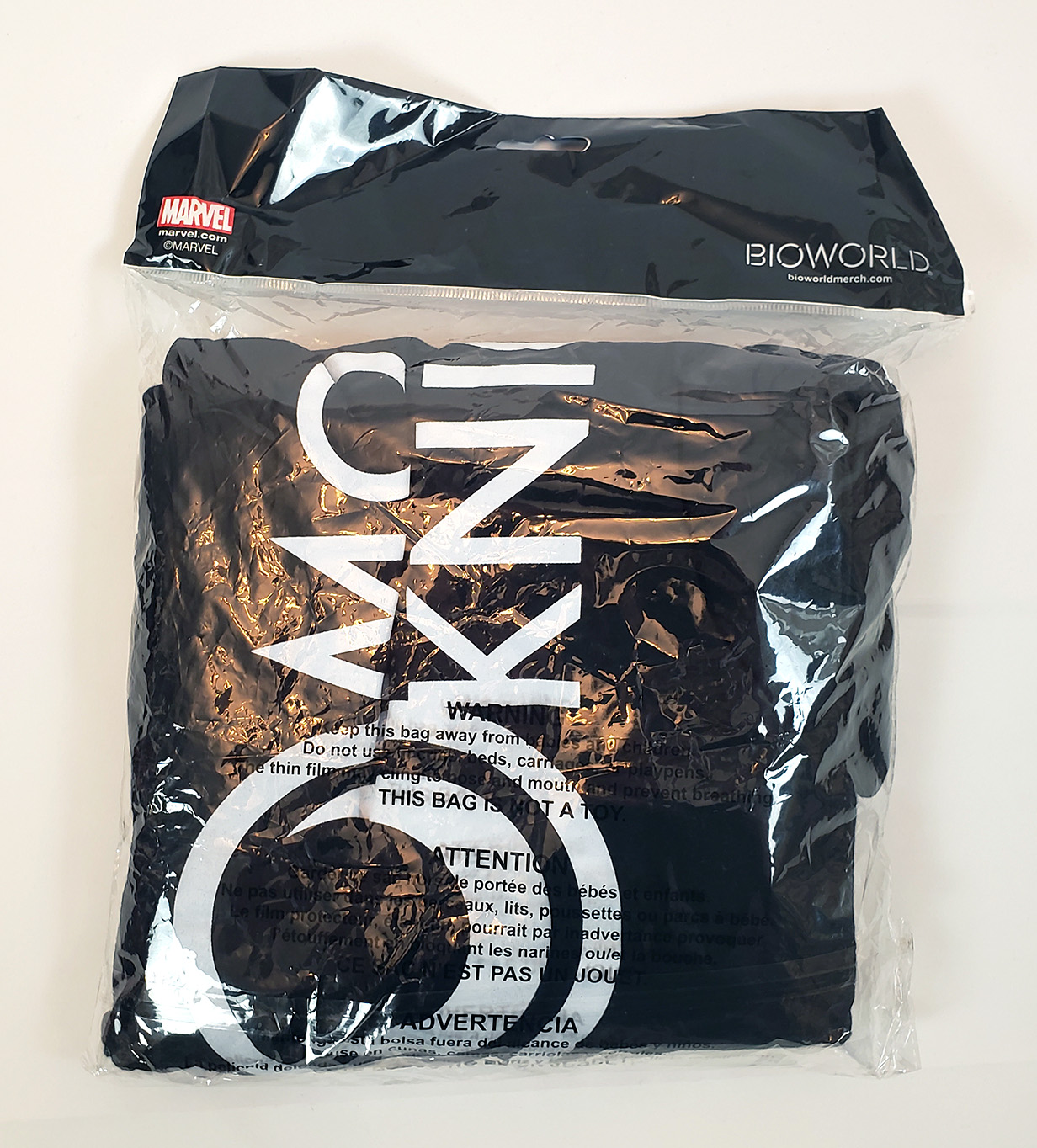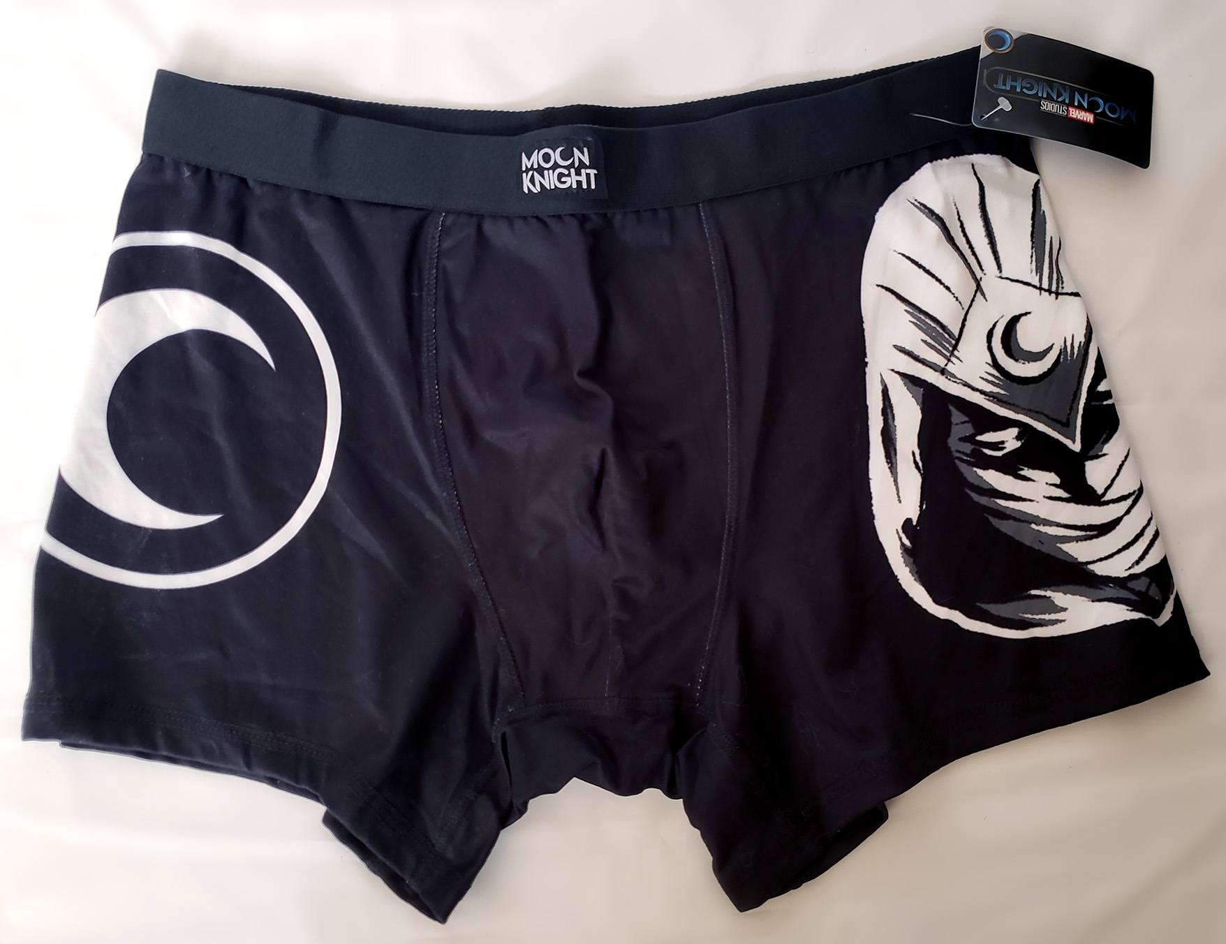 Bioworld Merchandising produced a pair of Moon Knight themed boxer briefs. They depict the MCU Moon Knight Head on the right side, and a crescent logo on the left side. They are made out of Polyester, and came in sizes Small - 3XL. An exact production date is not known, but as a tie in to the Disney+ Show, they were likely produced in 2022. Retail price was $14.99.