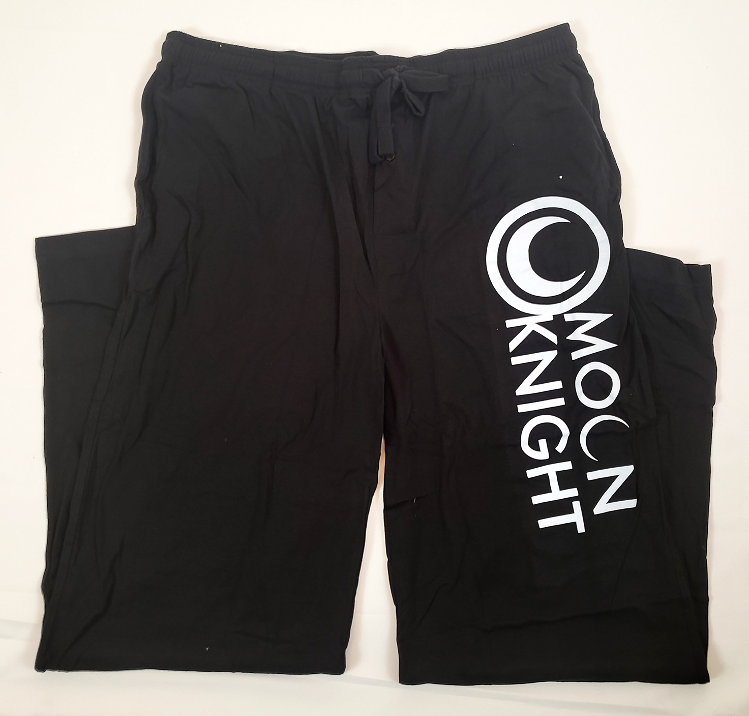 Bioworld Merchandising produced a pair of Moon Knight themed Pajama pants. They depict a crescent logo on the right side. They are made out of 100% Cotton. An exact production date is not known, but as a tie in to the Disney+ Show, they were likely produced in 2022. Retail price was $29.99.