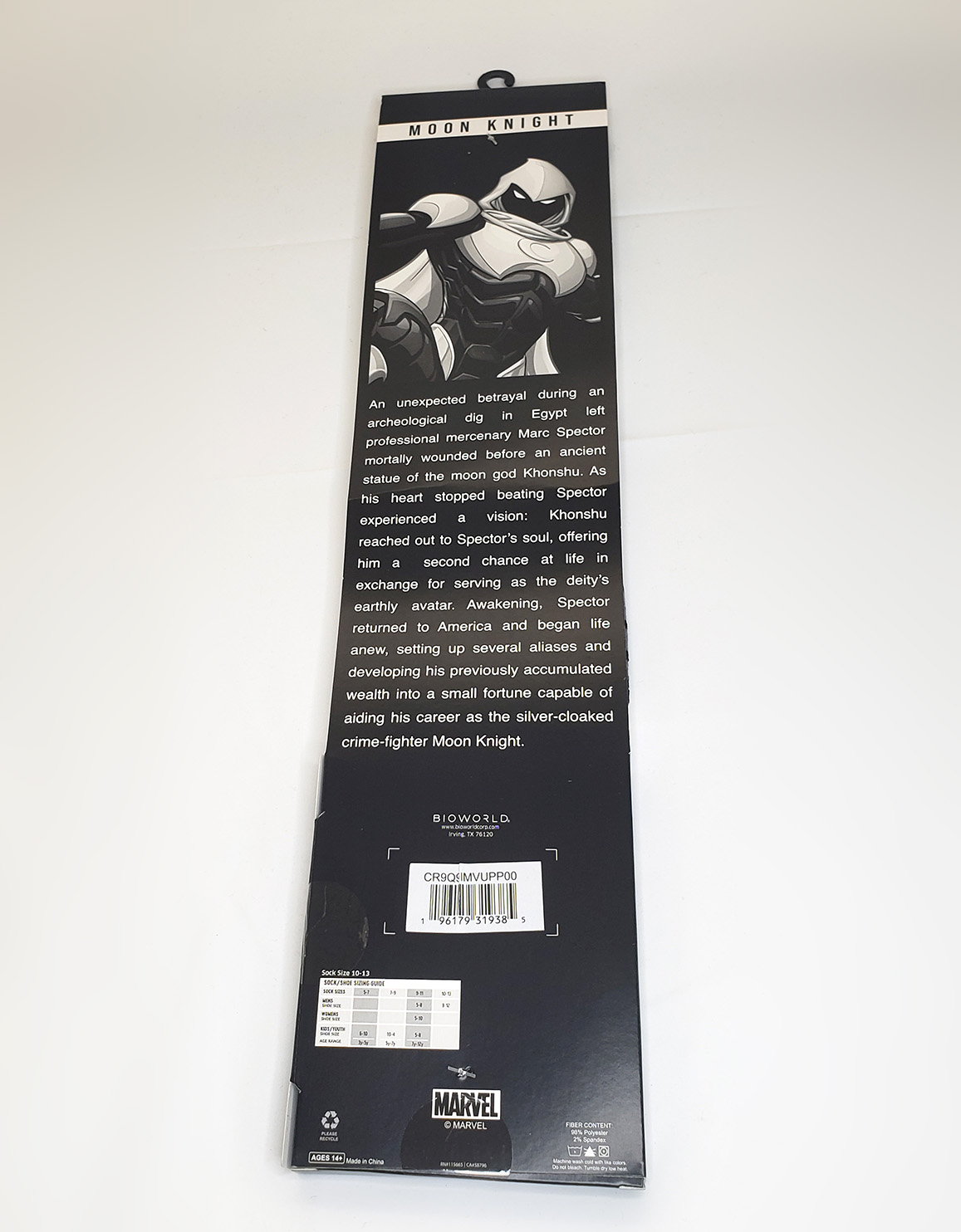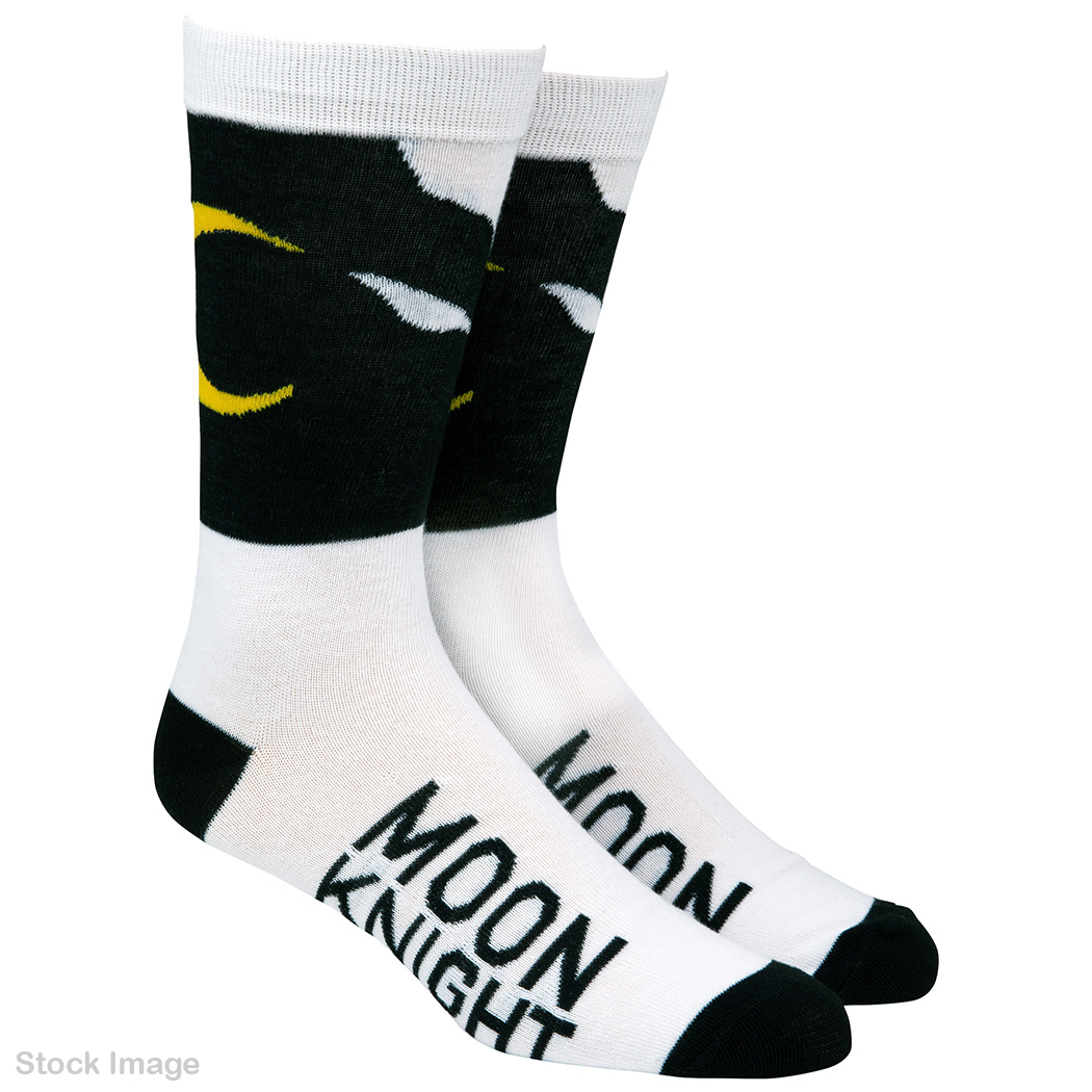Bioworld Merchandising produced a pair of Moon Knight themed socks. They depict a full body Moon Knight wearing an armored suit similar to the one introduced in the 2014 run. They are made of 98% polyester and 2% spandex, and fits shoe sizes 8-12. An exact production date is not known, but they were on sale as early as 2022. Retail price was $11.99.