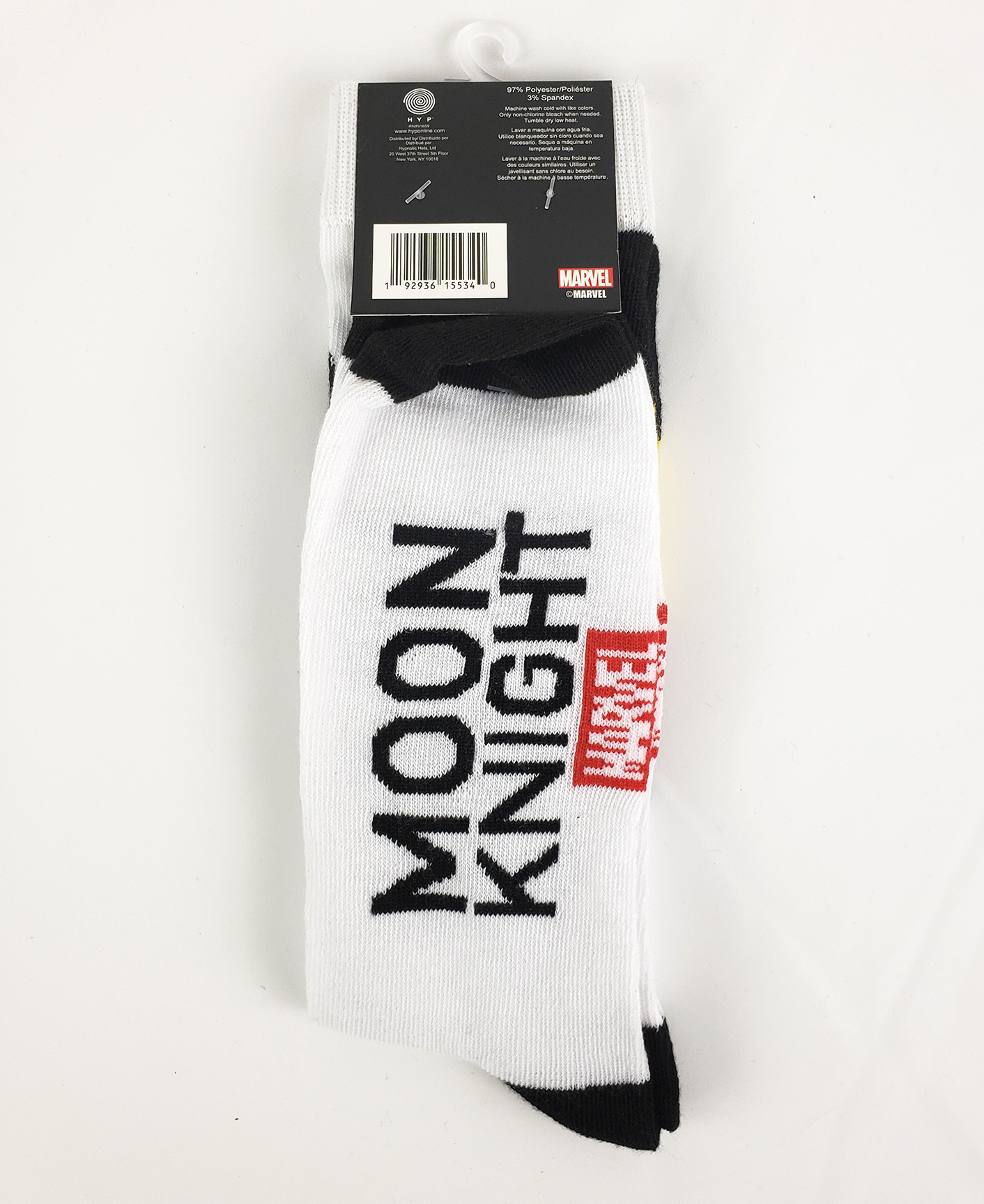 Hypnotic hats Ltd produced a pair of Moon Knight themed socks. As part of the Hyp line, these Moon Knight socks featured design elements from the cover of Moon Knight #1 (2014) by Declan Shalvey. They feature Mr Knights eyes, as well as the Moon Knight Logo. An exact date is not known, but they were on sale as early as 2021. Retail price was $9.99.