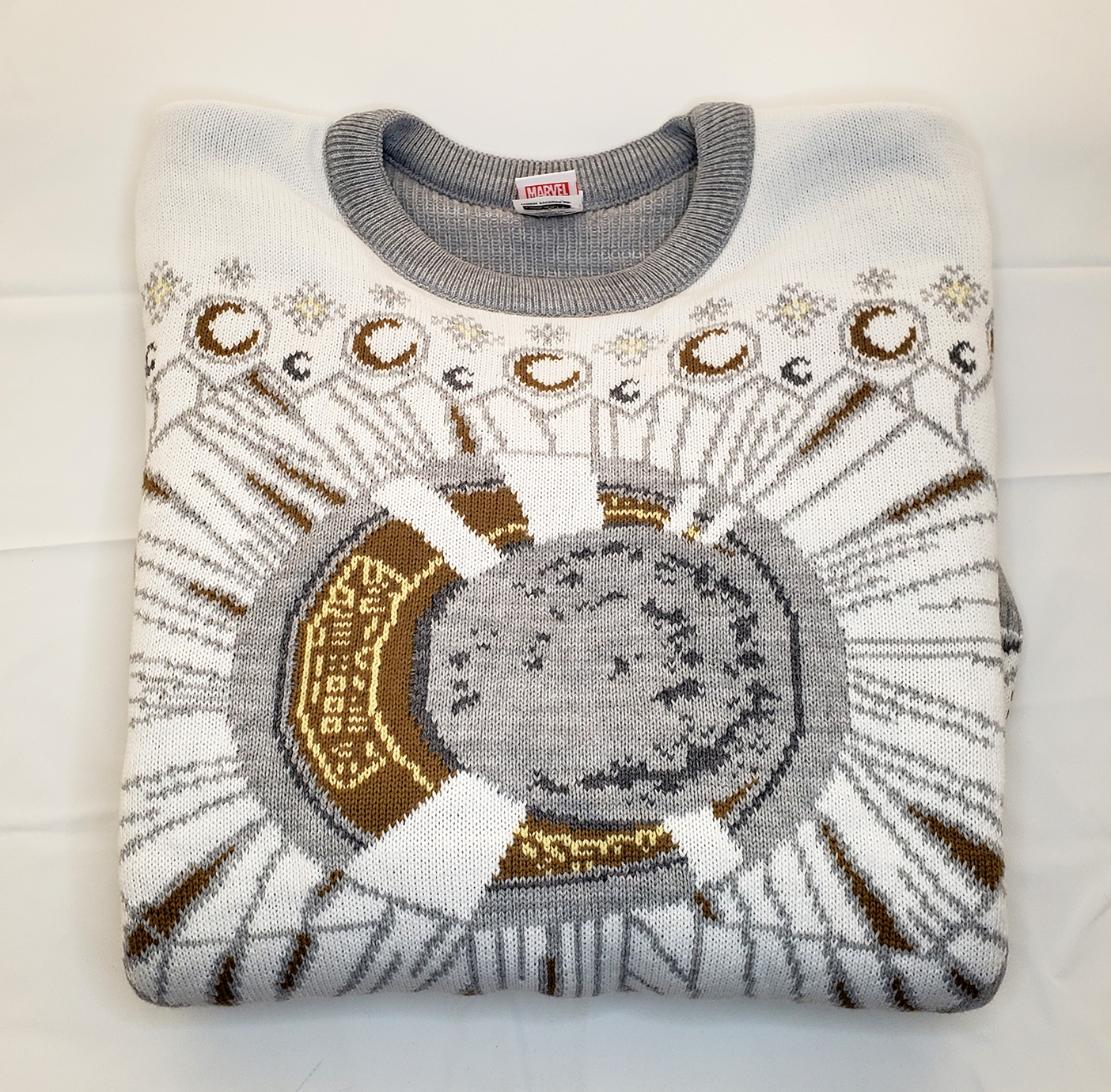 In 2022 Merchoid produced a series of Marvel themed "ugly" Holiday Sweaters. The Moon Knight sweater they produced is designed as a recreation of the MCU Outfit. It features predominantly white, Grey, and Gold yarn. These are factory knitted sweaters using 100% Acrylic yarn. Retail price was $69.99.