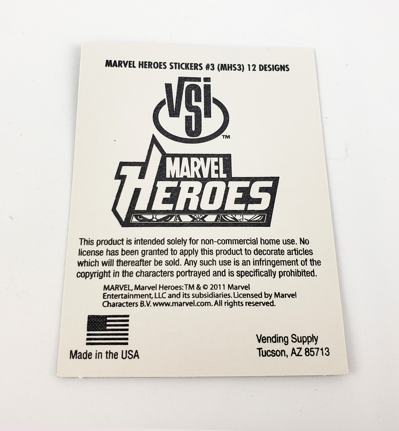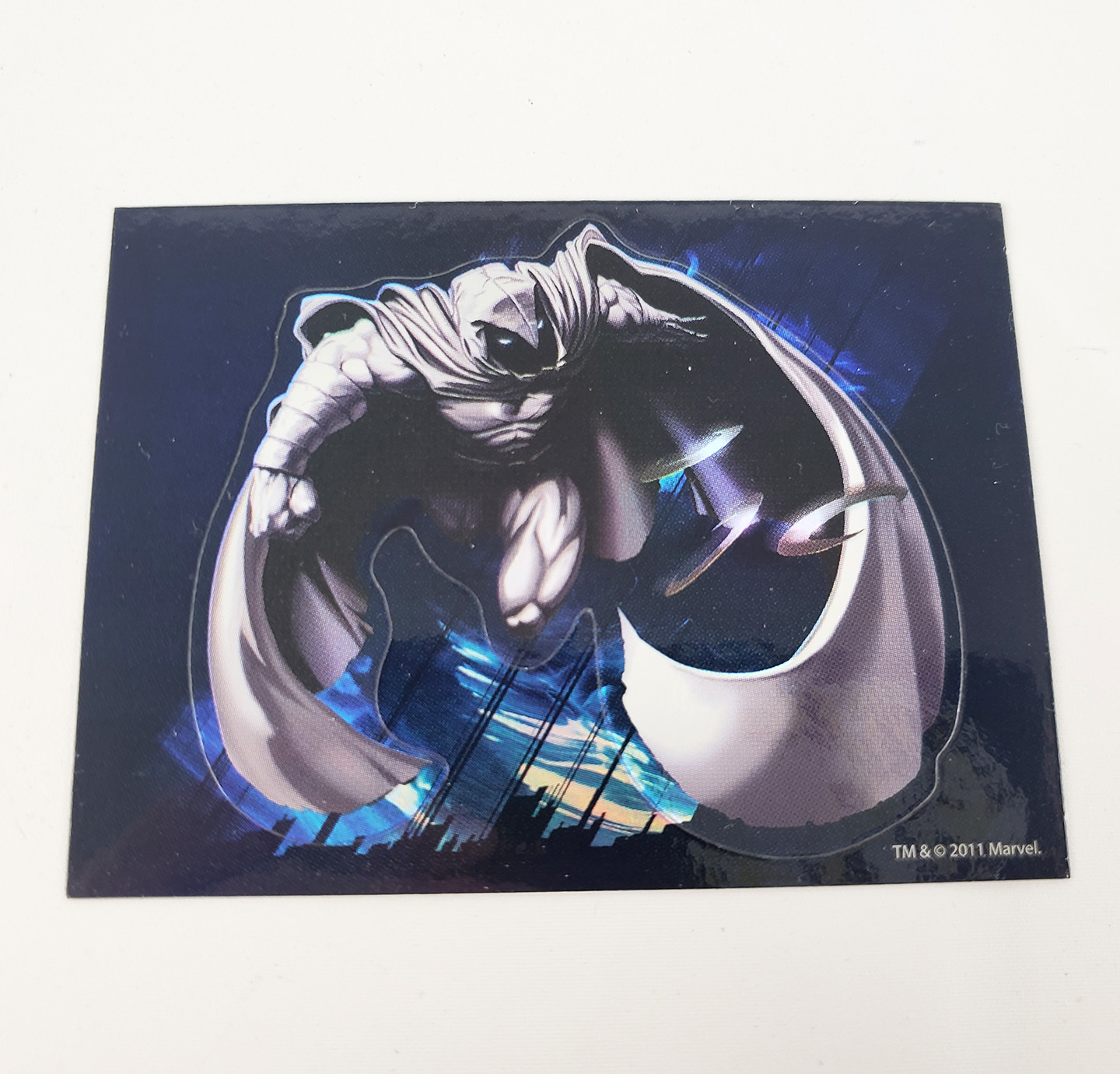 Moon Knight was featured in the 2011 series of Marvel Heroes Stickers from Vending Supply. These were supplied in the coin vending machines. Labeled as #3, as part of 12 designs, this sticker sports a chrome style reflective print job which recreates the cover of the 2006 Moon Knight series with art influenced by David Finch.