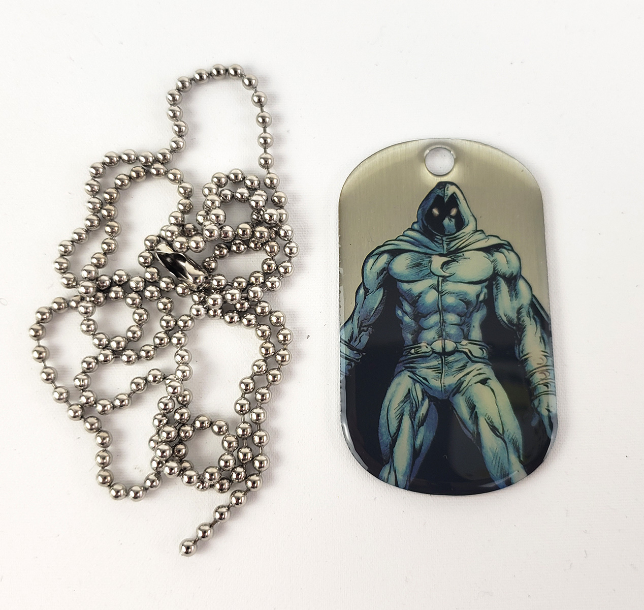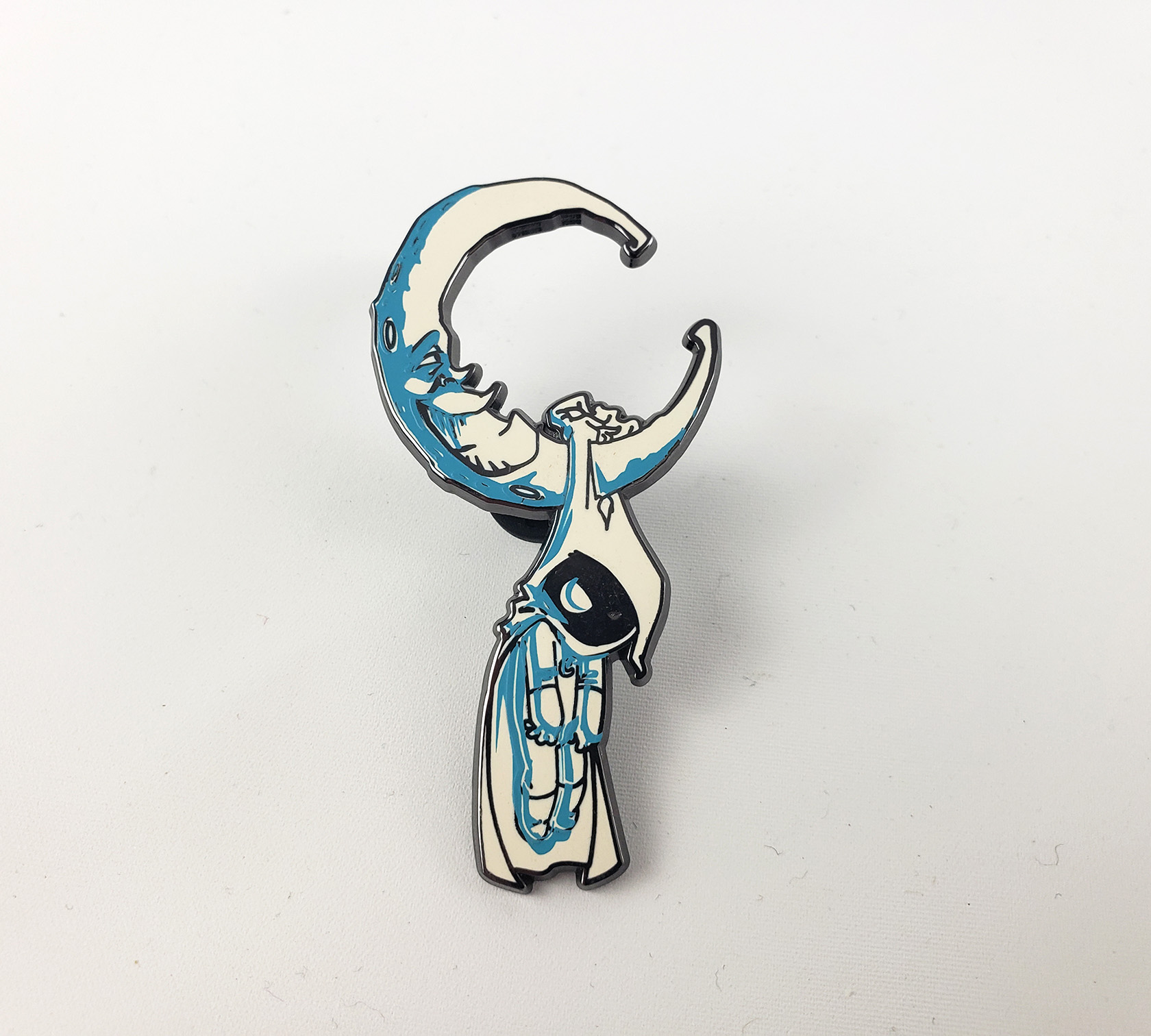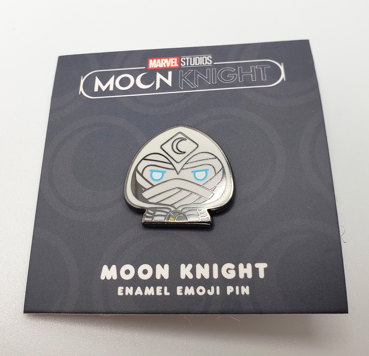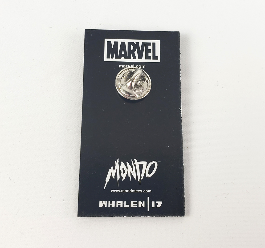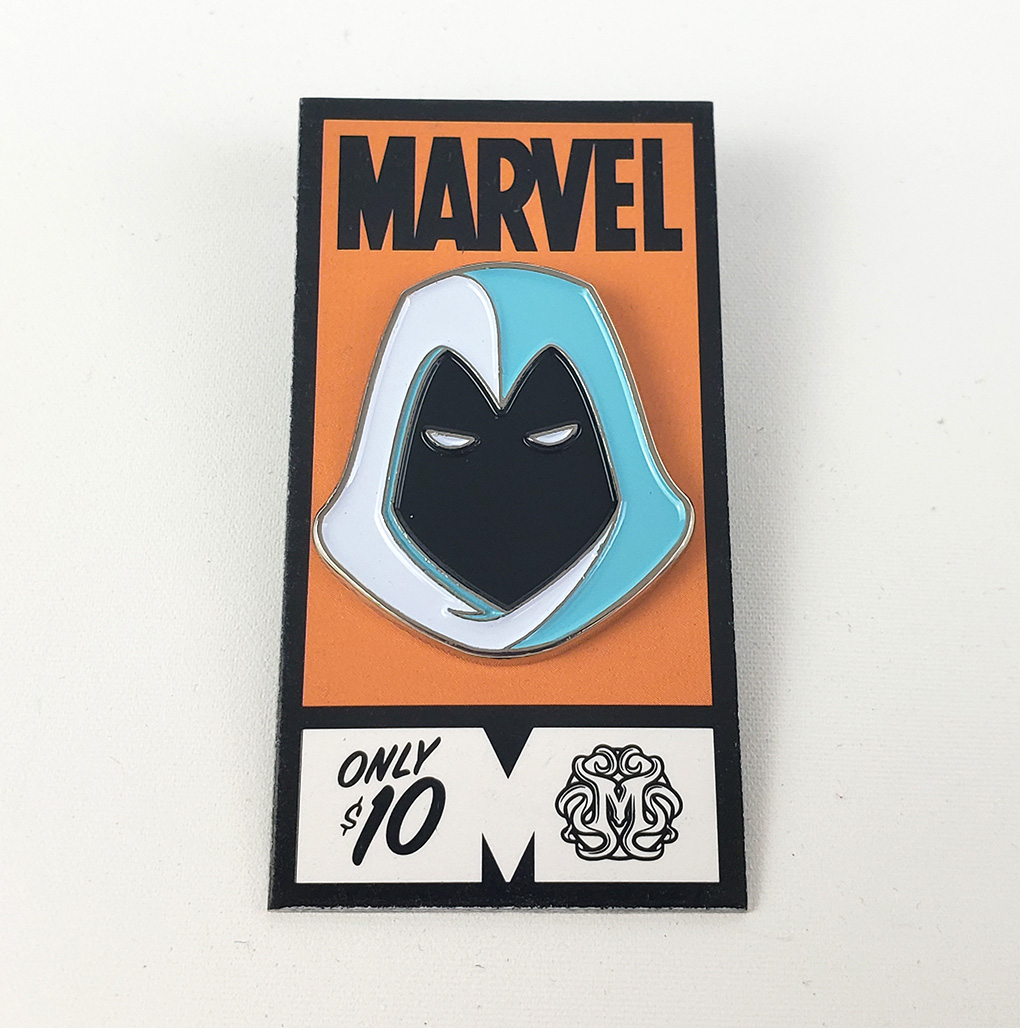 In 2017, Mondotees released a Moon Knight enamel pin as part of a set that also included Ghost Rider. Its 1.14 inches in size and was designed by Tom Whalen. It is described on the site as "Double-post on shiny silver nickel with butterfly clutch backings." It's a particularly great pin, and even its packaging is designed to make it look like a classic corner box.