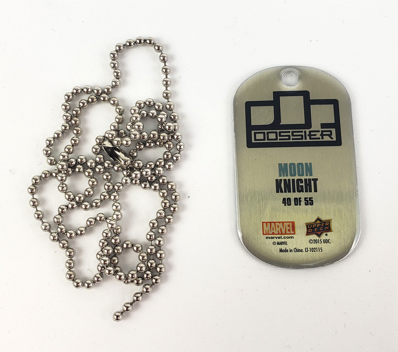 In 2015, Upper Deck produced a collectible card line called Marvel Dossier. The set featured 3 cards and 1 dog tag for each of the 55 included characters. They were sold in bags featuring 3 random cards and 1 random dog tag set. Moon Knight was #40. It features art from artist Mark Texeira.