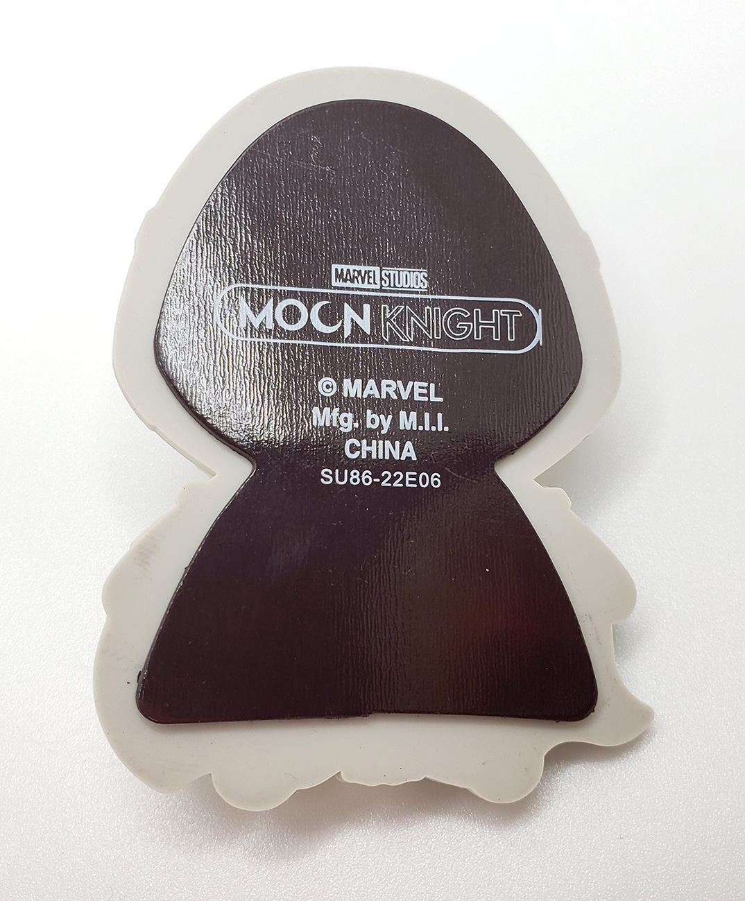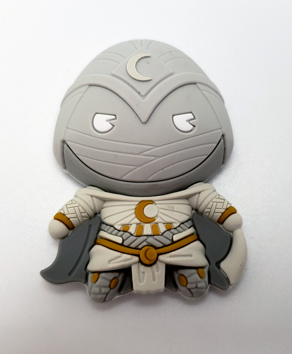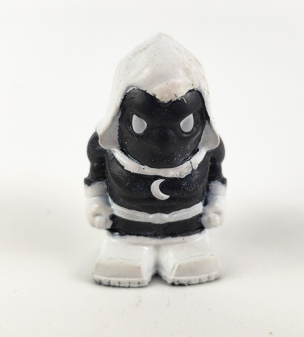 In 2017, Imports Dragon began releasing Marvel themed pencil toppers called Ooshies. Moon Knight was included as part of series 2, and could only be acquired by purchasing blind bags. They are small, rubber and haphazardly painted.