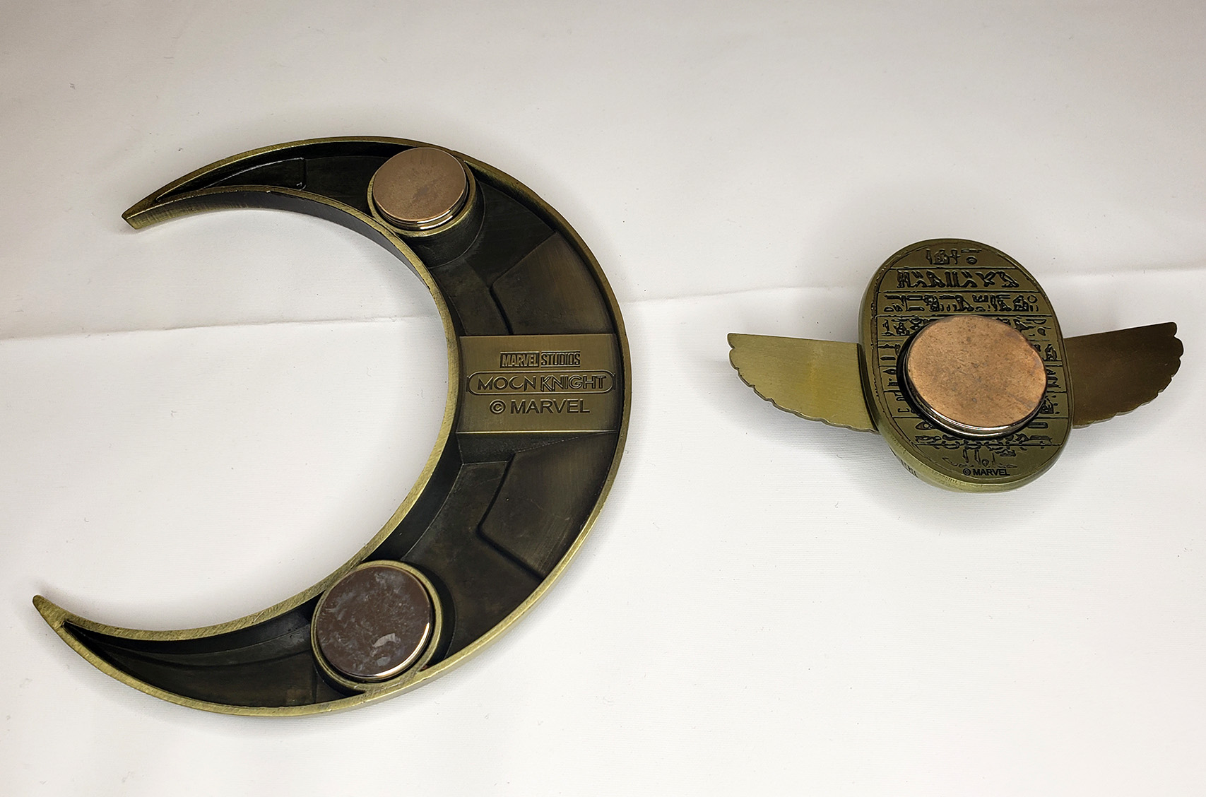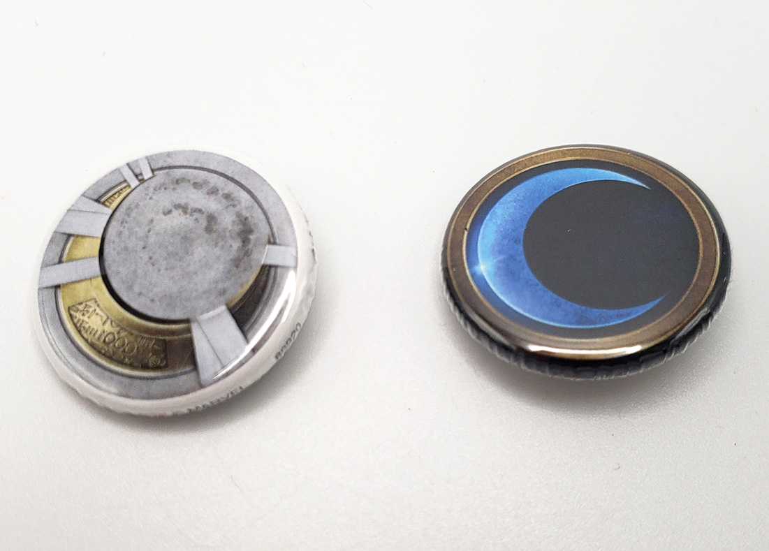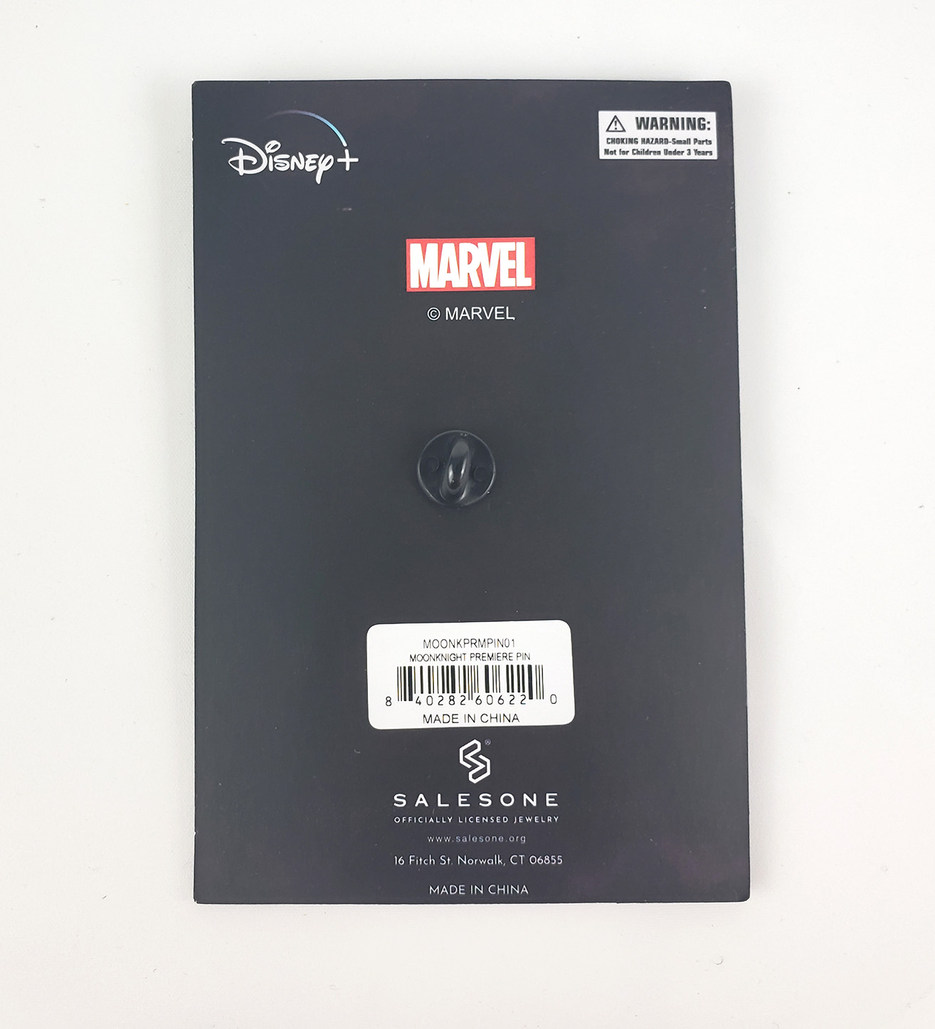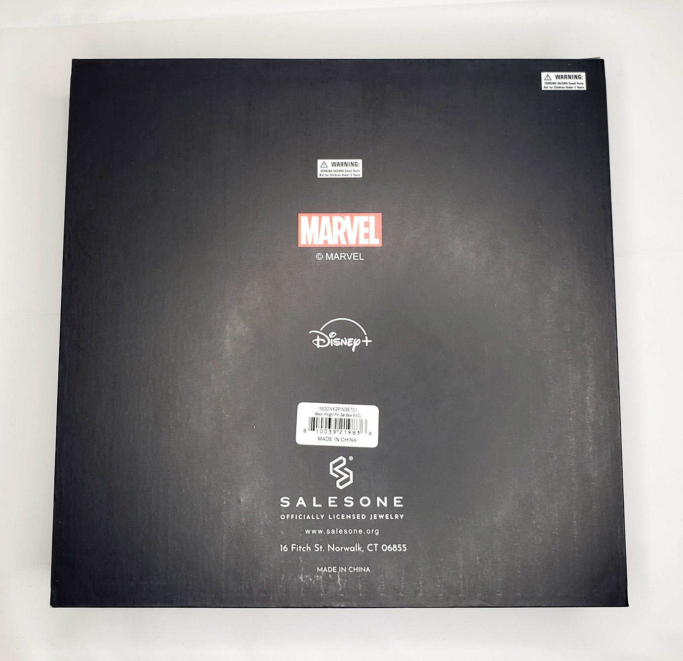 In 2022, Salesone released a 2-pin box set themed after the Disney Plus Moon Knight Show. It contains two large metal pins. The first is a Crescent Blade replica. The second is a Scarab compass complete with moving wings. These Magnets feature additional metal plates to allow them to be worn on clothing as jewelry/accessories. A great addition to a cosplay costume. It was a Gamestop exclusive limited to 10,000 pieces and shipped in a high quality collector box complete with a numbered certificate. These are solid metal and have notable weight to them. The box originally retailed for $75.00.
