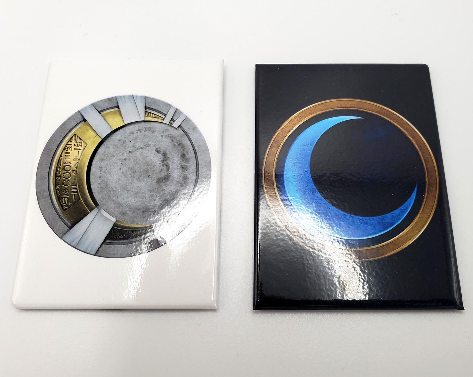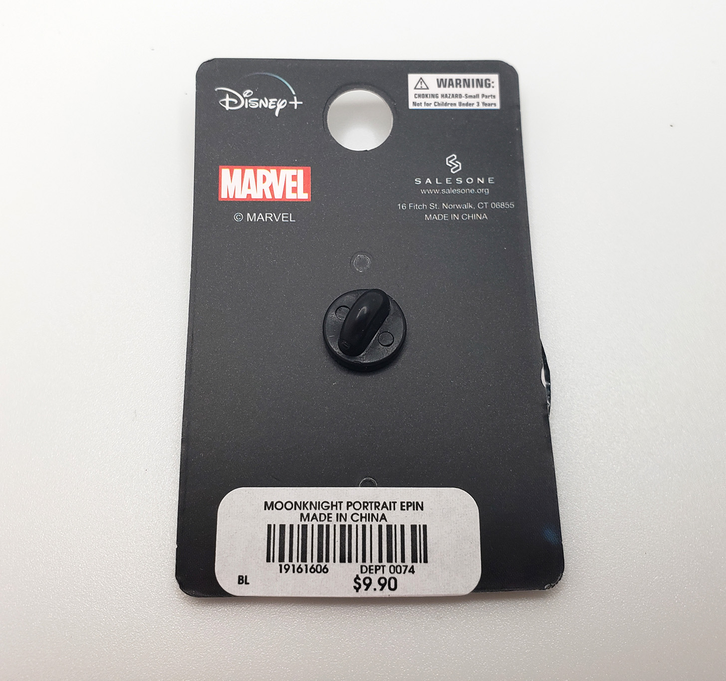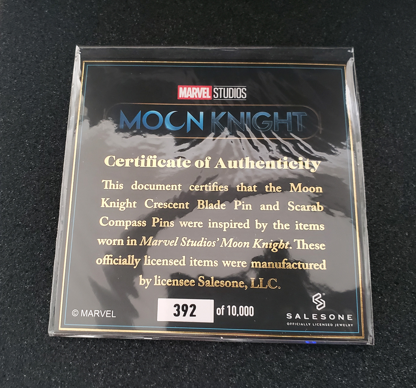 In 2022, Salesone released a 2-pin box set themed after the Disney Plus Moon Knight Show. It contains two large metal pins. The first is a Crescent Blade replica. The second is a Scarab compass complete with moving wings. These Magnets feature additional metal plates to allow them to be worn on clothing as jewelry/accessories. A great addition to a cosplay costume. It was a Gamestop exclusive limited to 10,000 pieces and shipped in a high quality collector box complete with a numbered certificate. These are solid metal and have notable weight to them. The box originally retailed for $75.00.