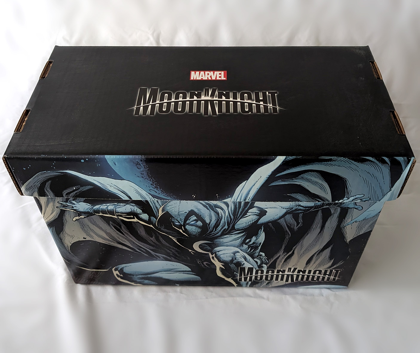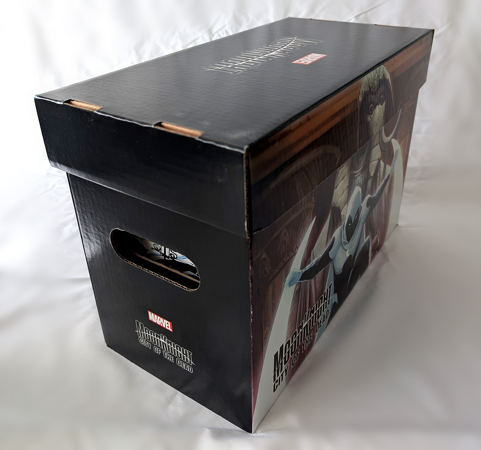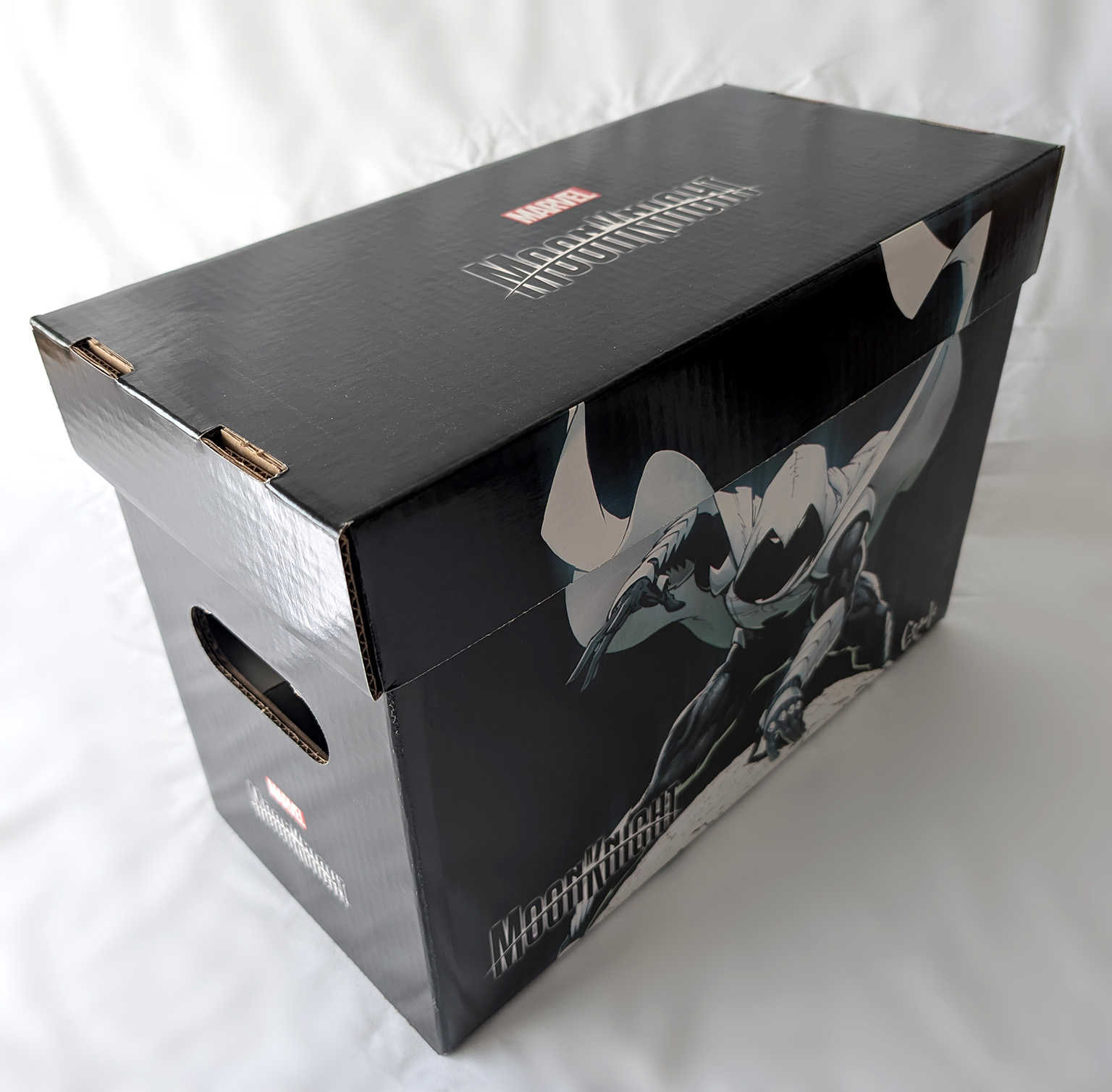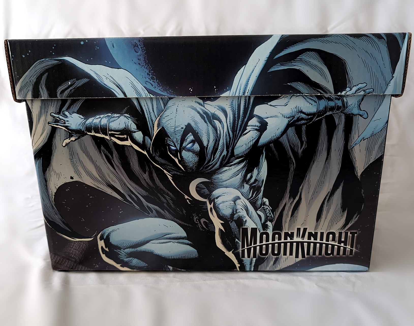 In 2023, Marvel produced a bunch of comic boxes with art prints on them. Two were produced that had Moon Knight themes. The first in July of 2023, and the second in December of 2023. The first was a predominantly black box with a City of the Dead image on one side, and a regular Moon Knight image on the other. The Second was also a predominantly black box with art from different Moon Knight covers on each side. They both featured the current Moon Knight logo on the lid. These are standard small comic box size (15-1/2" X 7-5/8" X 10-7/8"). They would come unfolded, but most shops would build them up before selling them. They were sold in bundles of 5 for $60, meaning most shops sold them for around $12 a piece.