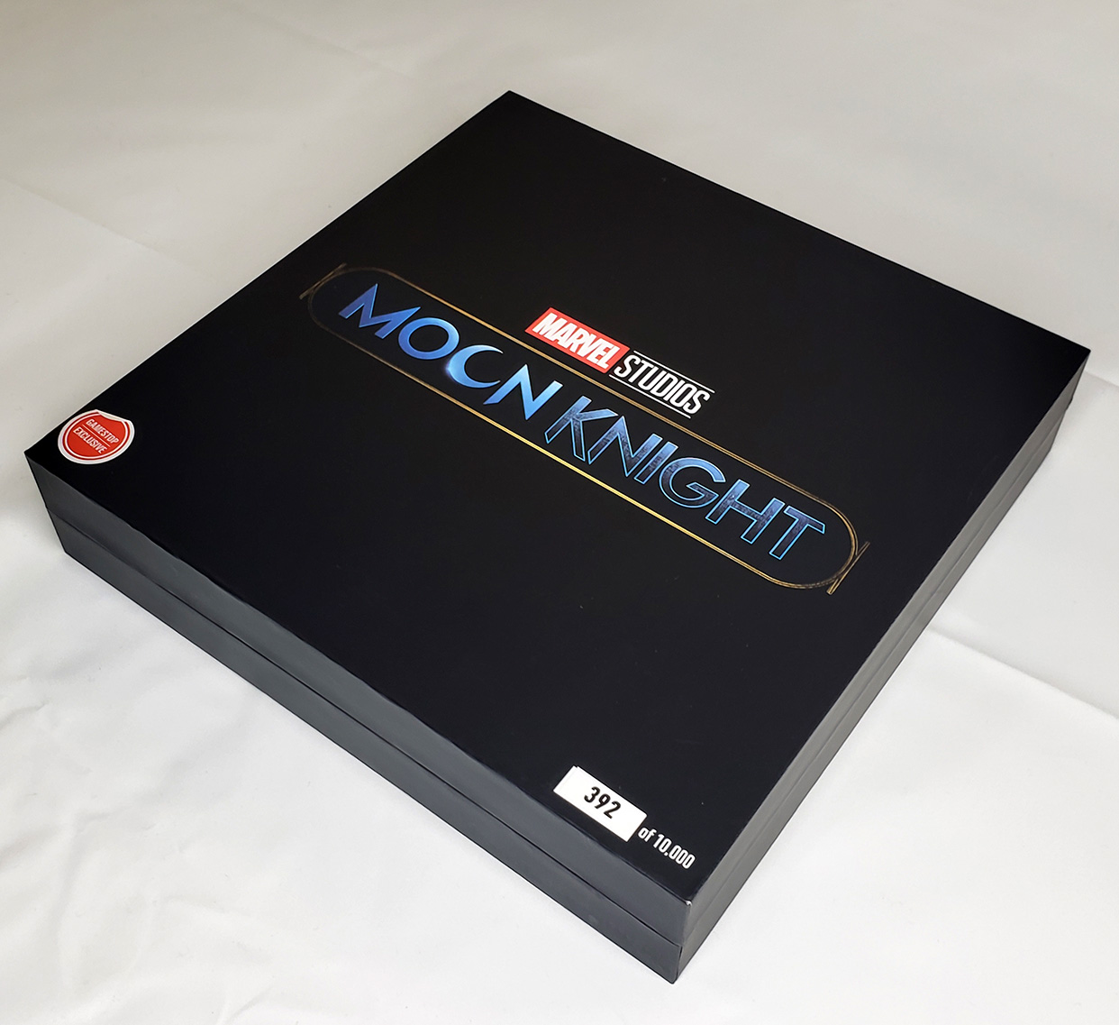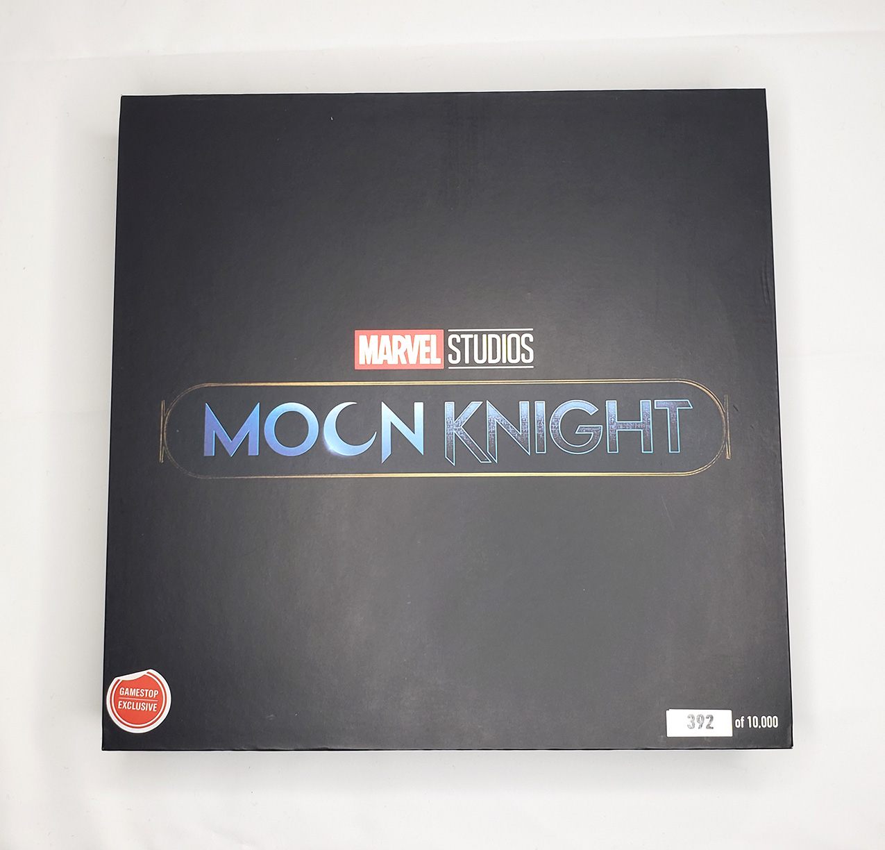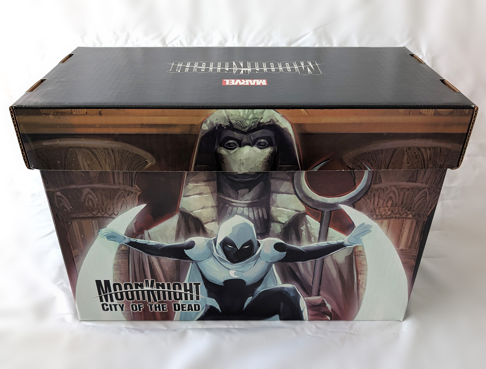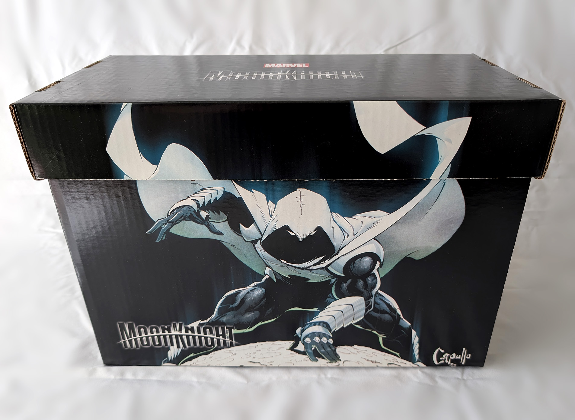 In 2023, Marvel produced a bunch of comic boxes with art prints on them. Two were produced that had Moon Knight themes. The first in July of 2023, and the second in December of 2023. The first was a predominantly black box with a City of the Dead image on one side, and a regular Moon Knight image on the other. The Second was also a predominantly black box with art from different Moon Knight covers on each side. They both featured the current Moon Knight logo on the lid. These are standard small comic box size (15-1/2" X 7-5/8" X 10-7/8"). They would come unfolded, but most shops would build them up before selling them. They were sold in bundles of 5 for $60, meaning most shops sold them for around $12 a piece.