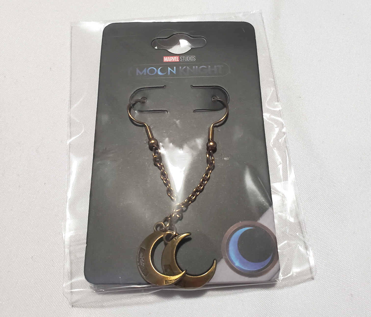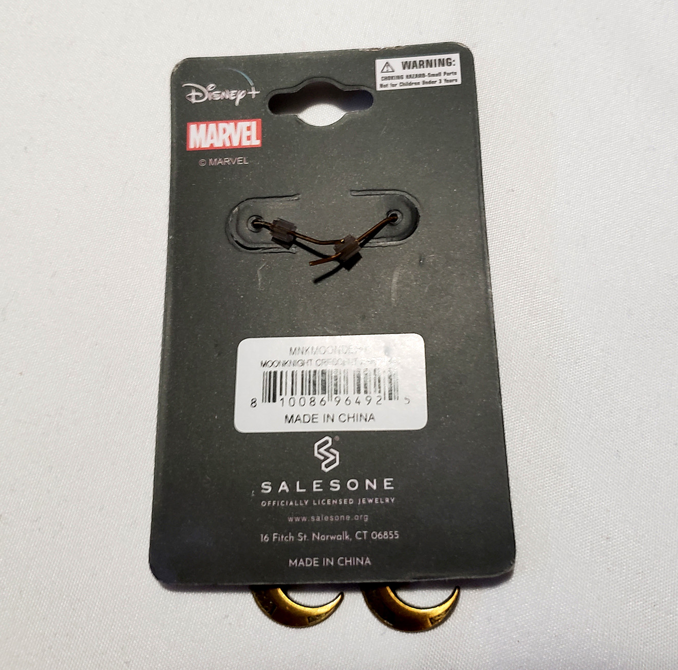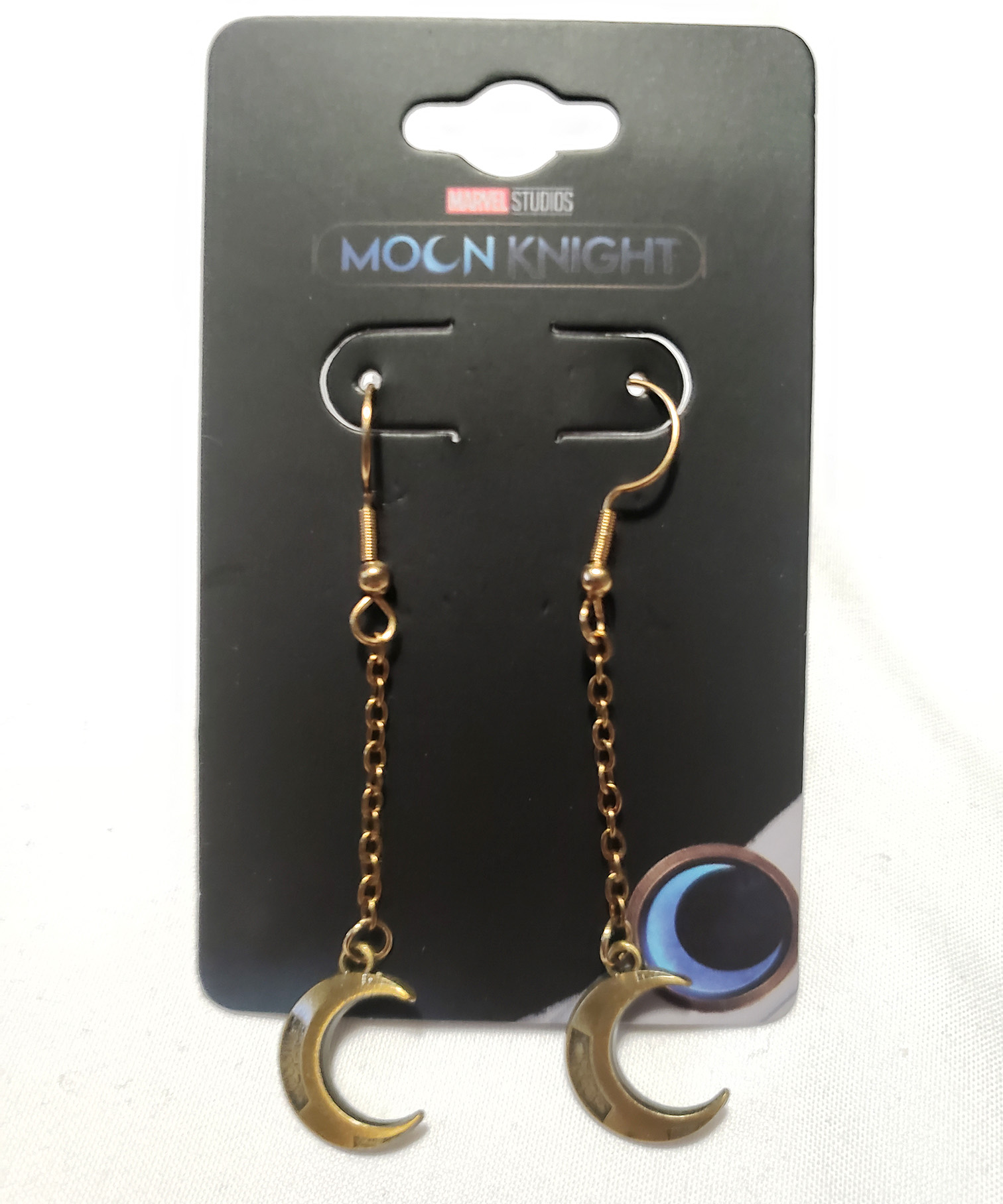 In 2022 Salesone produced multiple peices of jewelry to coincide with the release of the Disney+ Moon Knight Show. One of the items they produced were these earrings. They depict Bronze/Gold colored Crescent Moons similar to the ones Moon Knight has on his chest and uses as weapons. They are made of 316L Steel. The earings retailed for $18.00.