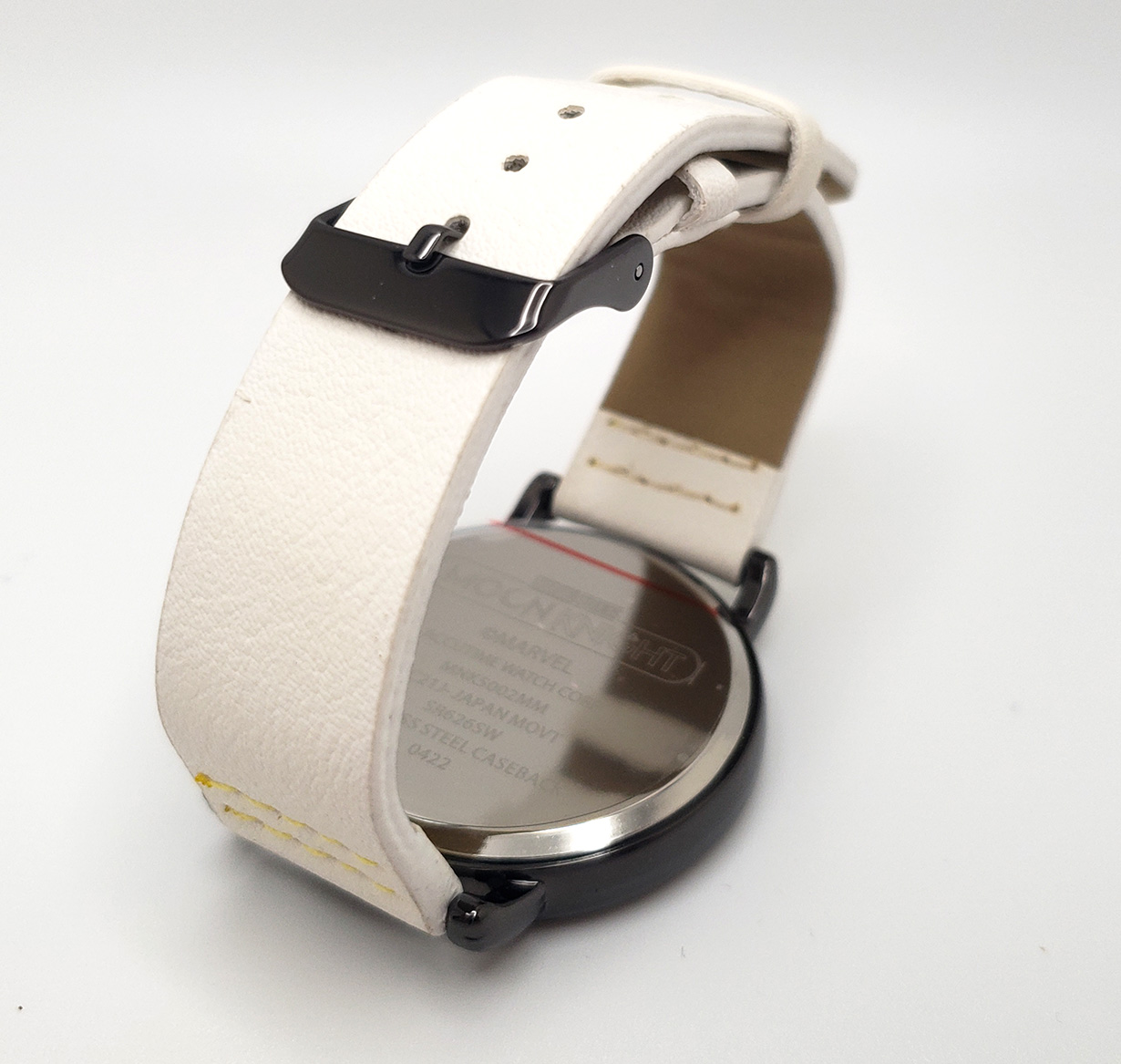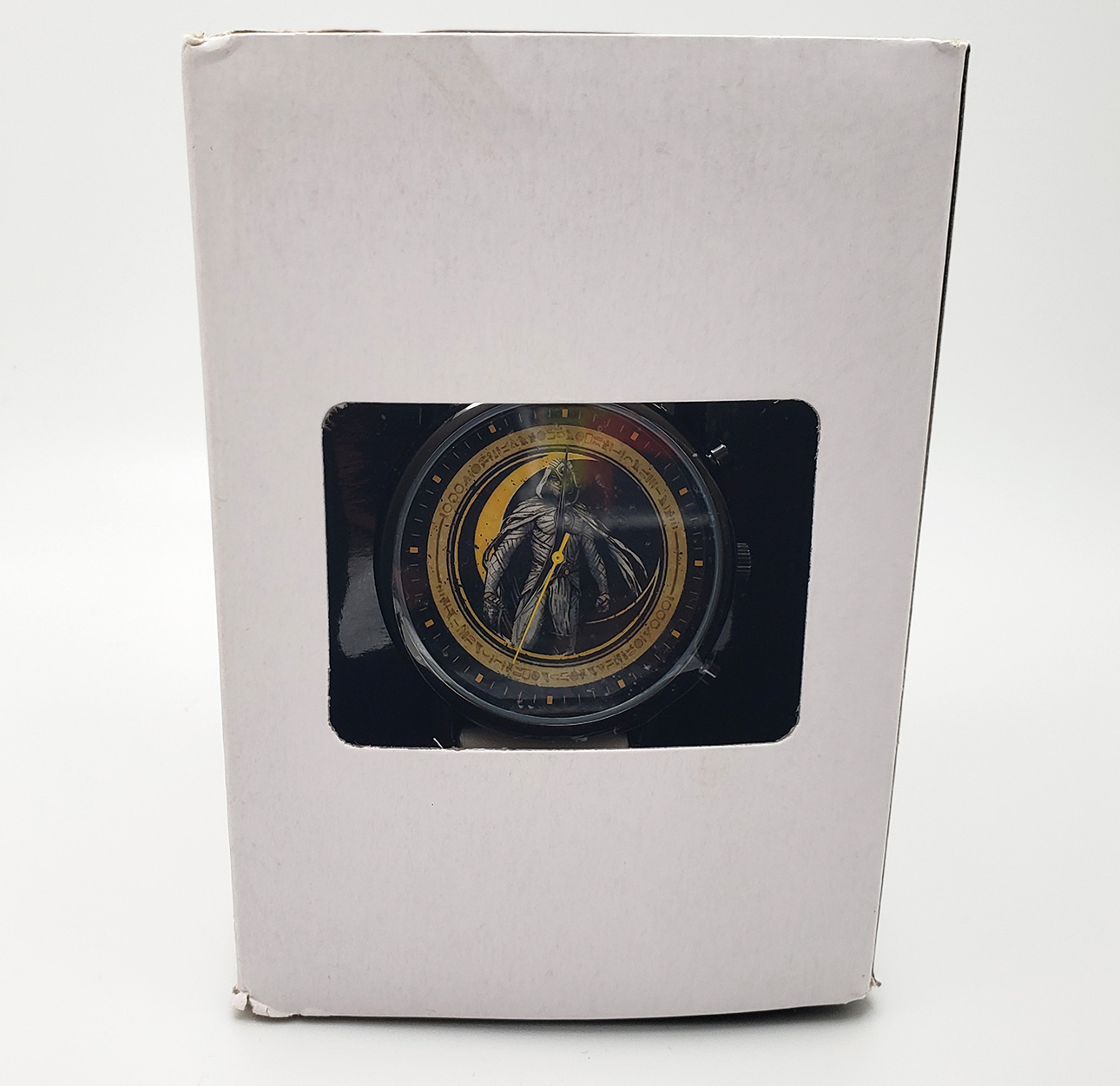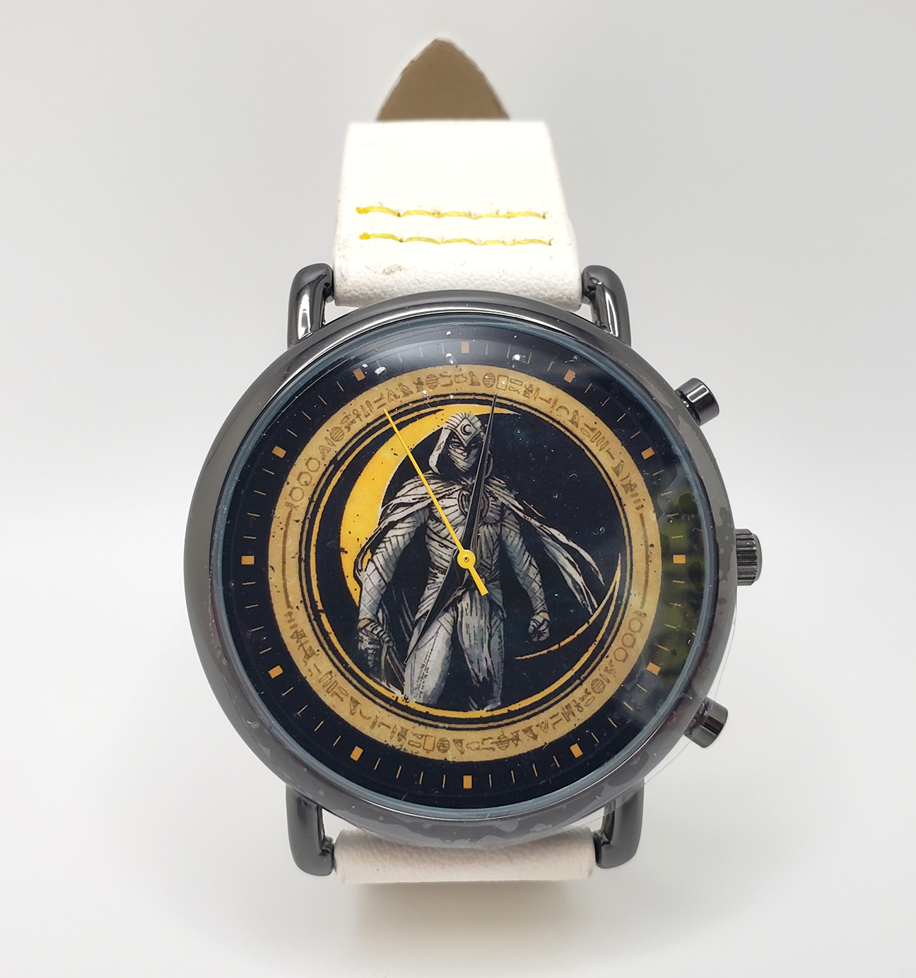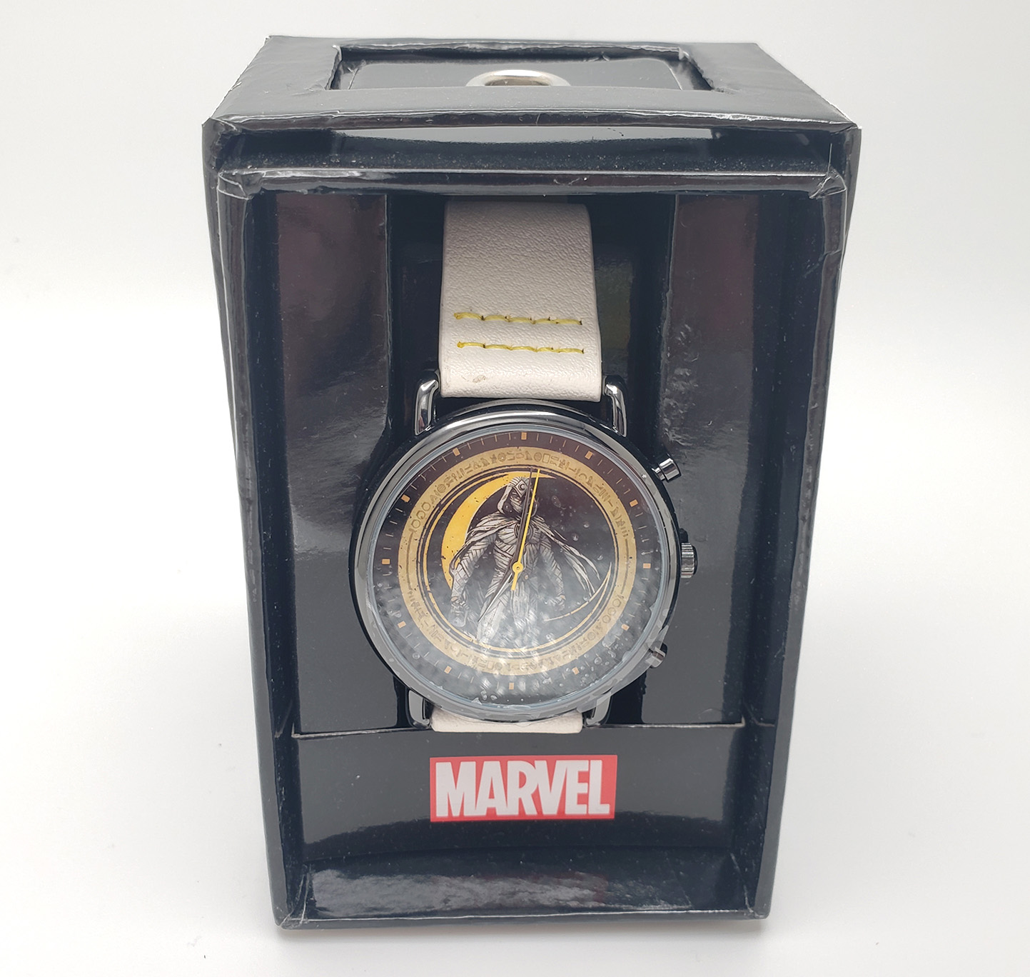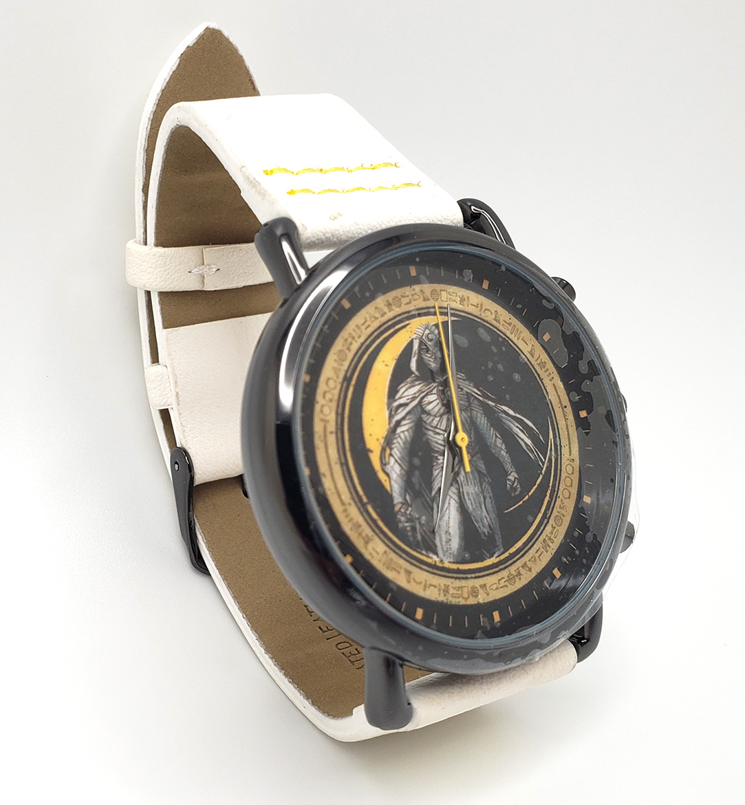 Accutime produces numerous watches for various liscences, of which Marvel is one. In 2022 they released a Moon Knight themed watch to coinside with the release of the Disney+ Show. Its a round, analogue Quartz watch with a glass face and 3 hands. The wristband is a white vegan leather. The face depicts Moon Knight in his MCU outift. The watch released for $34.99.