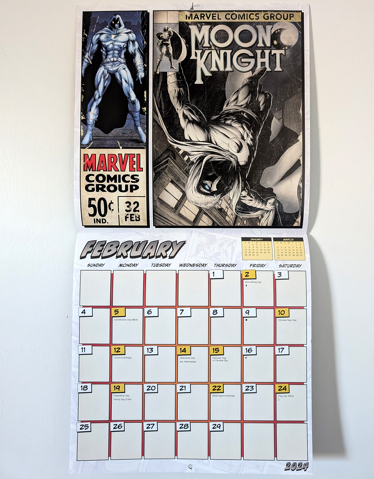 In 2023, Dateworks released a 16 month Marvel themed calendar for the 2024 year (including 4 additional months for overlap). Moon Knight was chosen to represent February, and was also featured on the cover image. Each month featured a comic cover from each character as well as a mock up of vintage corner box art. In this case the Corner art was a classic Mark Texiera peice from the 2006 series. The cover was one of the variants from issue #194. The fake issue number I assume is an homage to his first appearance in Werewolf By Night 32. It retailed for $17.99.