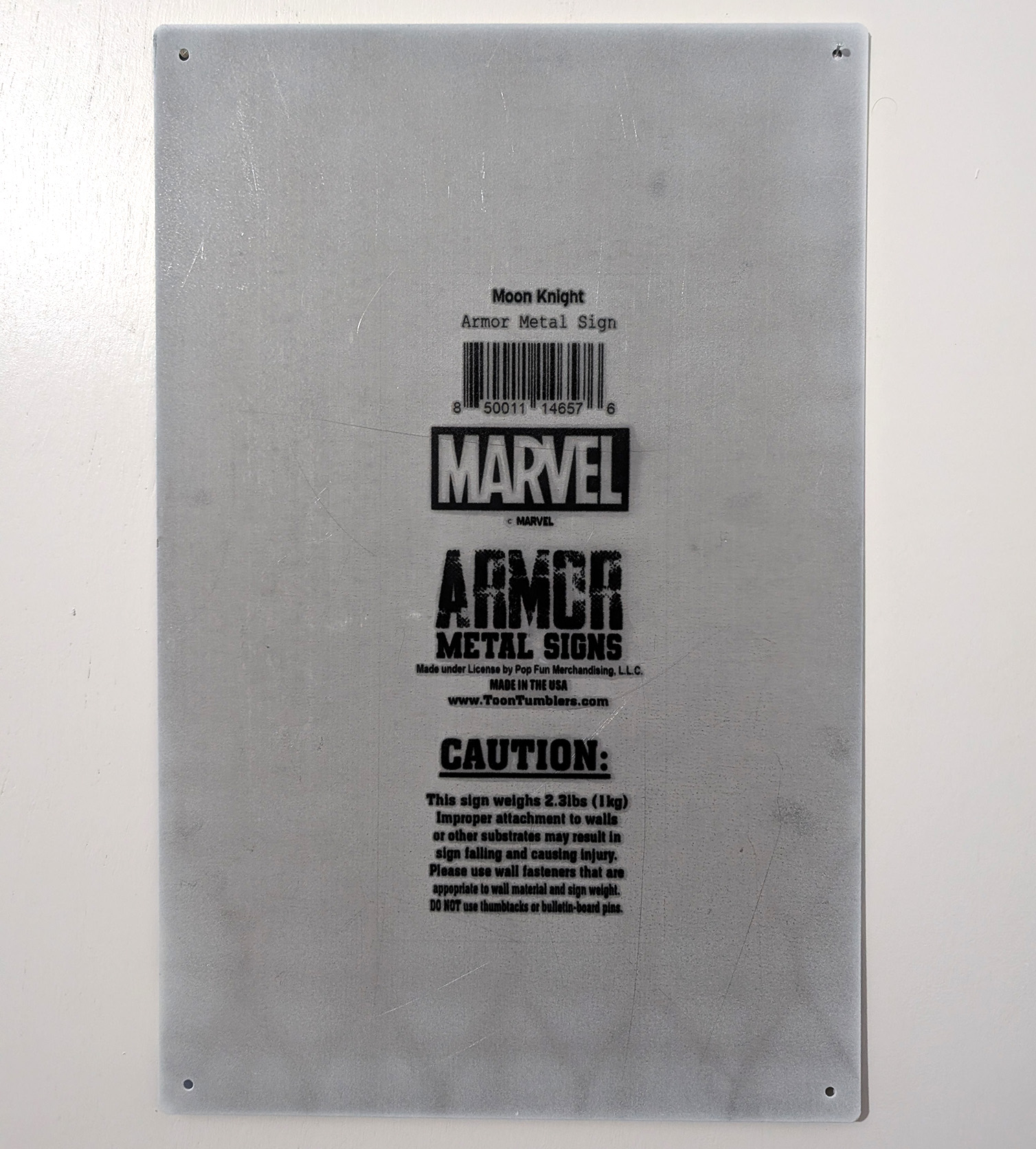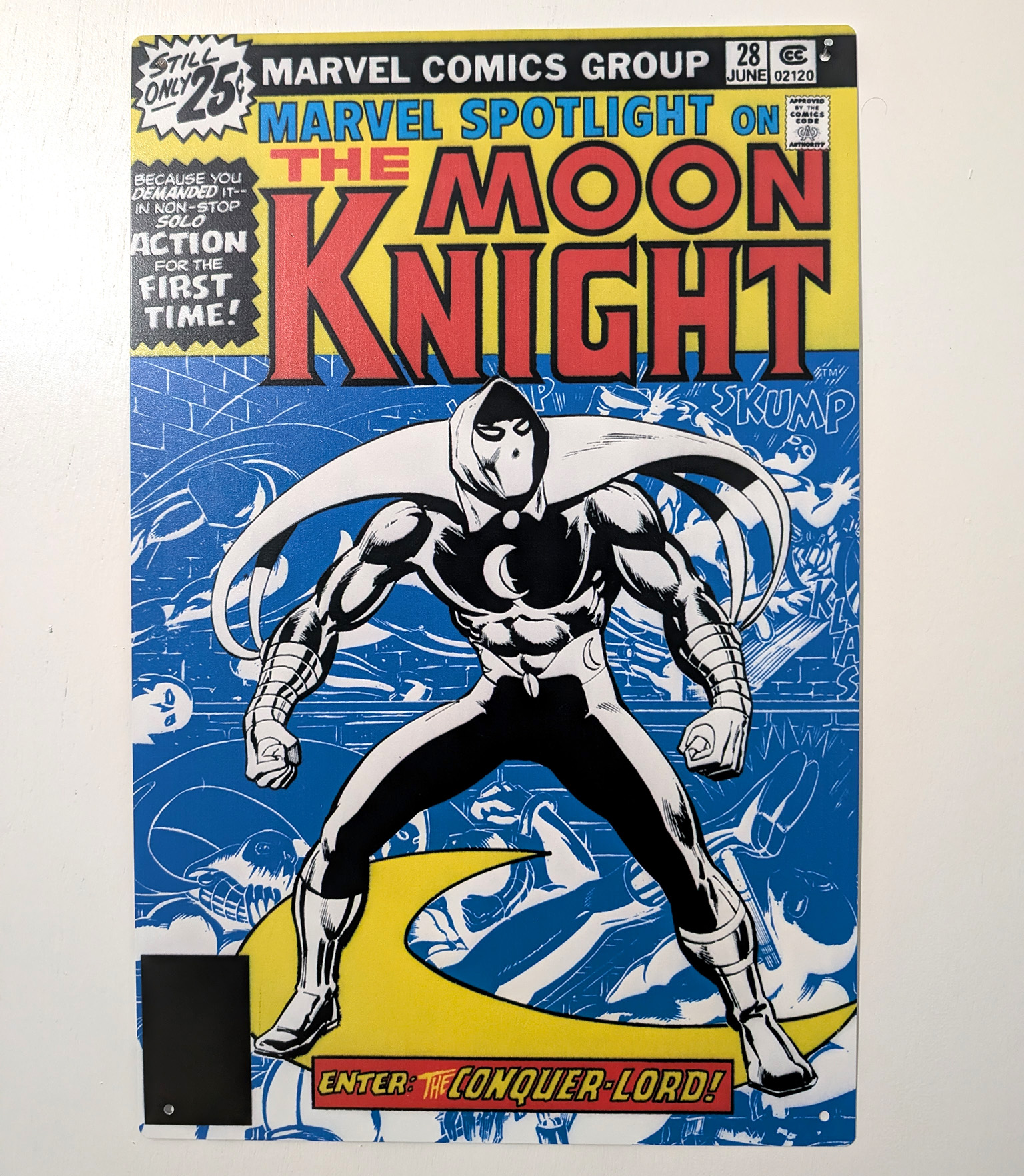 In the Summer of 2024, Pop Fun Merchandising released an Armor Metal Sign featuring art from Marvel Spotlight #28, Moon Knights first Solo story. The sign measures 16x12 inches and weighs 2.3 lbs. It is made of heavy duty metal. The originally retailed for $29.99.