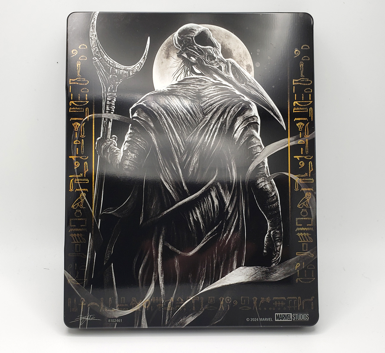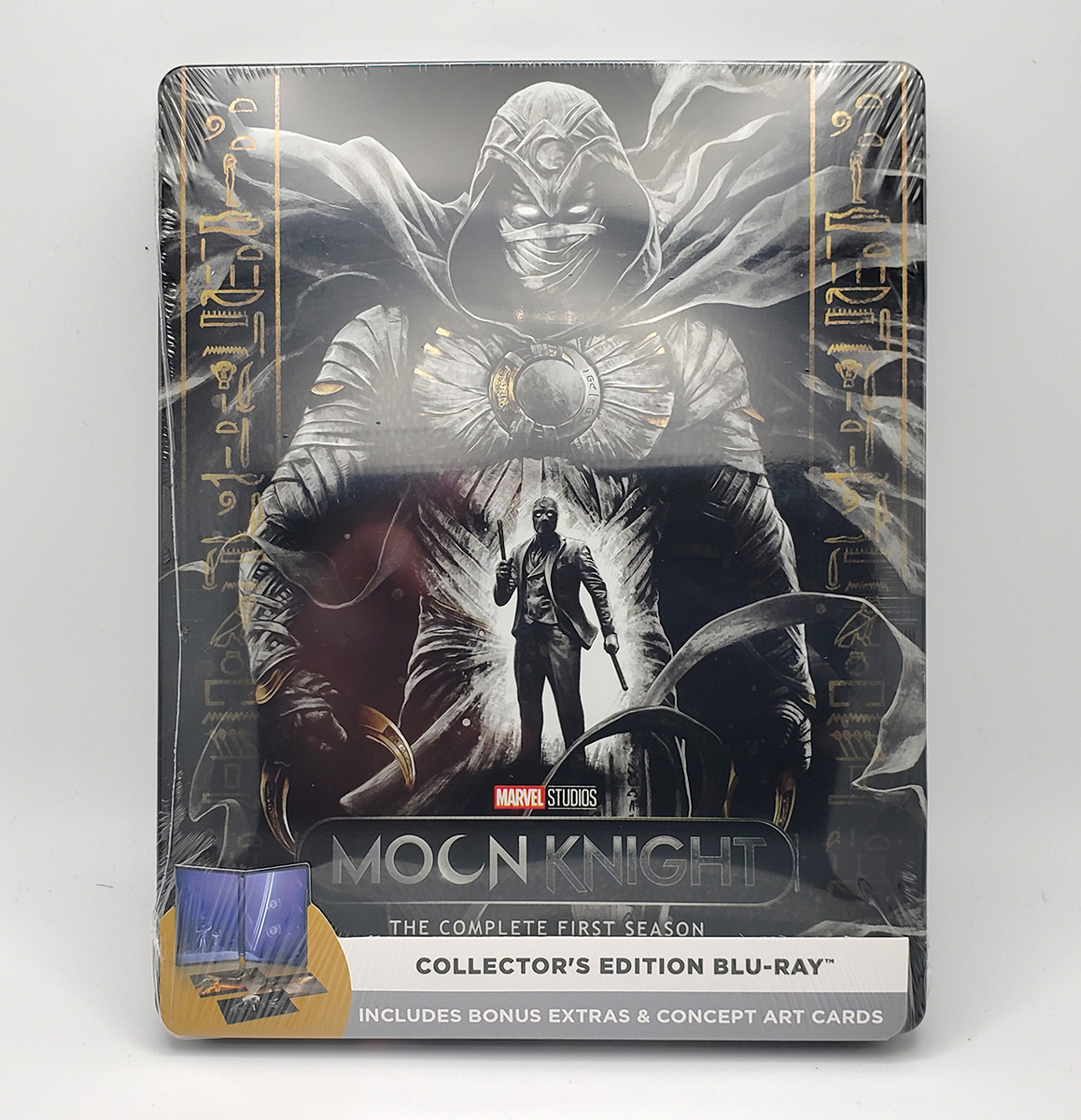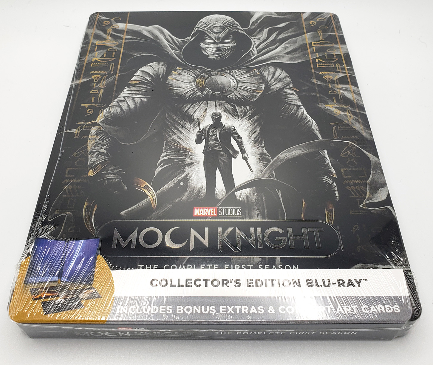 In 2024, the Disney Plus Moon Knight show was officially released on physical media with a limited edition Steelbook. 2 Editions were produced, a regular Blu-Ray Edition, and a 4K Ultra Edition. The show came on 2 discs. Bonus features included in the set are: A Gag Reel, Deleted Scenes, An Egyptology featurette, and "Assembled: The Making of Moon Knight" featurette. The collection also came bundled with a set of sealed art cards. The both editions are presented as region free at their formats maximum resolution, 1080p and 2160p respectively. The standard Blu-Ray collection was listed for $48.49. The 4k Ultra edition was listed at $85.99.