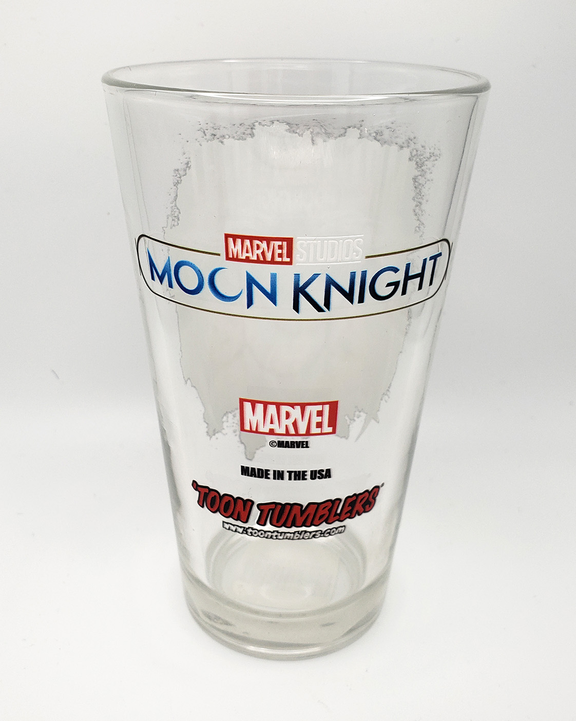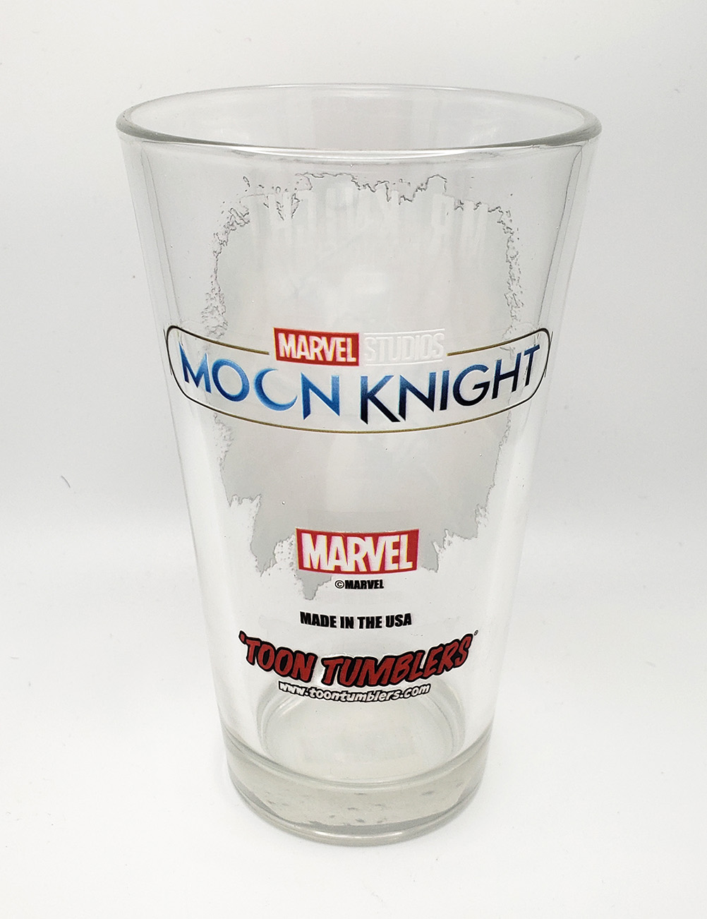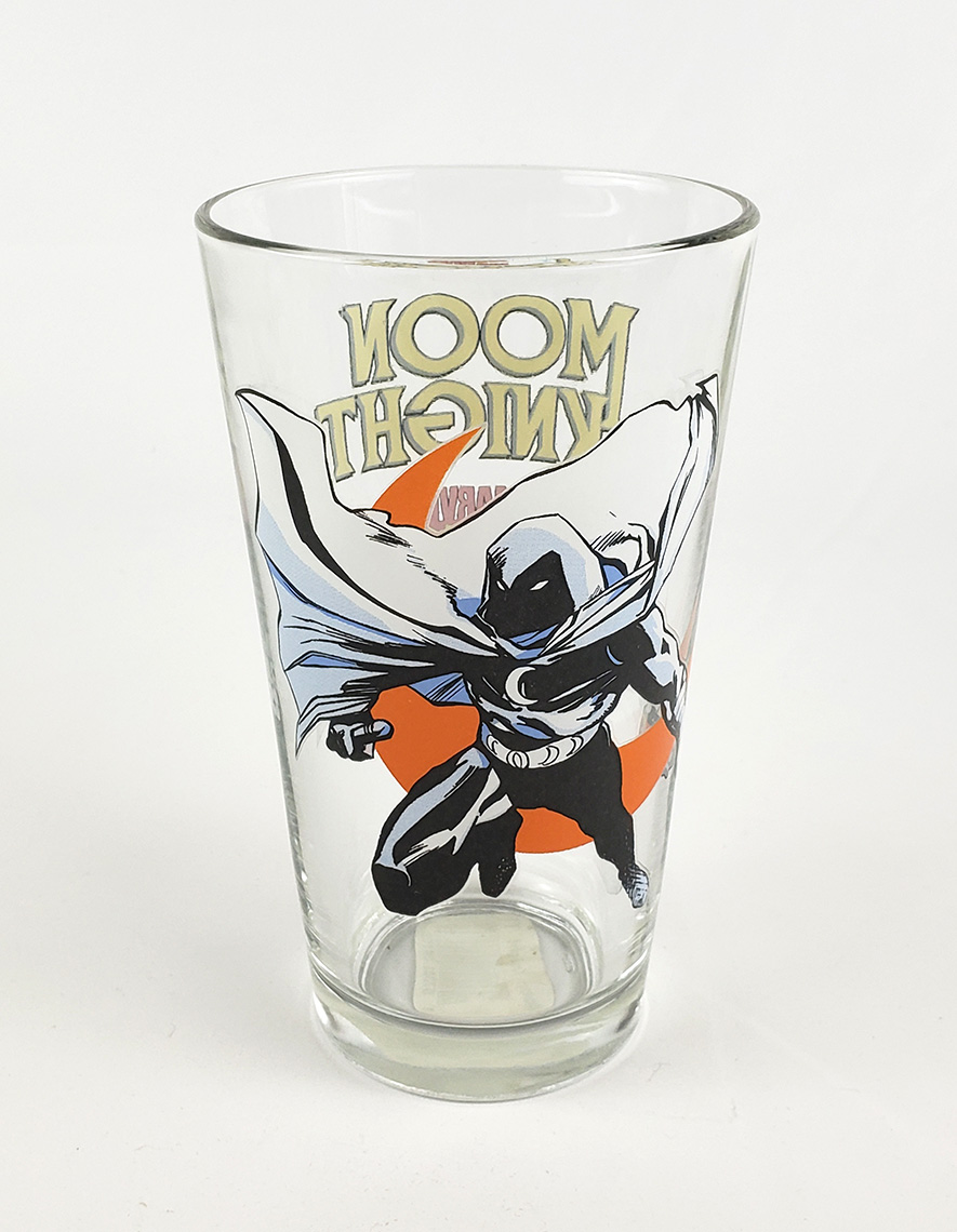 In 2022, Toon Tumblers® produced another line of Moon Knight themed Pint glasses, this time as a tie in for the new Disney+ Show. These are standard durable Pint Glasses with a Moon Knight image on one side, and the Logo on the other. One of the glasses features Moon Knight wearing his Disney+, Egyptian themed outfit. The other glass features him in his Mr Knight outfit. Initial Production size is unknown, but the standard retail for each glass was $10.99. Toon Tumblers® is a line of glassware by Popfun Merchandising, LLC. that features Marvel Comics Characters. Unfortunately these glasses are hand wash only.