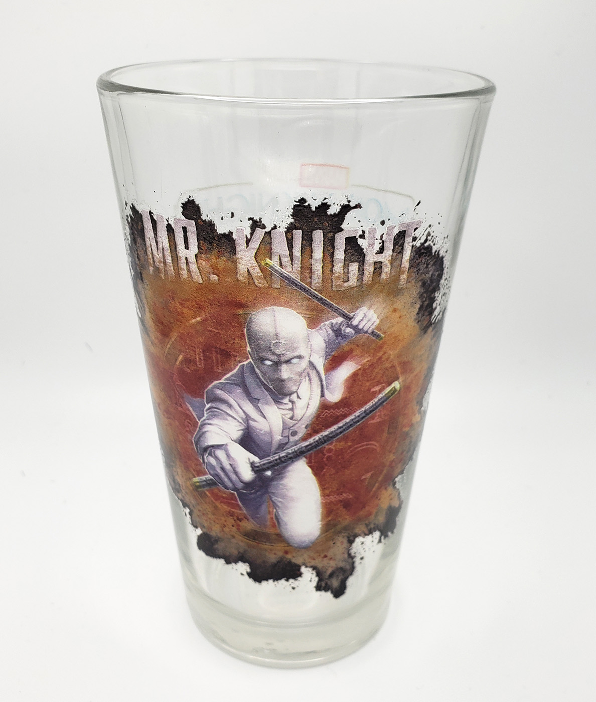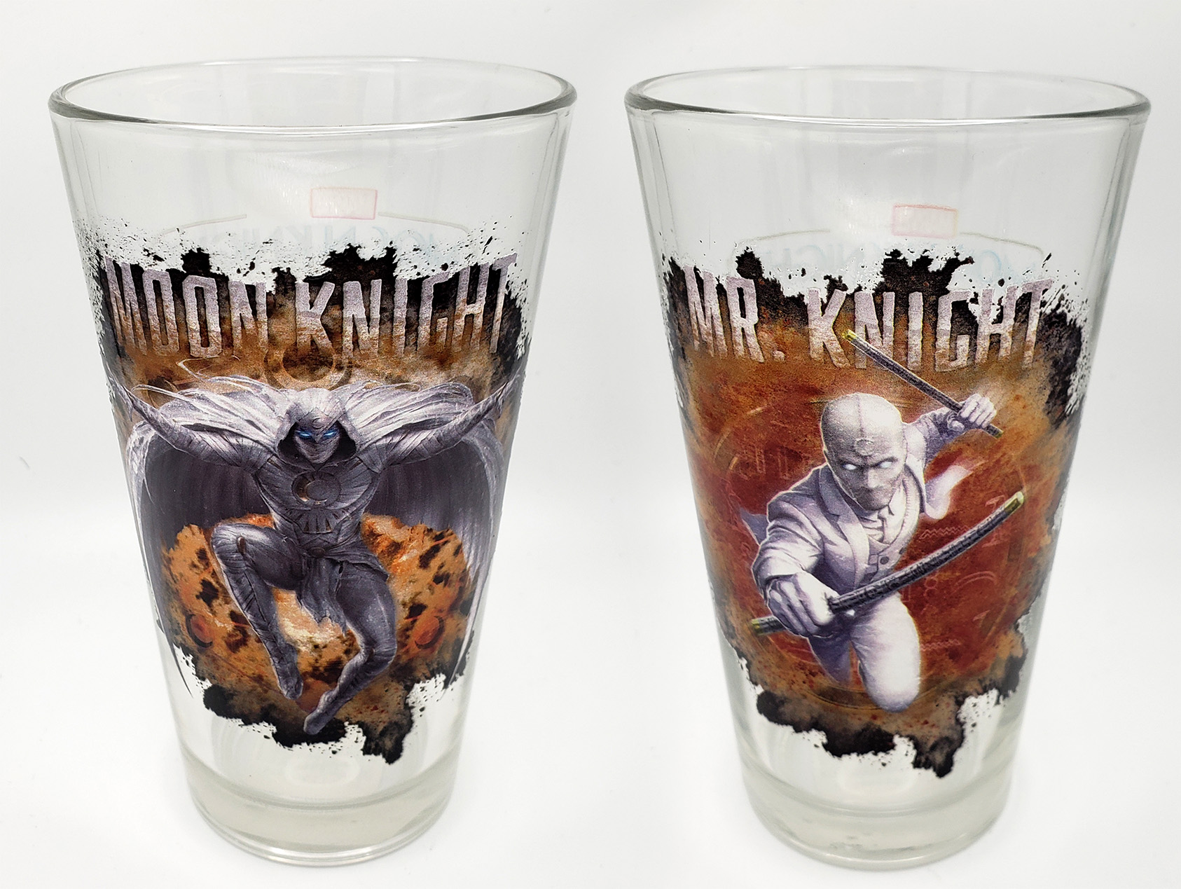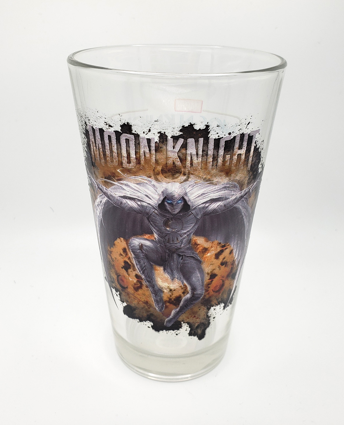 In 2022, Toon Tumblers® produced another line of Moon Knight themed Pint glasses, this time as a tie in for the new Disney+ Show. These are standard durable Pint Glasses with a Moon Knight image on one side, and the Logo on the other. One of the glasses features Moon Knight wearing his Disney+, Egyptian themed outfit. The other glass features him in his Mr Knight outfit. Initial Production size is unknown, but the standard retail for each glass was $10.99. Toon Tumblers® is a line of glassware by Popfun Merchandising, LLC. that features Marvel Comics Characters. Unfortunately these glasses are hand wash only.