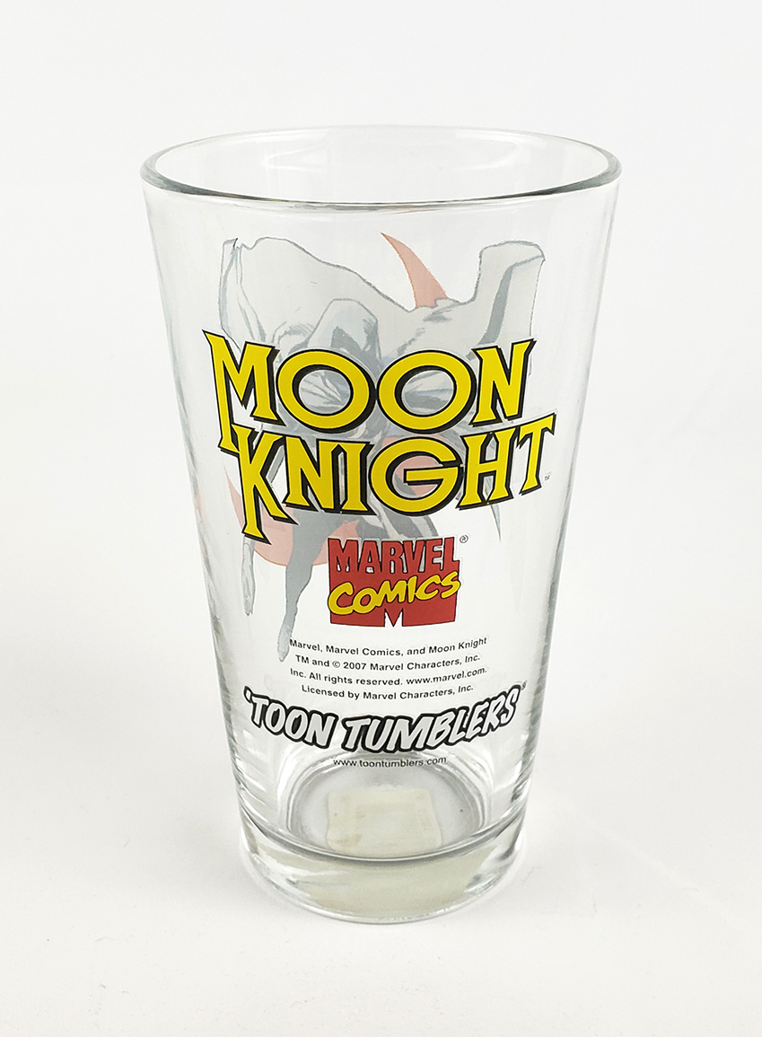 Toon Tumblers® is a line of glassware by Popfun Merchandising, LLC. that features Marvel Comics Characters. Around 2008 they released a Moon Knight glass as part of a production run. It's a standard durable Pint Glass with a Moon Knight image on one side, and the Logo on the other. Initial Production size is unknown, as well as how many production runs have been made, but at least 2 are confirmed. Unfortunately these glasses are hand wash only.