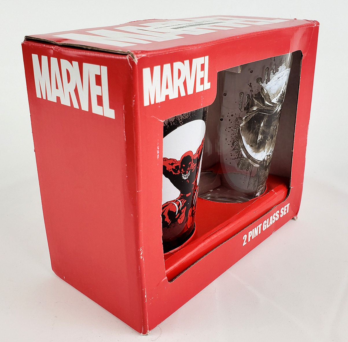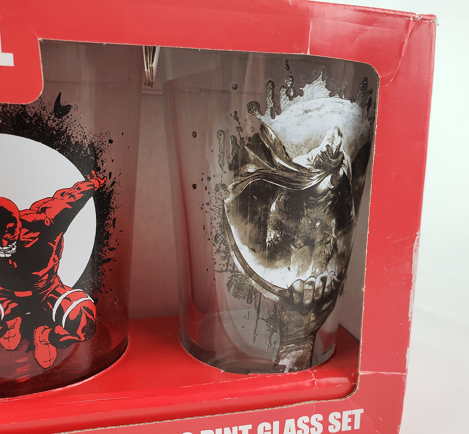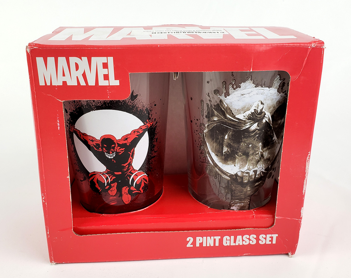 In 2014 Surreal Entertainment introduced a Moon Knight themed glass into their Marvel series of drinkware. These are standard style pint glasses similar to the Toon Tumbler series. It was widely produced during its initial run, and was easy to acquire for a short period. It features art from the Shadowland Moon Knight series. Around the same time, Surreal Entertainment produced a limited number of 2 pack boxed glass sets. This Daredevil themed set is dated 2013, although the glasses included are dated 2014. The Daredevil glass features Joe Quesada artwork. I acquired this from eBay, and therefore have been unable to pinpoint its original cost.