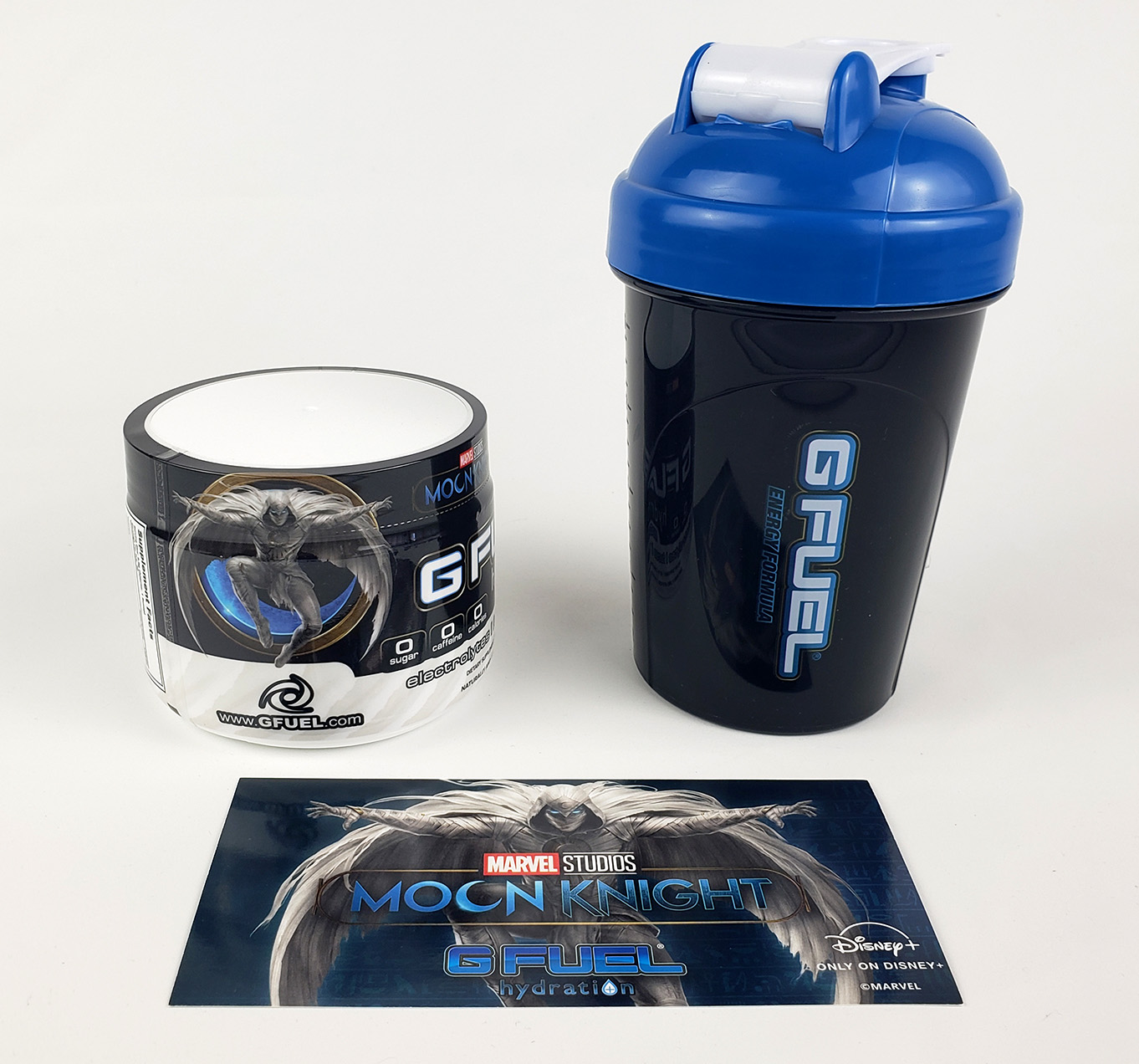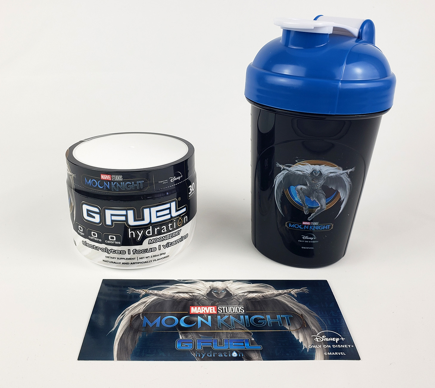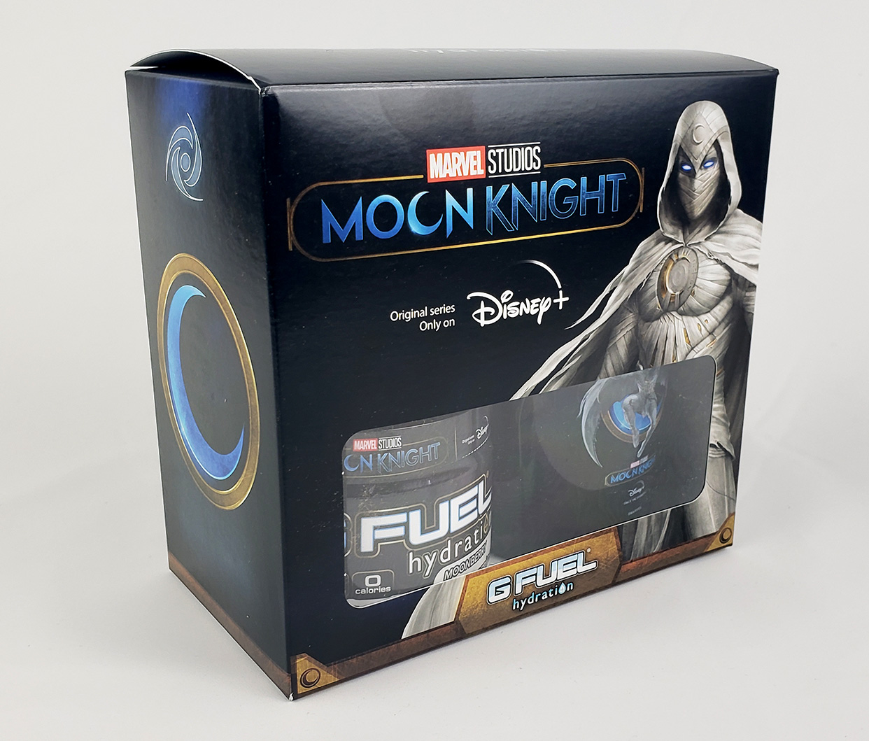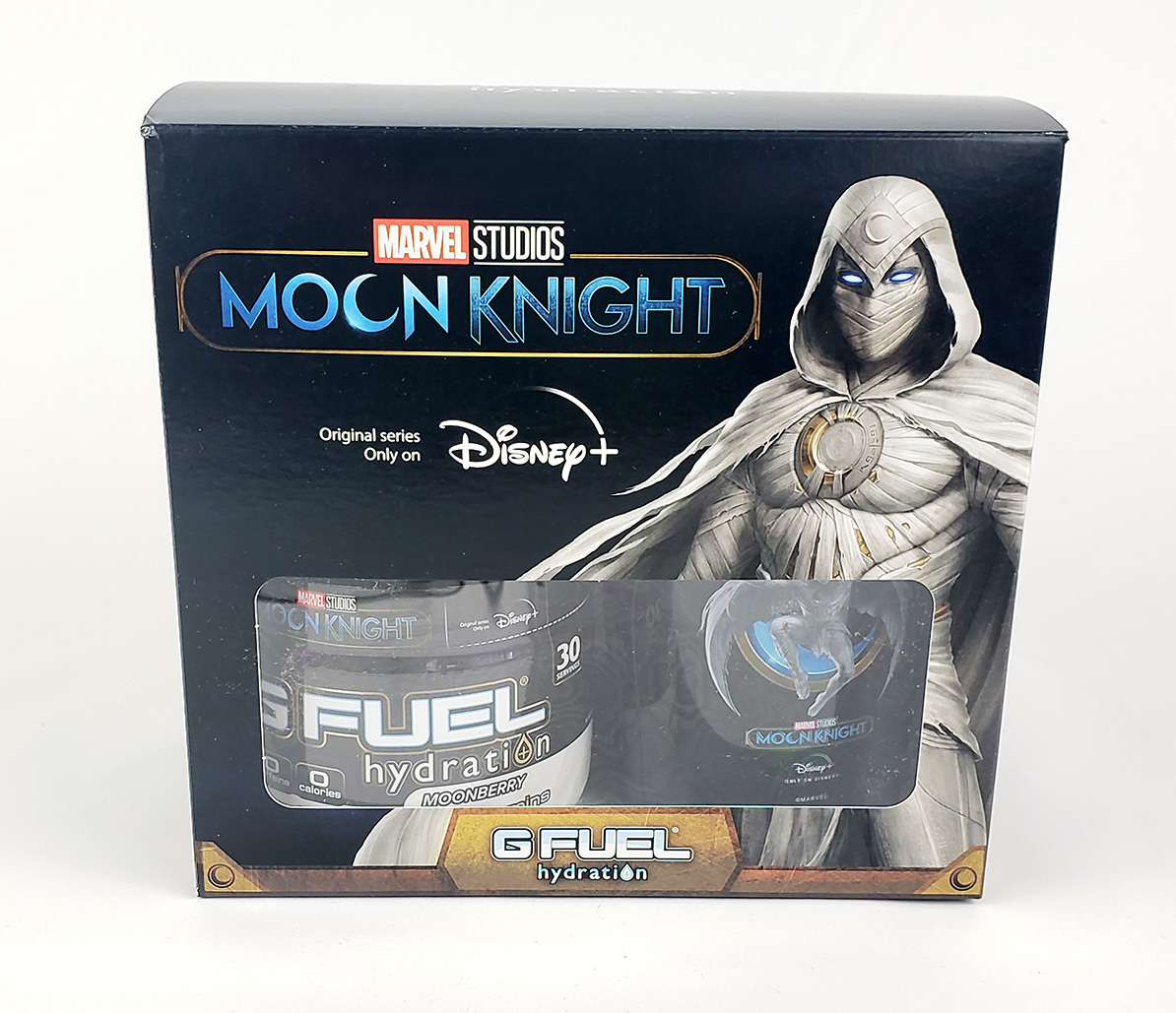 In 2022, G Fuel, the official Energy Drink of Esports, produced a limited run of an exclusive flavor as a marketing tie in with the Disney+ Show. It is a caffine free electroylte powder that is flavored with both Blueberry and Acai and called Moonberry. The collectors box contained a tub of the powder mix, a Moon Knight branded plastic shaker cup, and a small flyer. It retailed for around $39.99. The marketing for it claims "G FUEL Hydration Formula has zero calories per serving, and is sugar-free, caffeine-free, and naturally flavored. Each 30-serving tub of G FUEL Hydration is enhanced with the amino acid L-Tyrosine to keep you focused; fortified with vitamins C, E, B12 and B6 to help you stay on top of your game; and enhanced with electrolytes to keep you hydrated and firing on all cylinders." I admittedly did not taste it.