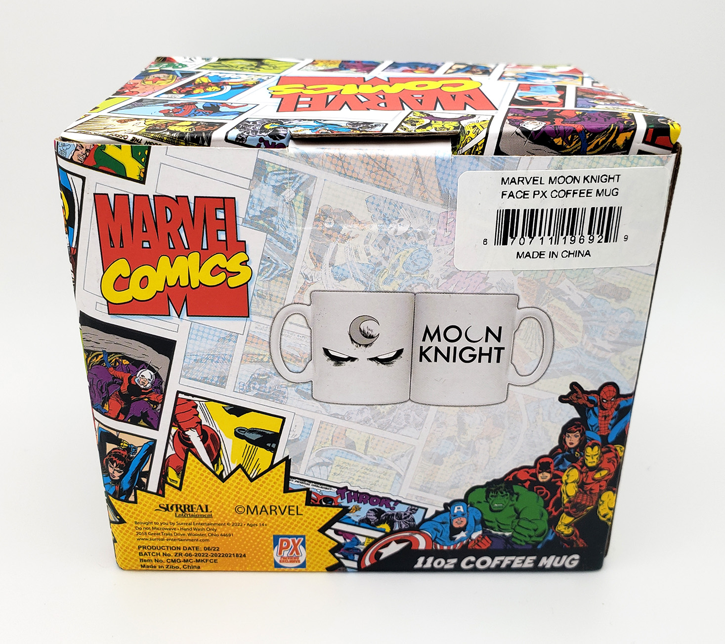 In 2022 Surreal Entertainment produced an 11oz Coffee Mug as a Previews Exclusive. It was only available through orders via the Previews Catalogue, the monthly circular from Diamond distribution. It was released in October of 2022, and had a production run of only 1000 pieces. It retailed for $15.99. It is based on the 2014 Series Cover with art by Declan Shalvey. It is a standard style mug with Mr Knight's face on one side, and the coresponding logo design on the other.