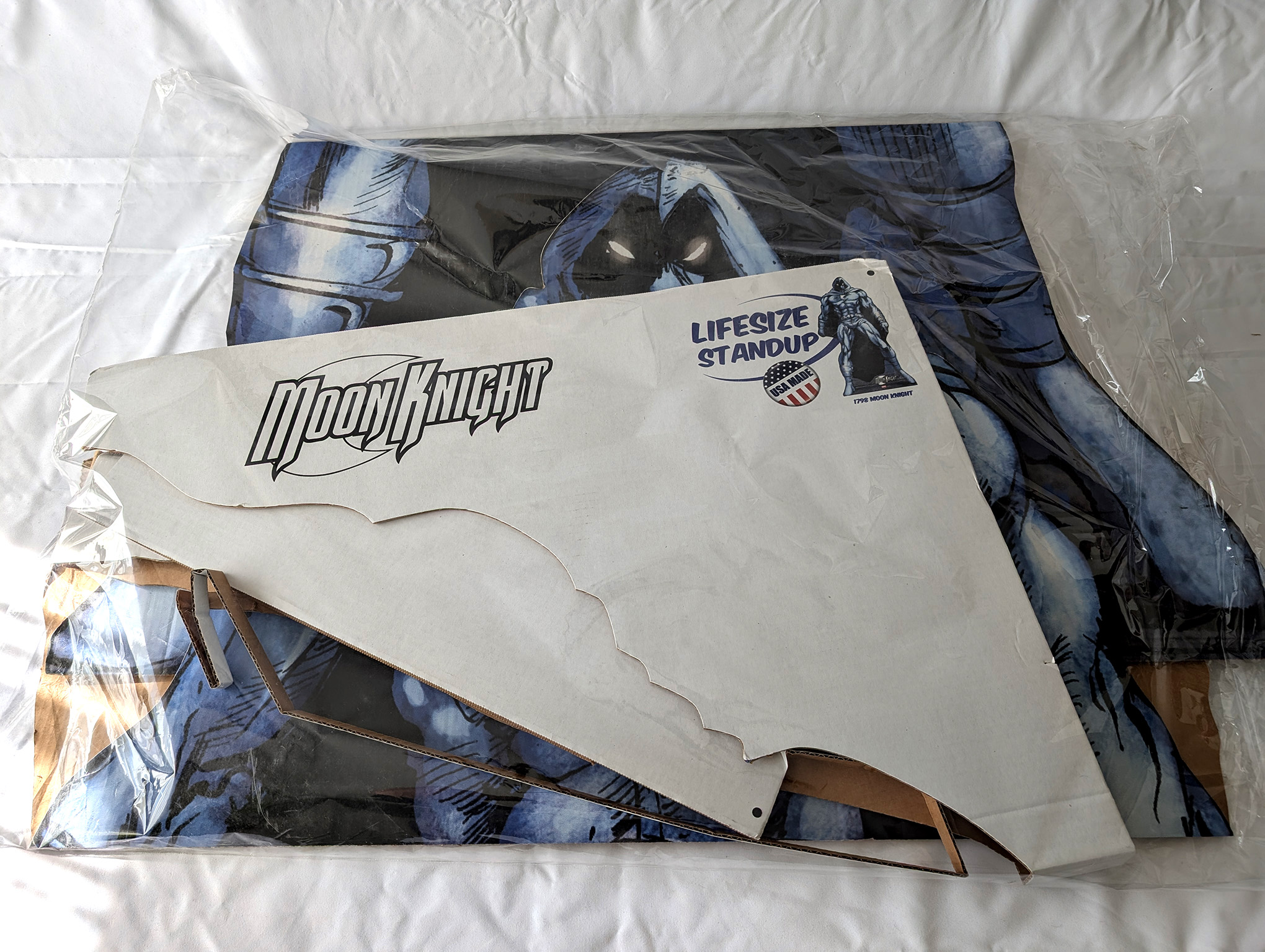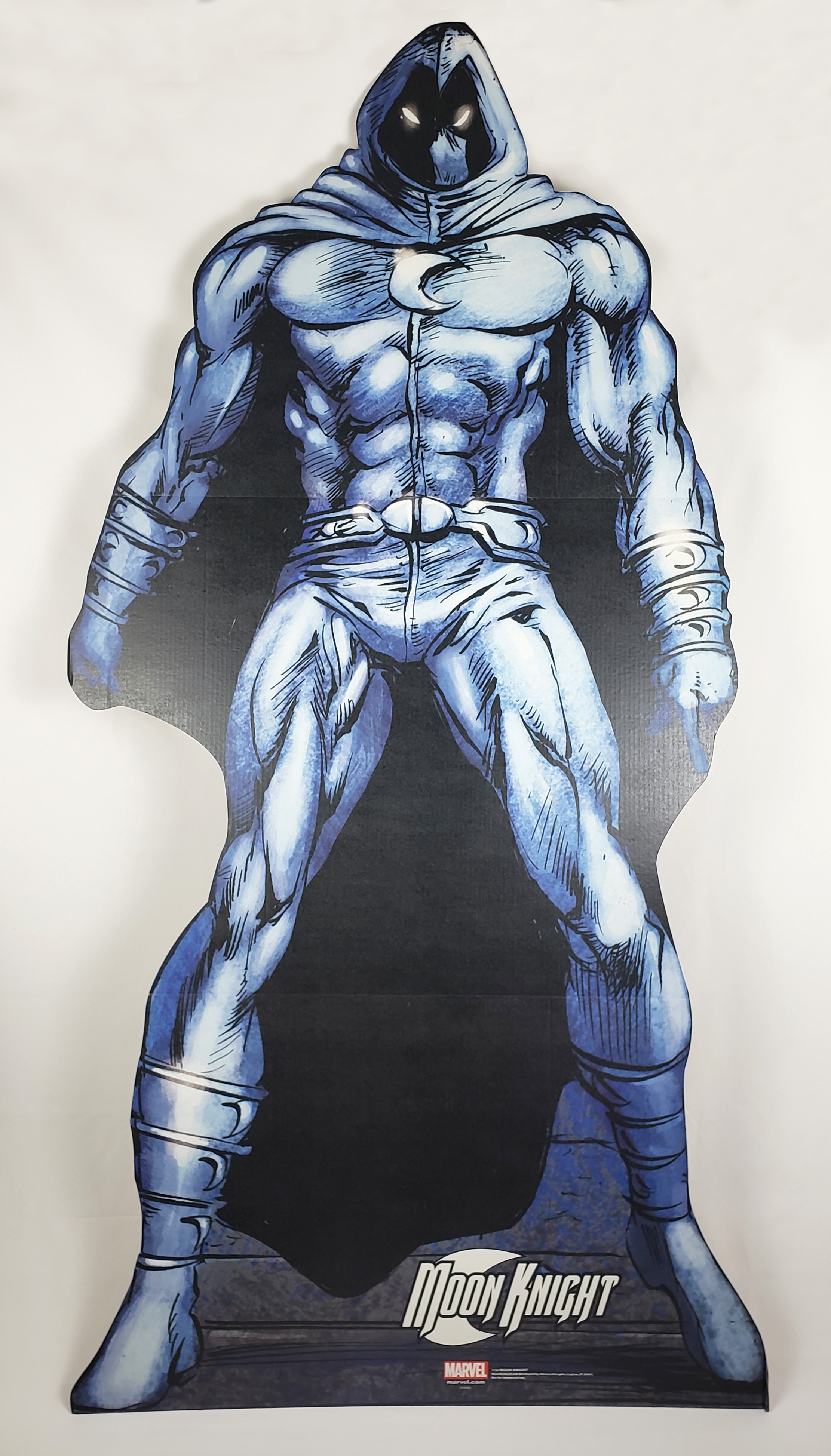 One of the more interesting additions to my collection is this "life size" Cardboard standup by Advanced Graphics. As part of a line titled Marvel Extreme, Advanced graphics produced numerous large cardboard standups using existing production art. Moon Knight was #1798, and stands 74" tall, and 38" wide. It features art from Mark Texeira. Unfortunately, I don't have a date for production, but it was between 2010 and 2017.