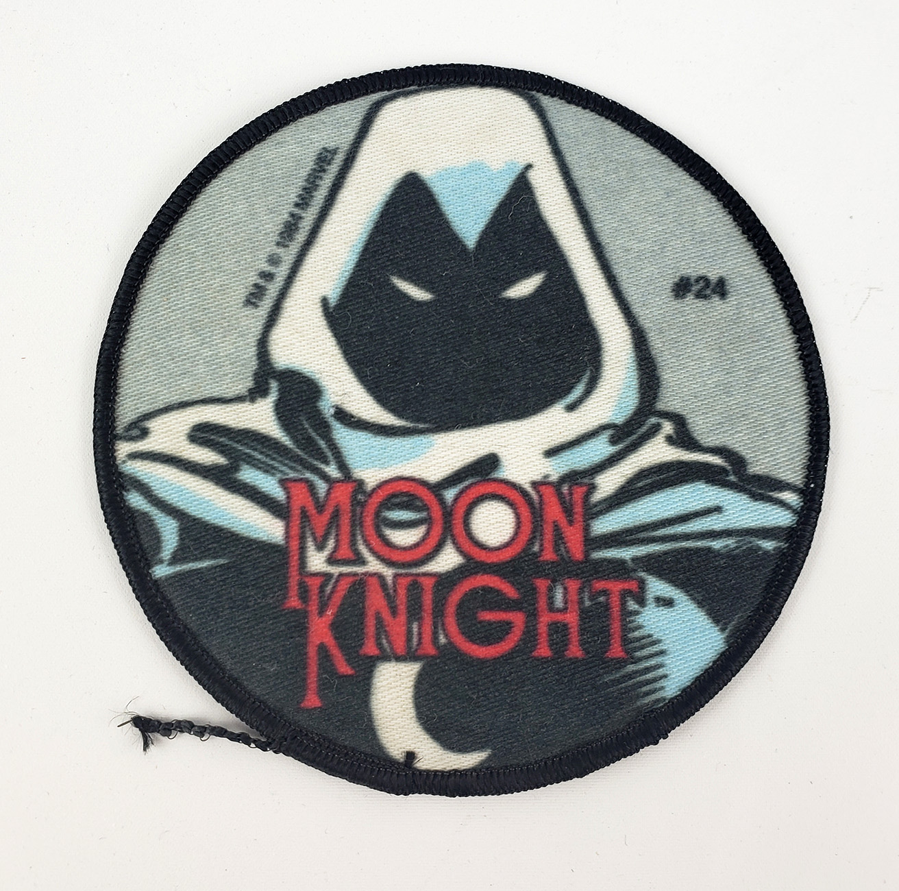Not much is known about any of the patches on this site. What is known is that during the mid-eighties, Marvel produced a series of patches featuring various characters from across the Marvel Universe. Some of the series included numbering, others did not. This particular Moon Knight patch was #24, and released in 1984. It features the original 1980's series logo, and art from Bill Sienkiewicz.