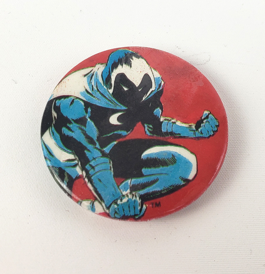 During the late 80's and early 90's a company called Planet Studios made a large assortment of Marvel licensed cloisonne pins. In 1989 they released a Moon Knight Themed pin. The pin features a full character depiction as well as comic-panel styled narration and elaborate sound-fx letters. It stands out compared to other pins in the series. This is one of the rareist pieces of Moon Knight merchandise I have ever had to search for. It rarely appears for sale, and is often quite expensive when it does.