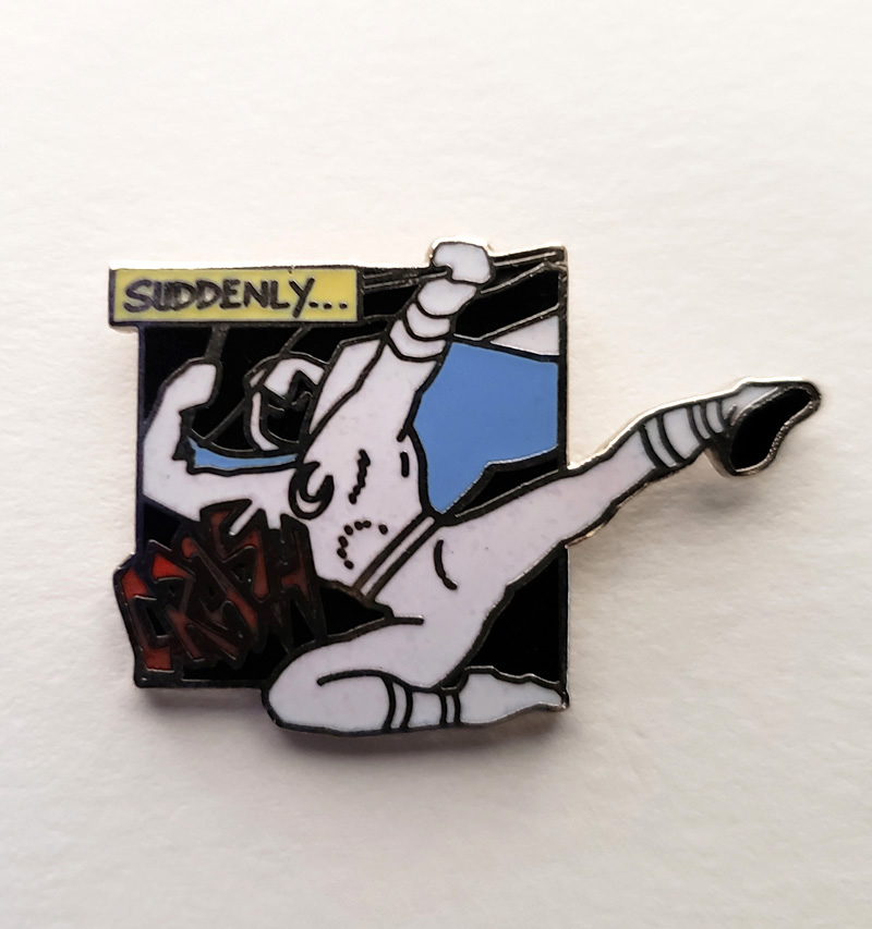 I can't find much concrete information about this particular pin. All I can say is that it has a date of 1985 on the underside, and that I have seen enough of them on eBay over the years to comfortably say it was mass produced, and likely an official product, not a custom item. Being from 1985 makes this the earliest of all the official pins that I have discovered.