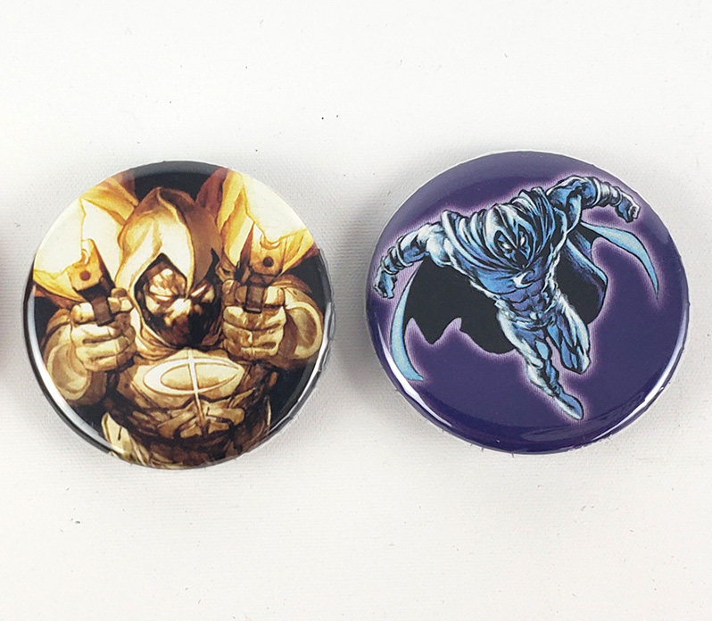 I don't know too much about these pins, except they appeared around 2015, and were available on multiple sites, all of which claimed these to be officially licensed. One is from the cover of Vengeance of the Moon Knight 1 by Leinil Yu, and the other features art of Mark Texeira.