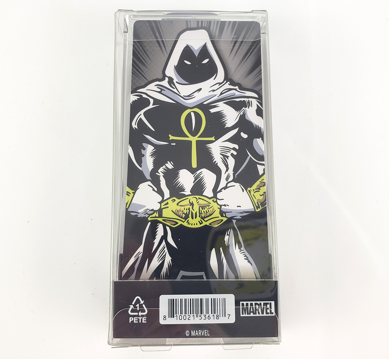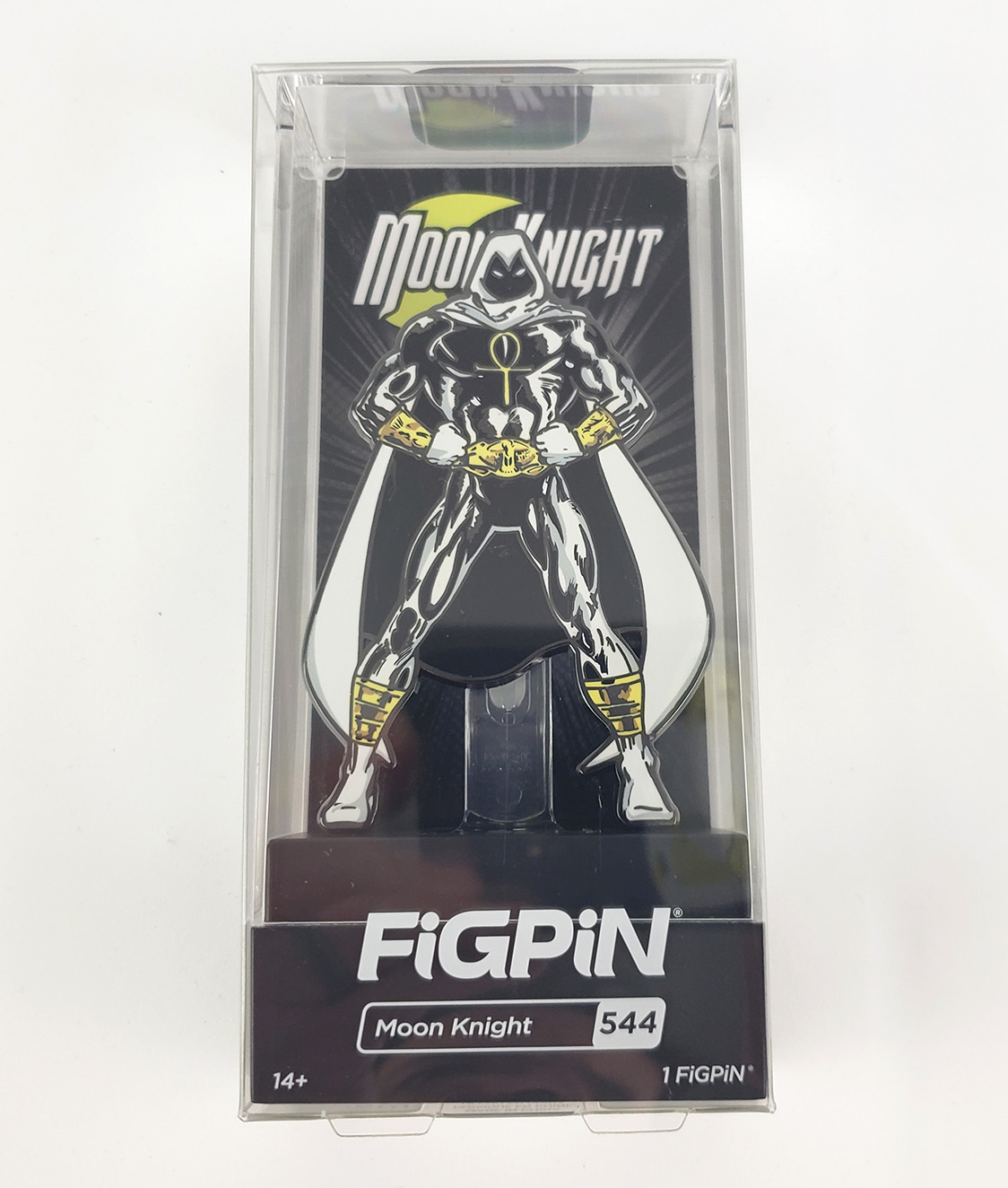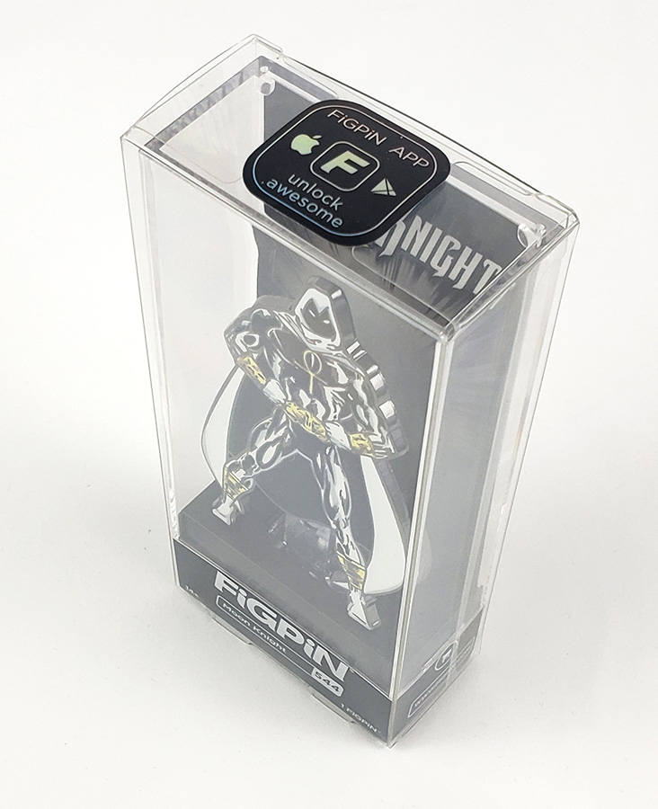 In 2020, FiGPin produced a Moon Knight pin for their Marvel line of enamel pins that are unique when compared to traditional collectible pins. The most noticeable difference is that they are considerably larger than traditional pins measure 3 inches tall (not including packaging). The pinback is also designed so that the pin can stand upright for display. Lastly, they come in a clear poly-carbonate display box. It appears to be a high-quality, claiming to be made of a 2mm thick cast zinc alloy with electroplated nickel coating. They chose to use corner box art from the Fist of Khonshu era for this pin. Moon Knight is #544, and was limited to only 2000 pieces. Its original retail pricing was $20.