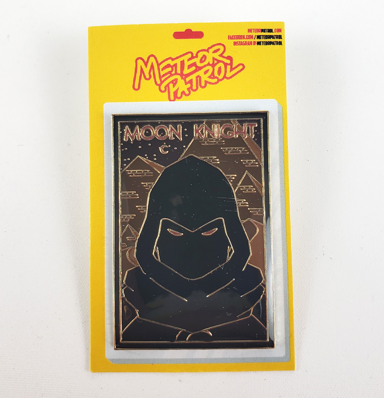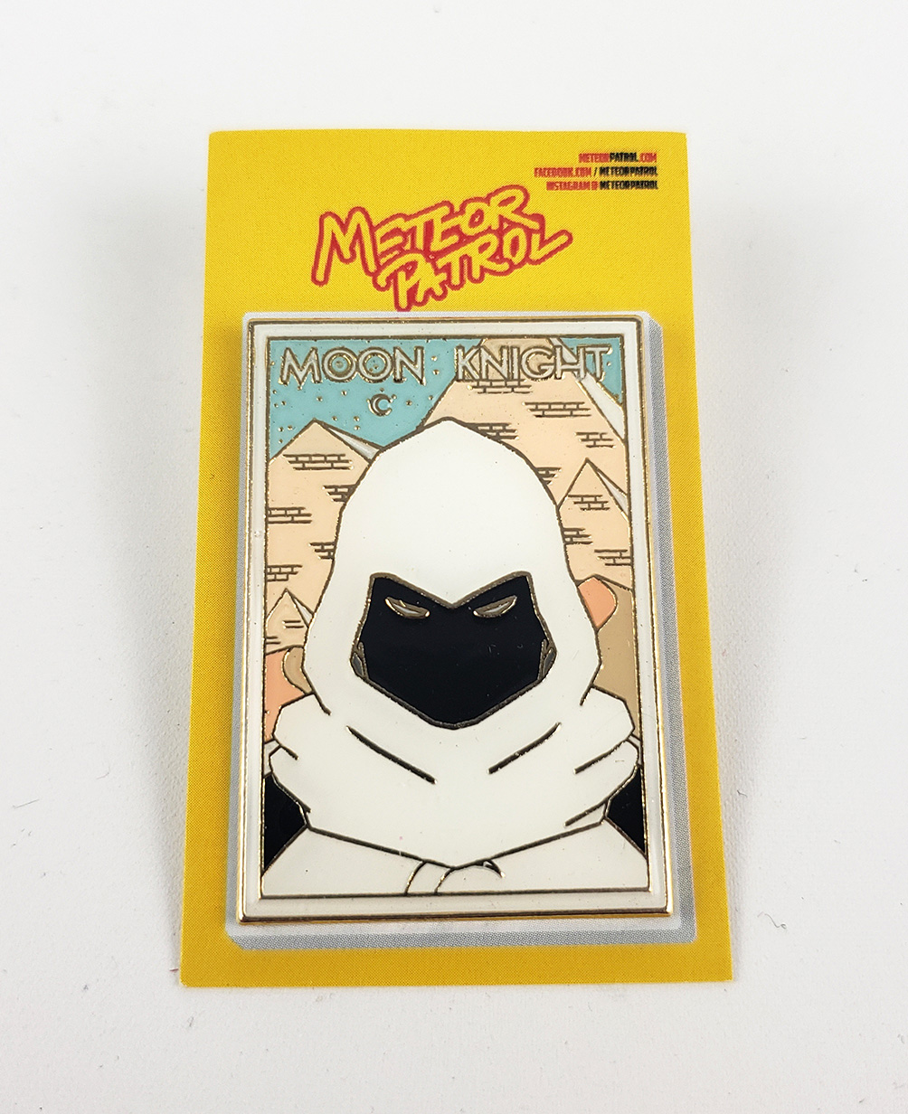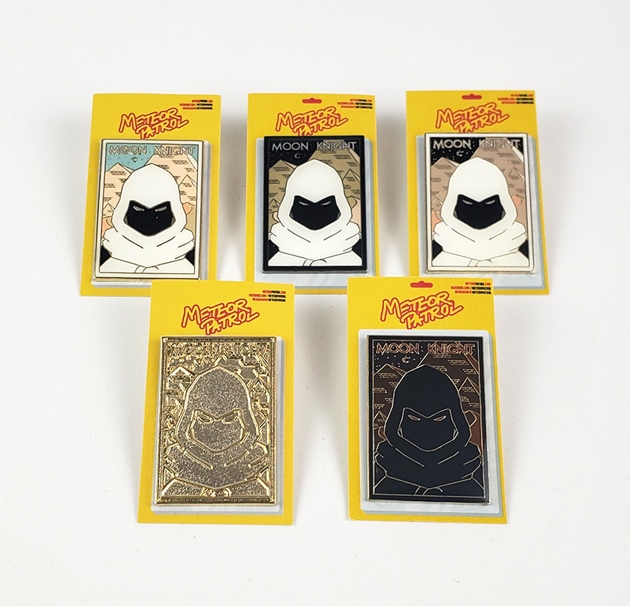 In late 2020, Meteor Patrol produced a set of Moon Knight Enamel Pins. They created 5 versions. The Standard 3 were the Daytime gold border, Nightime black border, and