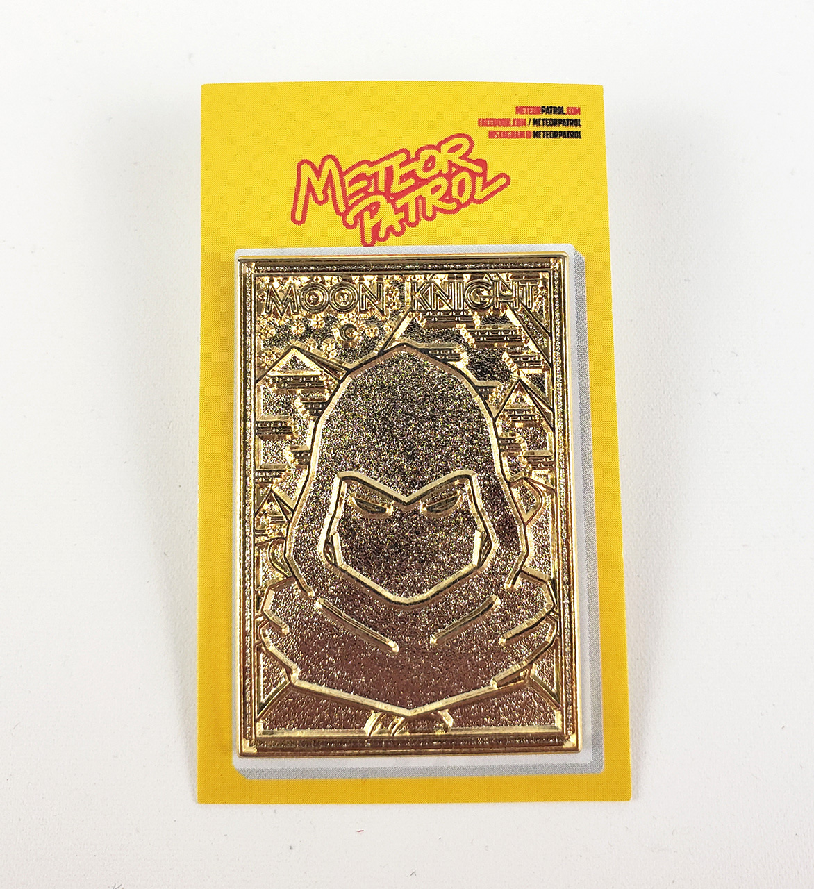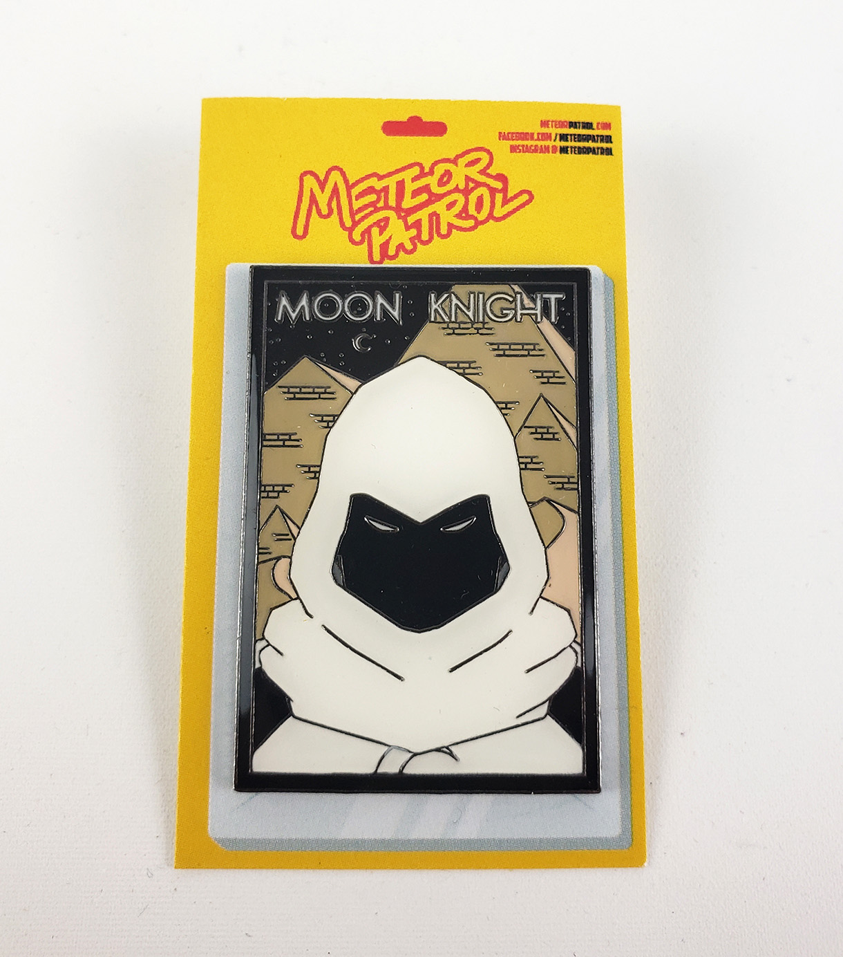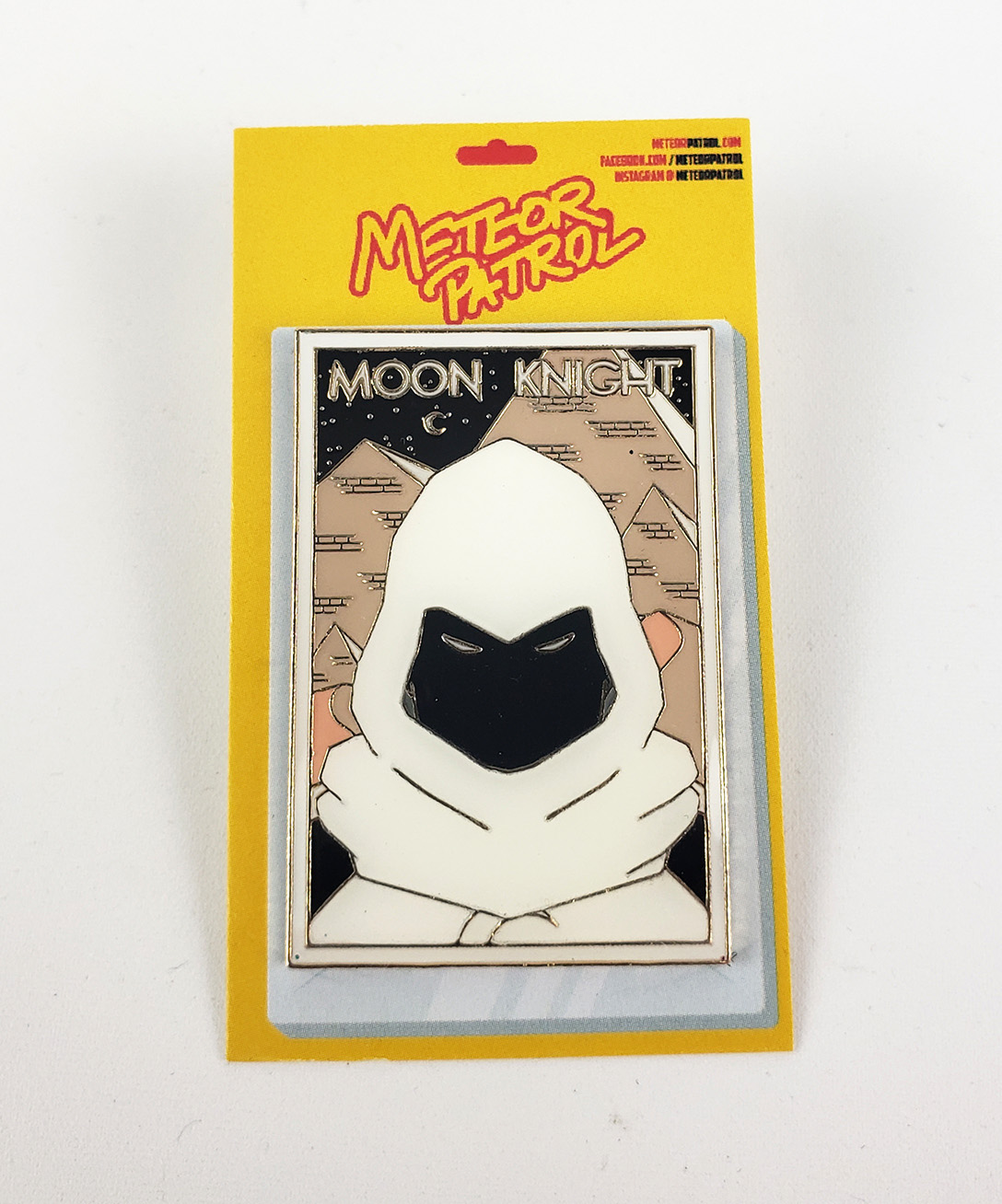 In late 2020, Meteor Patrol produced a set of Moon Knight Enamel Pins. They created 5 versions. The Standard 3 were the Daytime gold border, Nightime black border, and