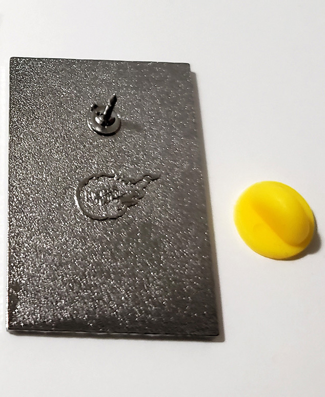 thick. It is listed as being soft enamel with black nickel and gold plating. It comes with a rubber clutch pinback.