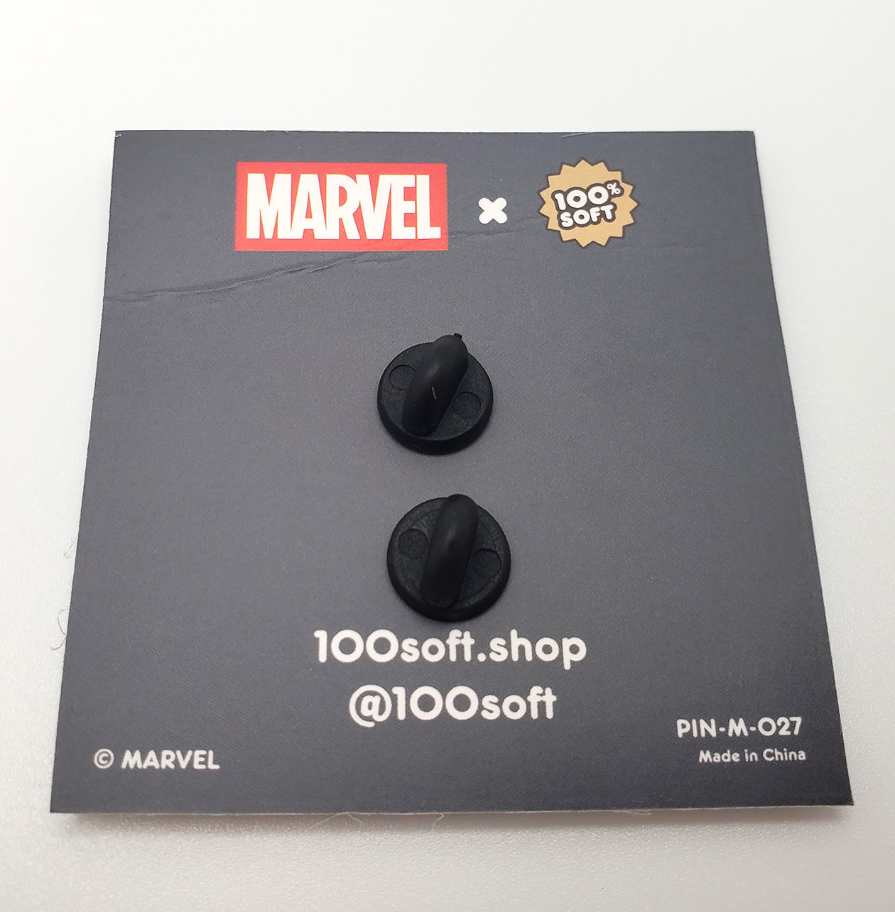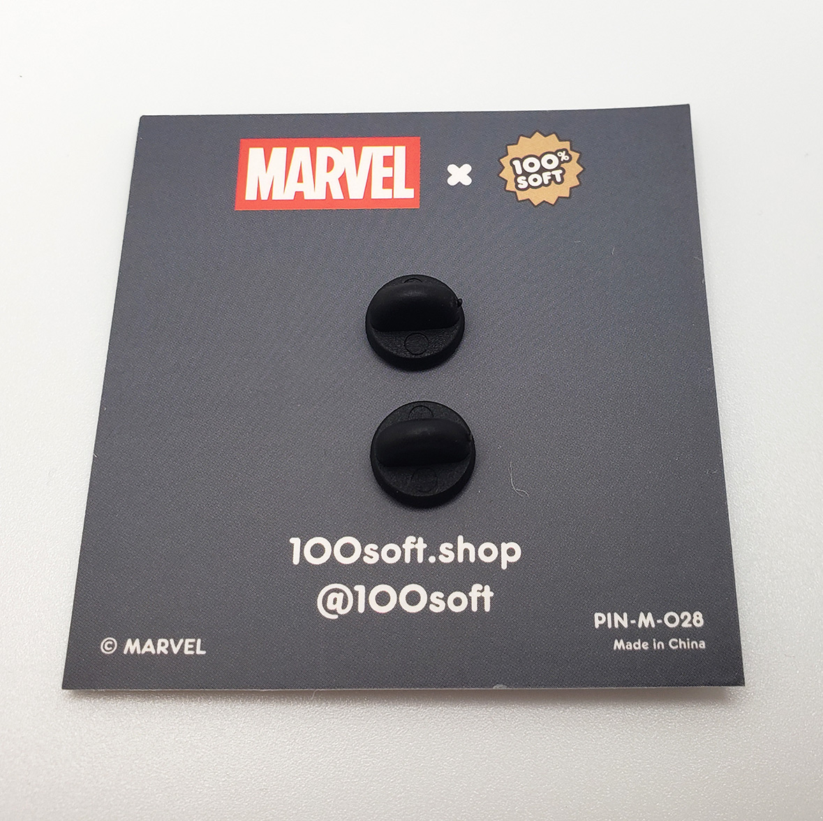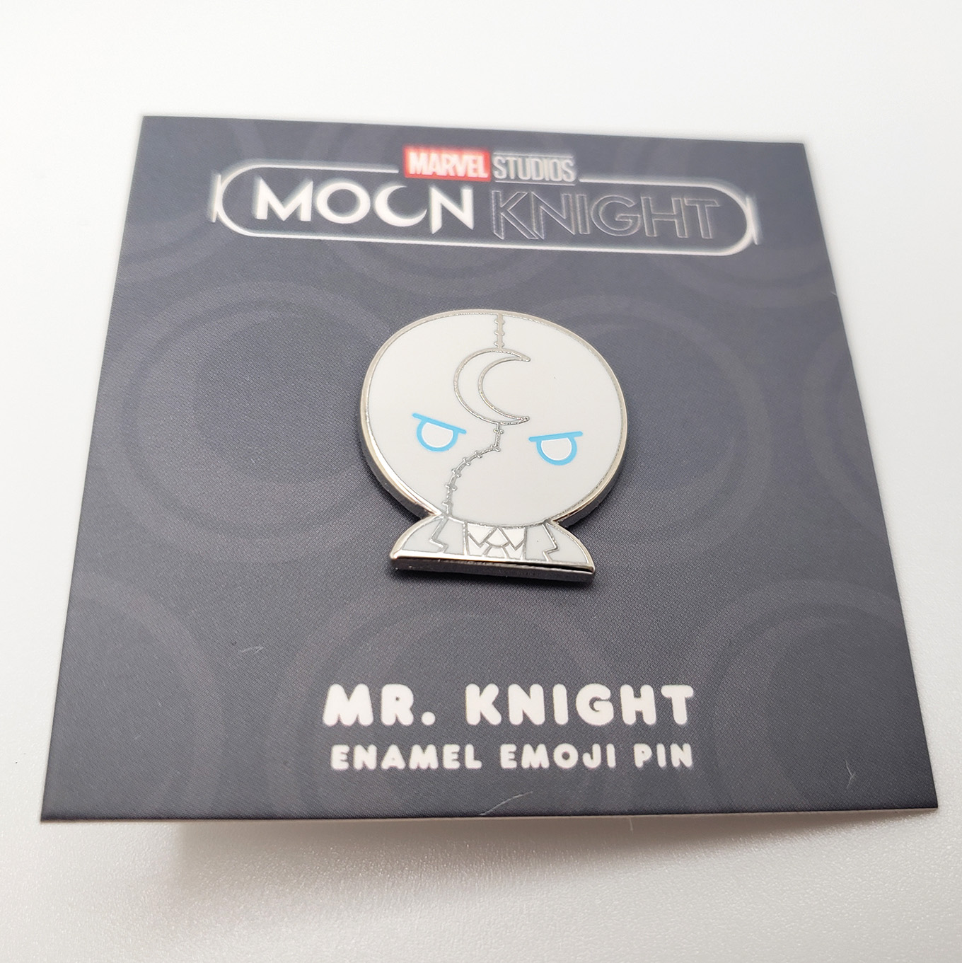 In 2022 100% Soft produced two Moon Knight themed pins to tie in with the release of the Disney+ show. One is of Moon Knight's Face, the other is of Mr Knight's Face. They are both depicted in an emoji style, similar to the mini bust they also produced. The pins are about 0.9" wide, feature black nickel plating, and double rubber clutches. Retail price was $12 each.