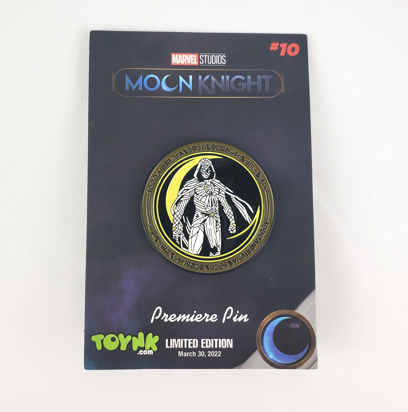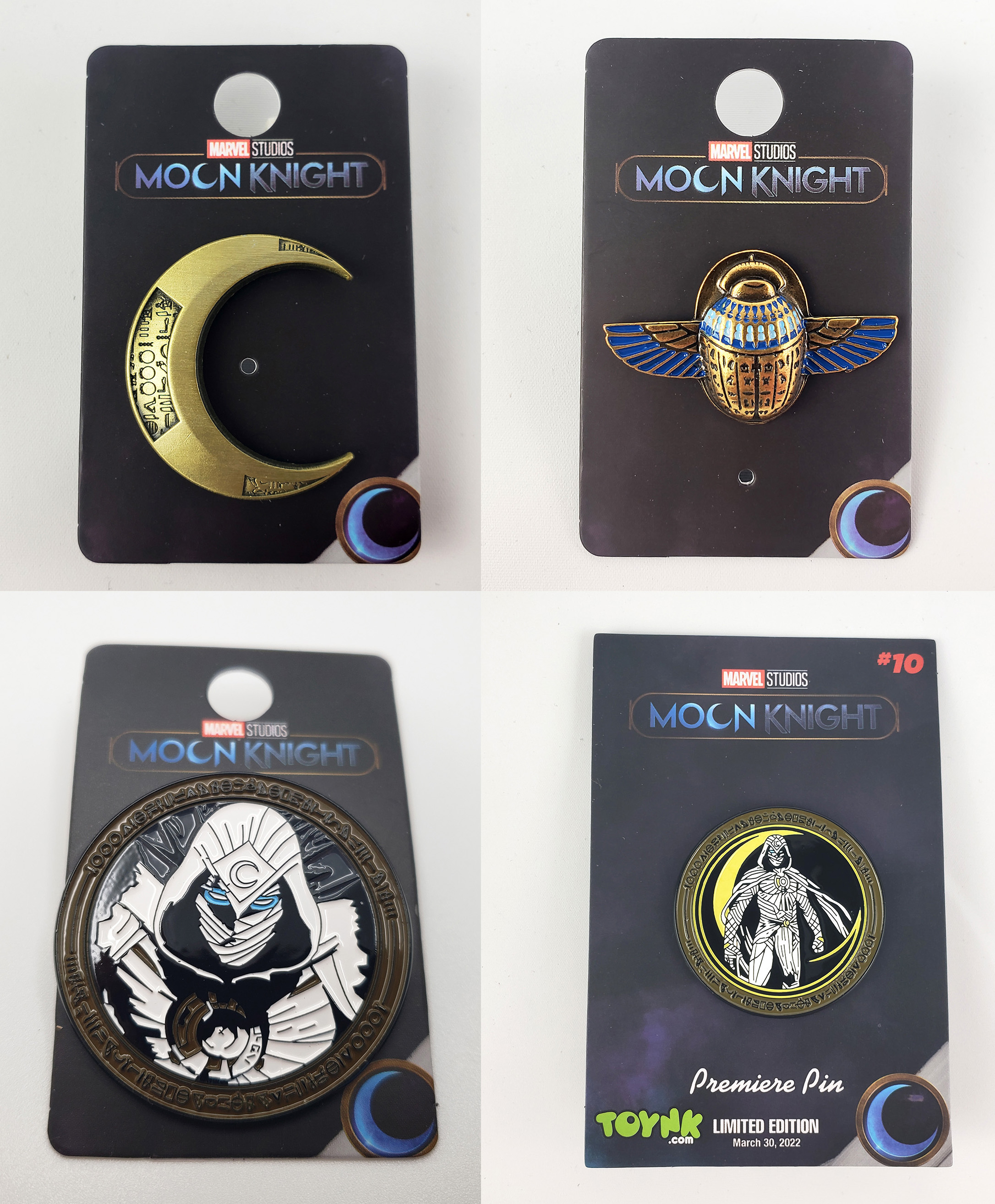 In 2022 Salesone produced quite a few Moon Knight themed pins to tie in with the release of the Disney+ show. One is a crescent modeled after the one on Moon Knights chest that he could use as weapons. The other is the Scarab Compass. The third is of his face using the stock images Marvel made for the show with a dark gold border. The fourth is another stock image use, but this one depicts most of his body with a light gold border and crescent symbol in the background. This last pin was an exclusive to toynk.com, and numbered 10. Retail prices ranged depending on retailer, but were around $10 each.