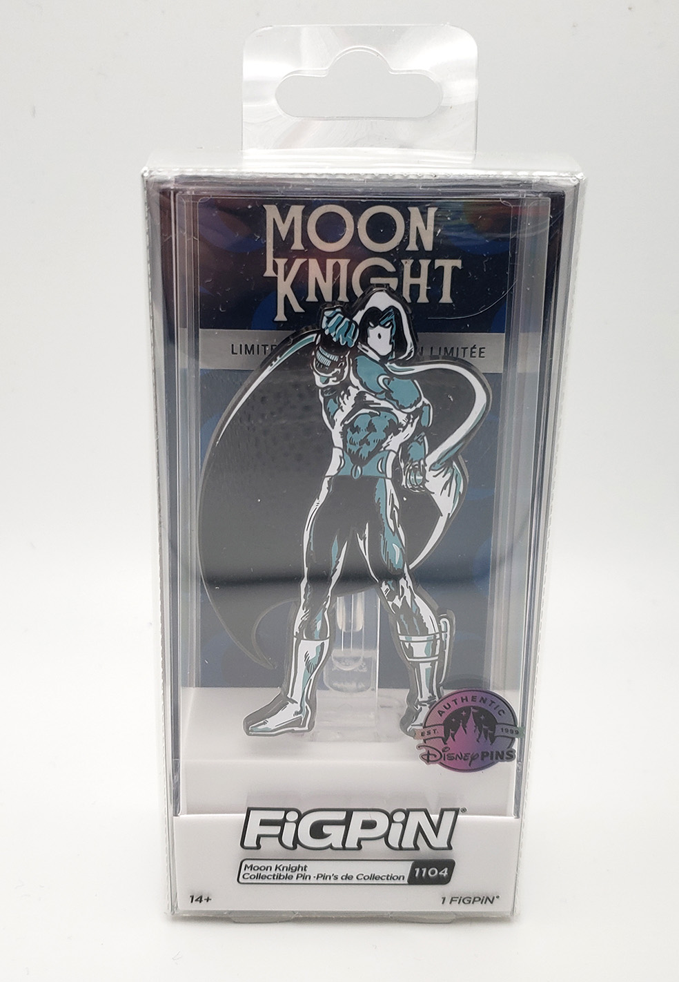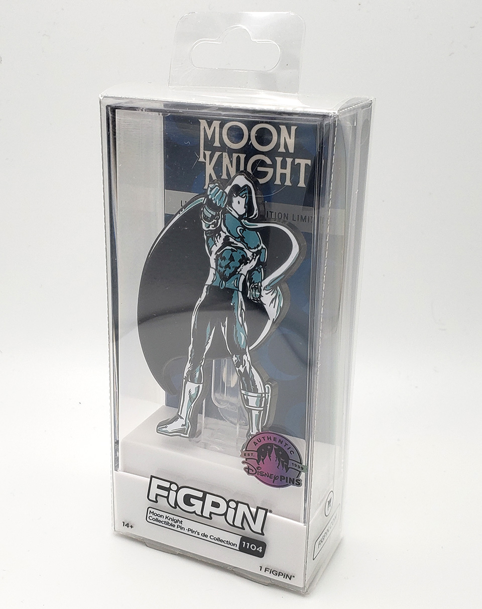 In 2023, FiGPin produced a second Moon Knight pin for their Marvel line of enamel pins that was an exclusive to Disney theme parks. FiGPins are considerably larger than traditional pins measure 3 inches tall (not including packaging). The pinback is also designed so that the pin can stand upright for display. Lastly, they come in a clear poly-carbonate display box. It appears to be a high-quality, claiming to be made of a 2mm thick cast zinc alloy with electroplated nickel coating. The image they used is a Bill Sienkiewicz classic from the late 70s. Moon Knight is #1104, and was a limited production run, although the quantity produced is unknown. Its original retail pricing was $24.99.