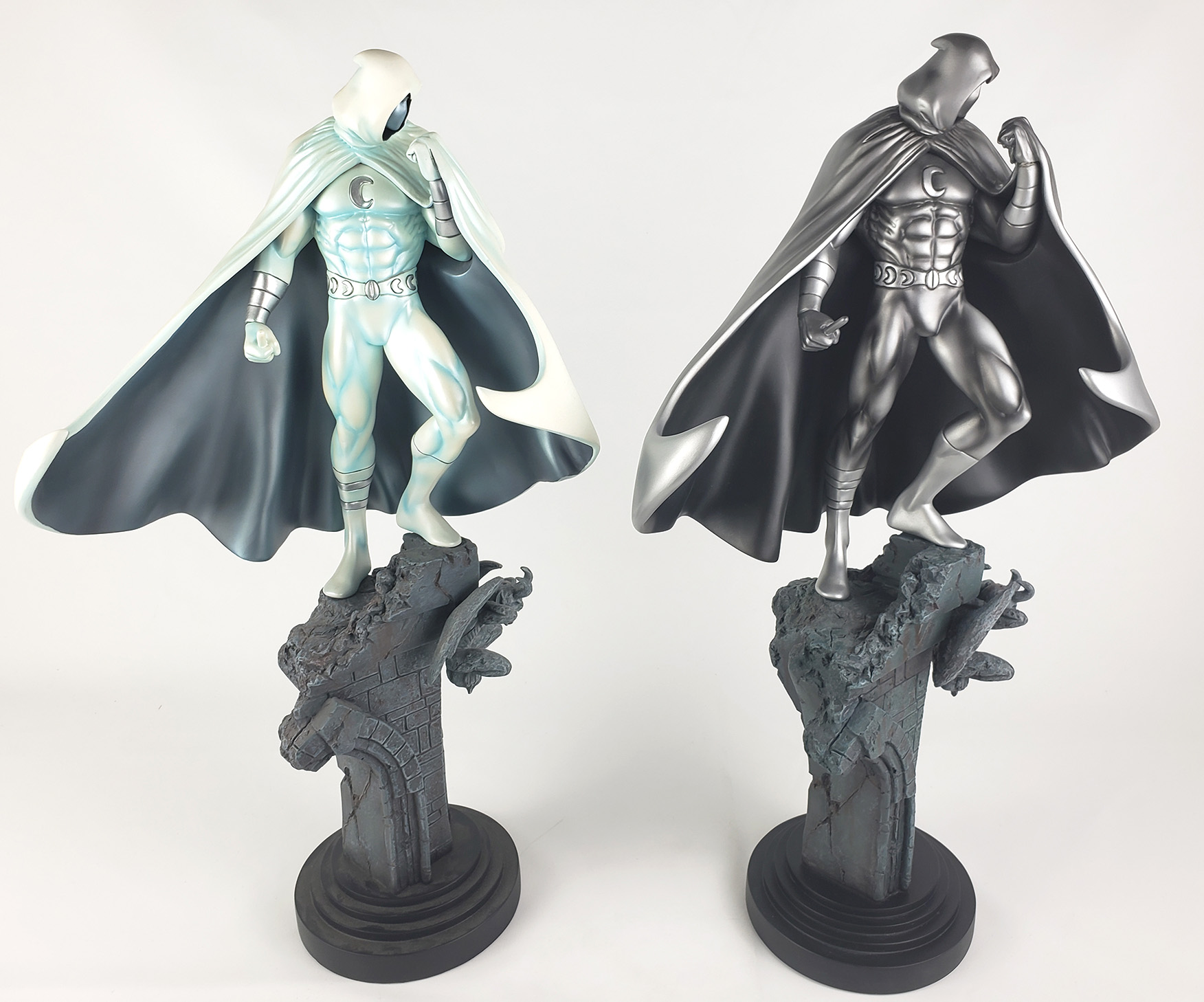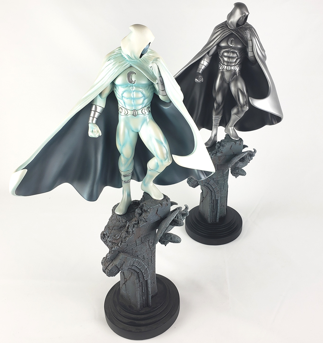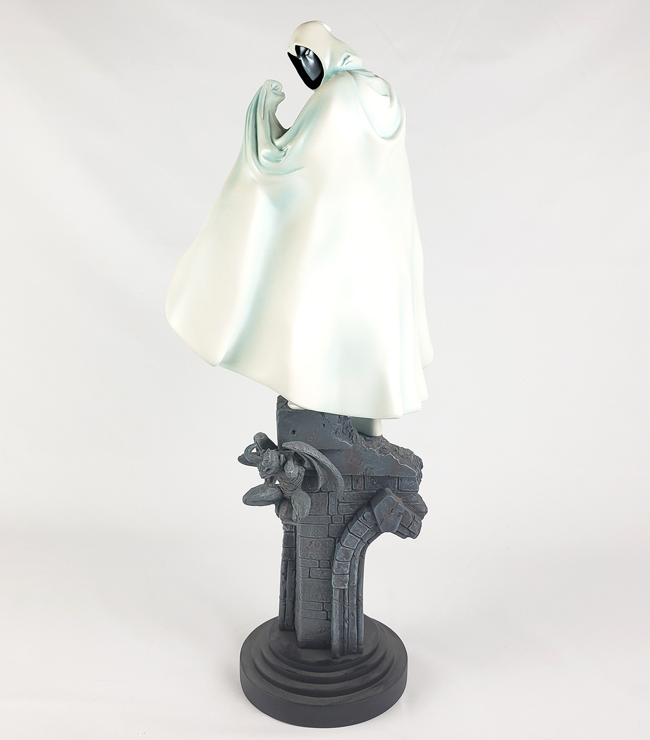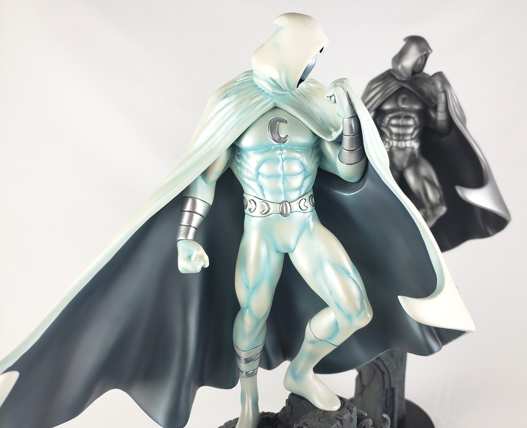 In 2006 the Fan Favorite Statue Producer Bowen Designs released their Third Moon Knight product, a painted variant of their full figure statue. It was part of Bowens Phase 3 Marvel Statues, #64 to be exact (the original silver version was #63). This variant had an edition size of only 600 statues, and launched for $210. This painted variant of the statue was painted white to reflect the white nature of Moon Knight's later costumes. This statue was sculpted by the Kucharek Brothers and came in two painted varieties. The statue comes in two pieces: the figure, and the base. Although relatively durable, the two pieces do not make a tight connection. Furthermore, it is inappropriately top heavy leading to stability issues. It needs to be displayed securely to keep it from falling over. The more limited edition size of this variant makes it considerably more rare than the silver version, and is therefore much more expensive to acquire.