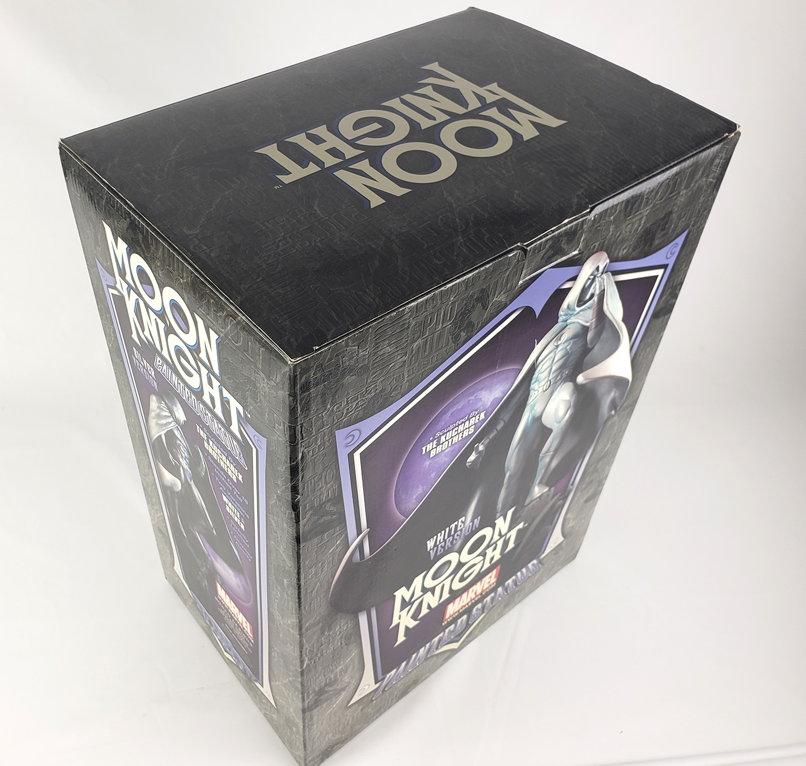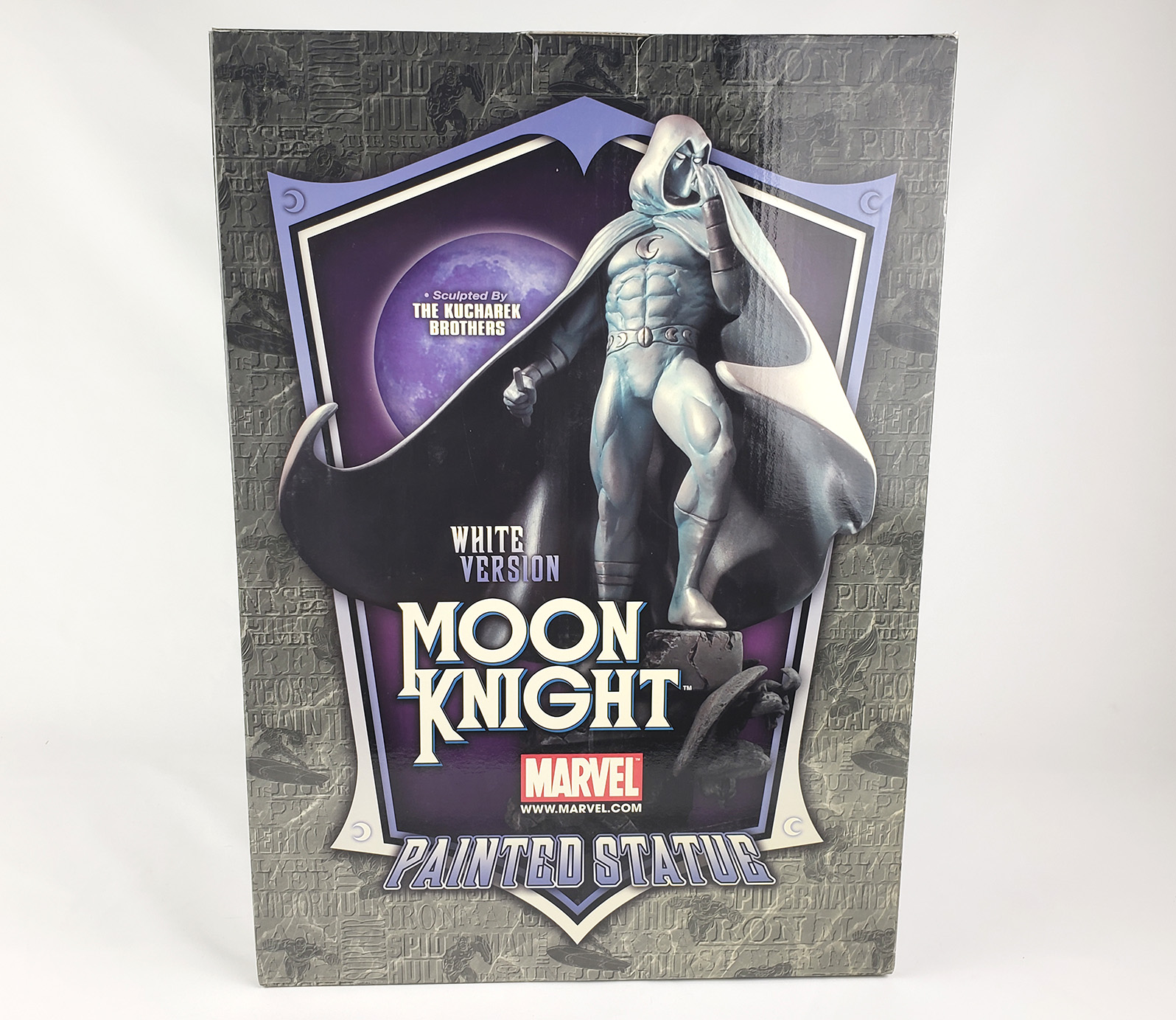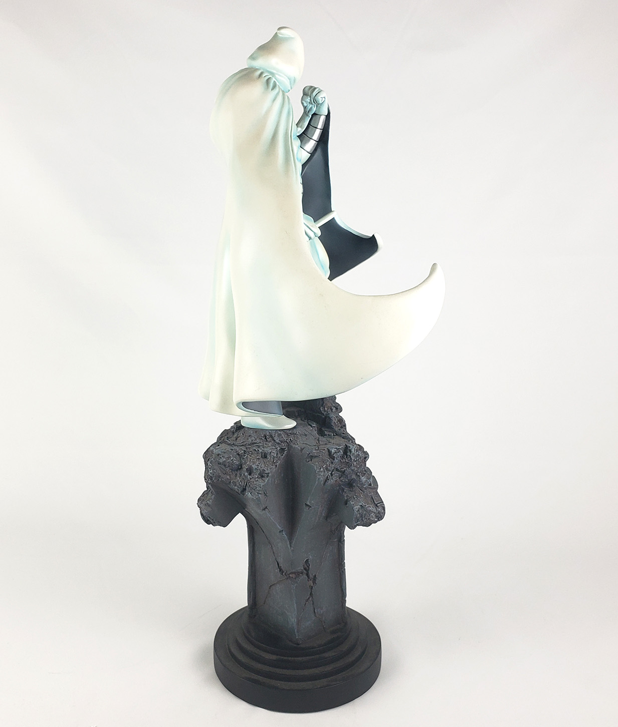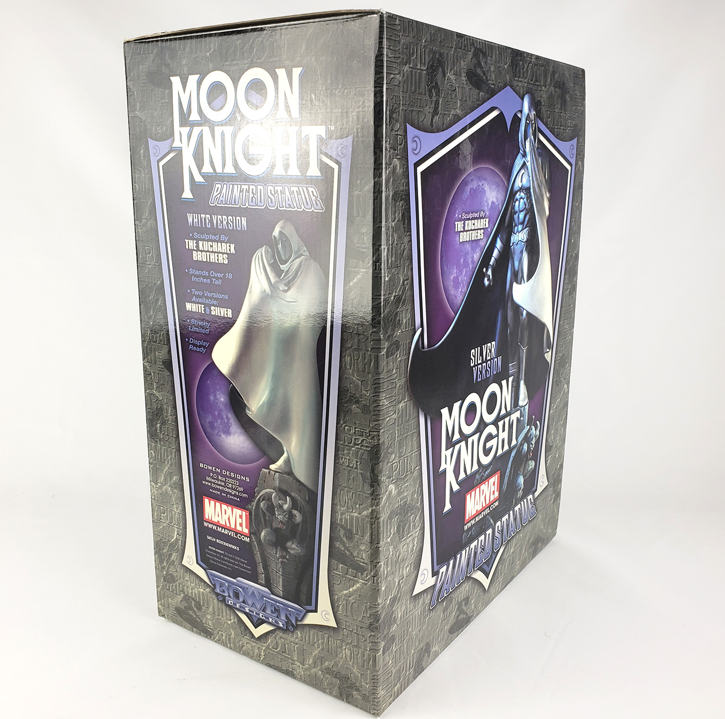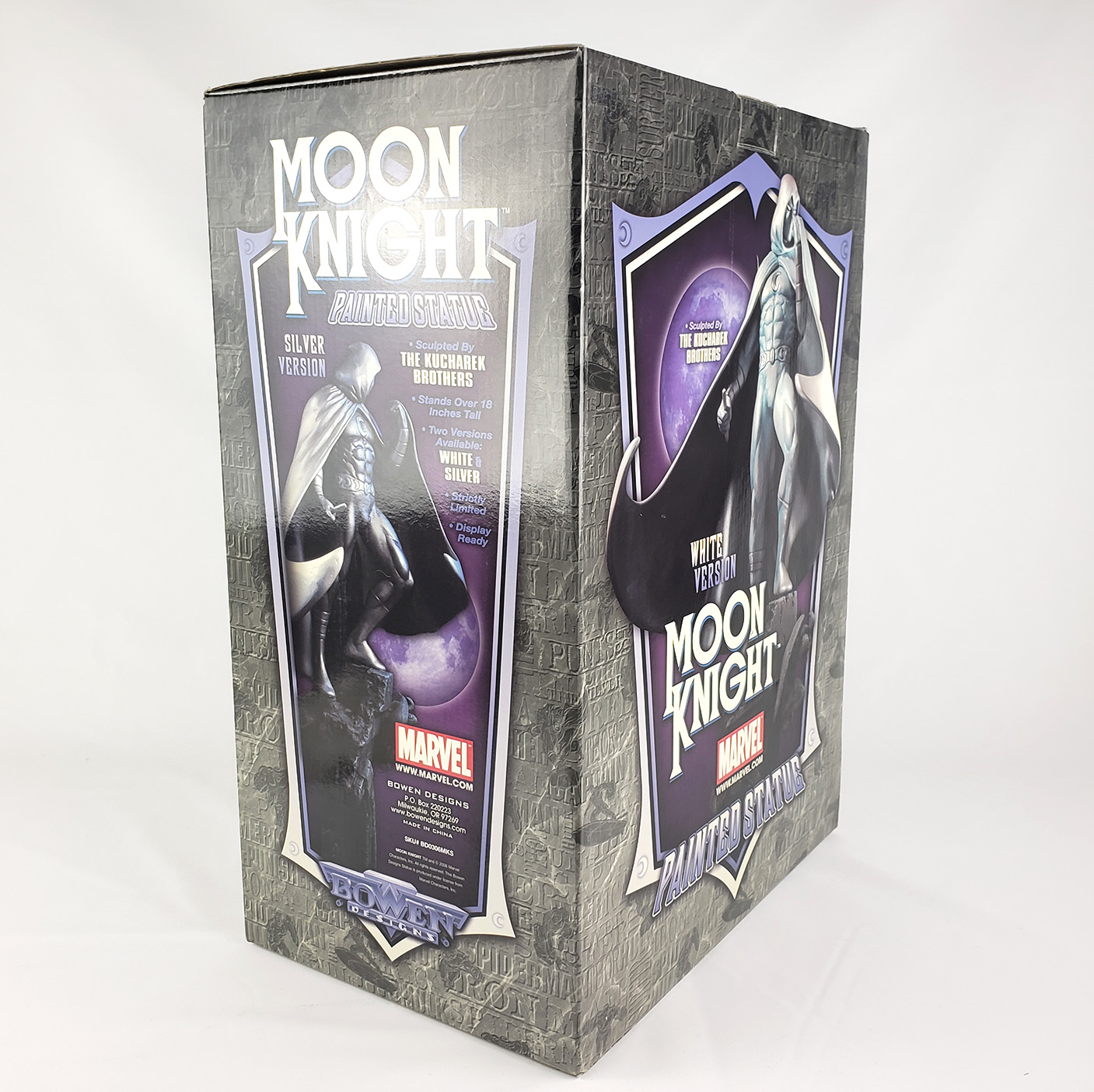 In 2006 the Fan Favorite Statue Producer Bowen Designs released their second Moon Knight product, a Full figure statue. It was part of Bowens Phase 3 Marvel Statues, #63 to be exact. It had an edition size of 2000 statues, and launched for $190. Not only was this the first full figure Statue of Moon Knight, it is also the only statue to acknowledge that Moon Knight's classic costume was Silver and not white. This statue was sculpted by the Kucharek Brothers and came in two painted varieties. The other version, a White variant, was released around the same time and is considerably more rare. The statue comes in two pieces: the figure, and the base. Although relatively durable, the two pieces do not make a tight connection. Furthermore, it is inappropriately top heavy leading to stability issues. It needs to be displayed securely to keep it from falling over. This statue is rare, and sells for higher than its introductory price.