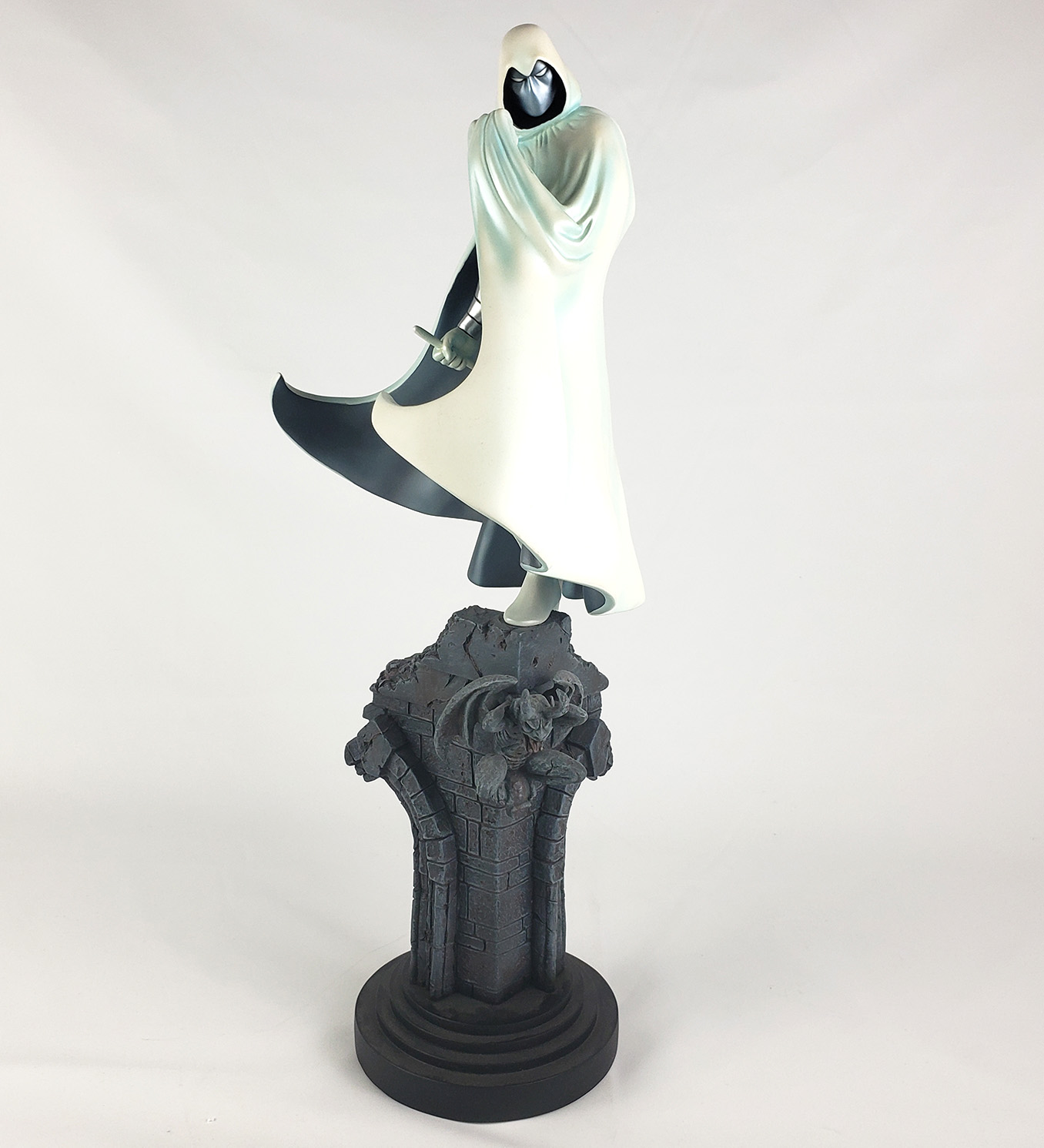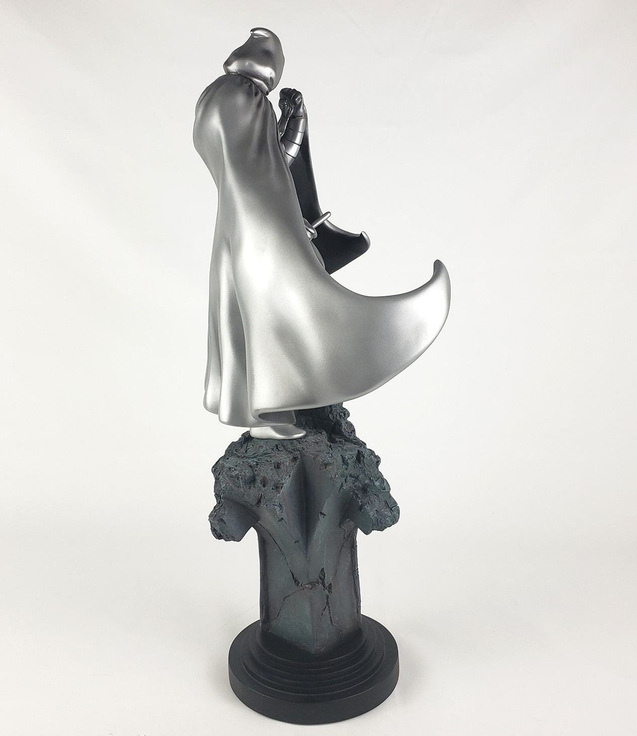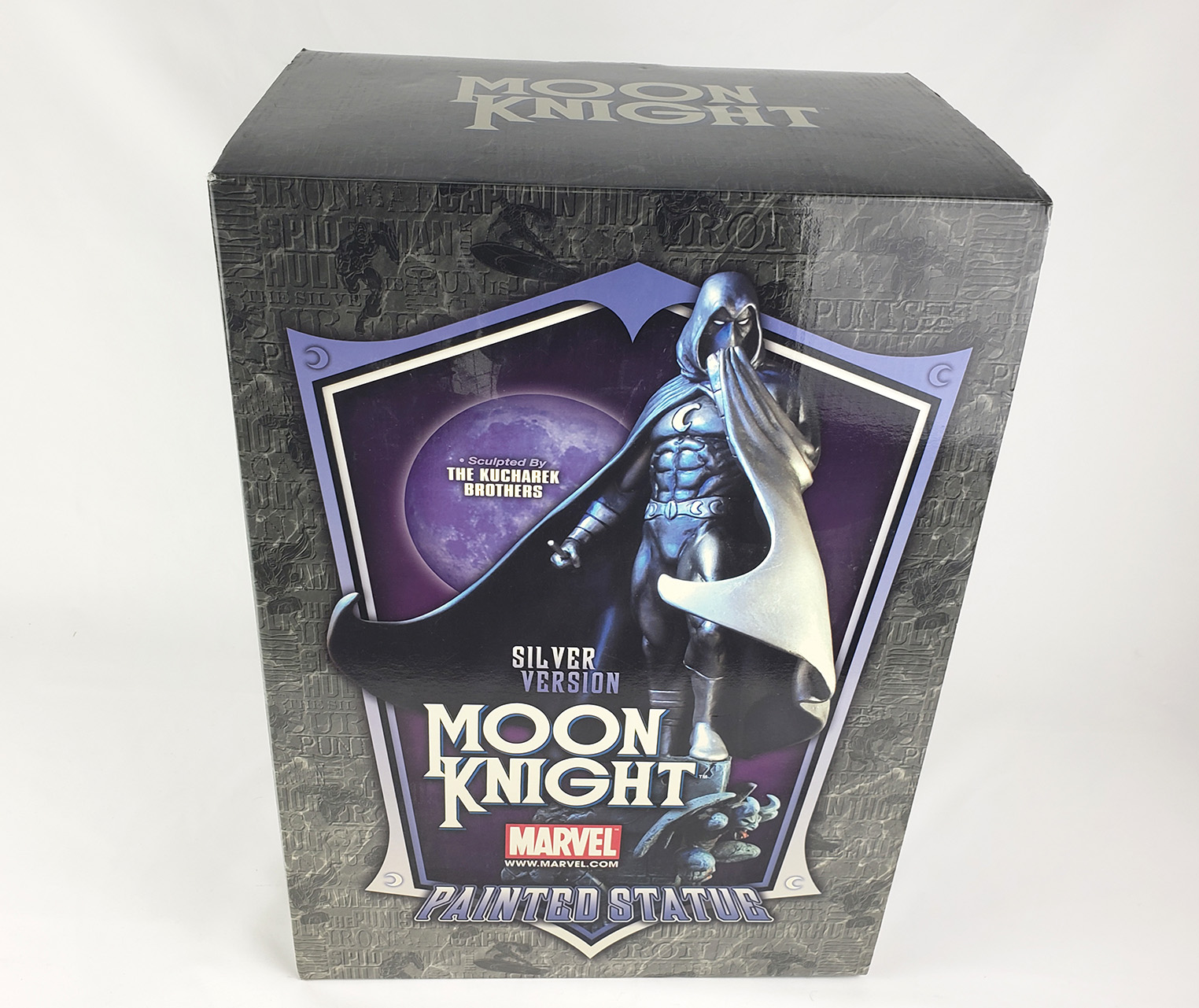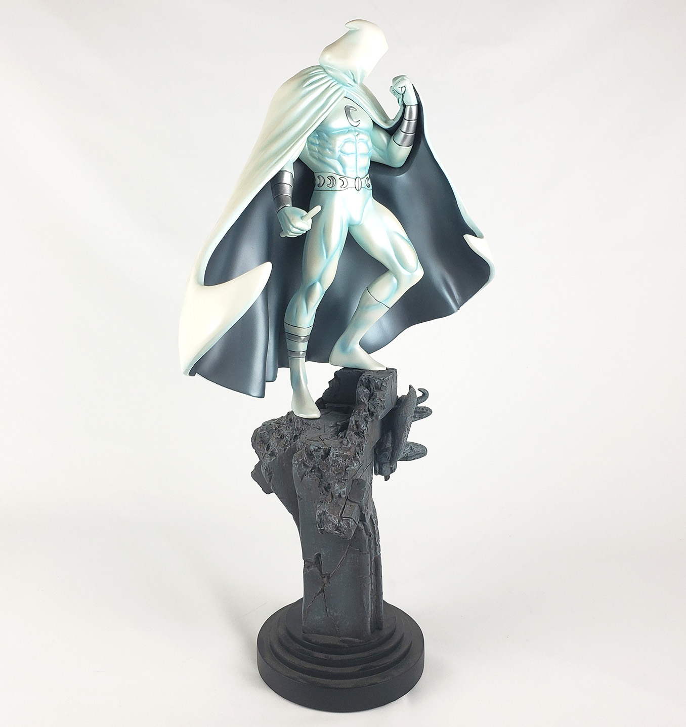 In 2006 the Fan Favorite Statue Producer Bowen Designs released their second Moon Knight product, a Full figure statue. It was part of Bowens Phase 3 Marvel Statues, #63 to be exact. It had an edition size of 2000 statues, and launched for $190. Not only was this the first full figure Statue of Moon Knight, it is also the only statue to acknowledge that Moon Knight's classic costume was Silver and not white. This statue was sculpted by the Kucharek Brothers and came in two painted varieties. The other version, a White variant, was released around the same time and is considerably more rare. The statue comes in two pieces: the figure, and the base. Although relatively durable, the two pieces do not make a tight connection. Furthermore, it is inappropriately top heavy leading to stability issues. It needs to be displayed securely to keep it from falling over. This statue is rare, and sells for higher than its introductory price.