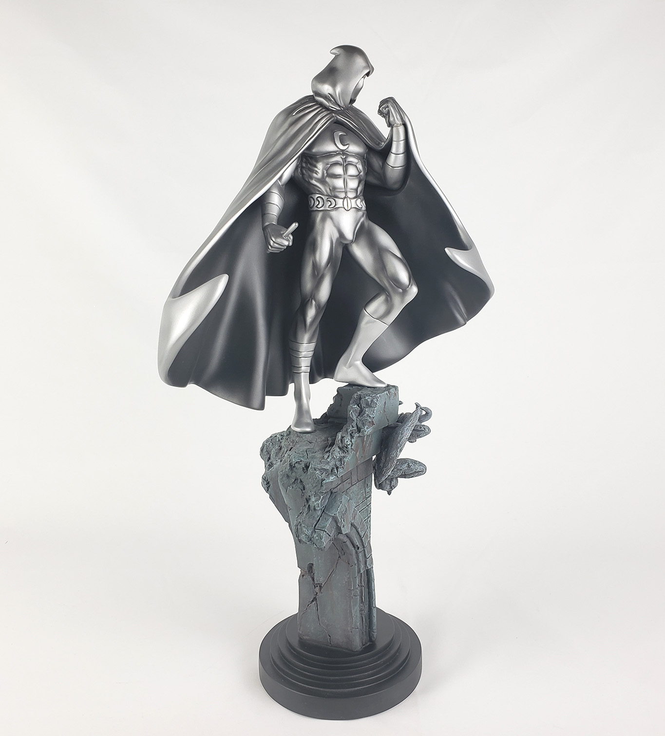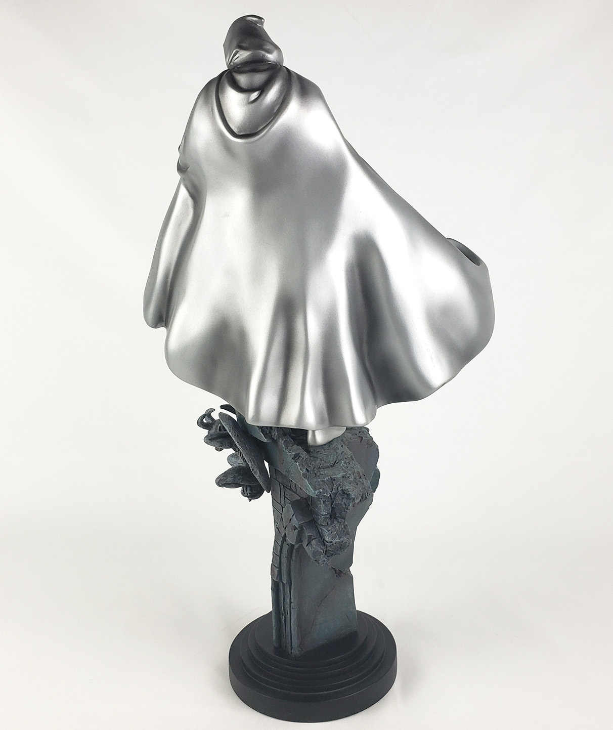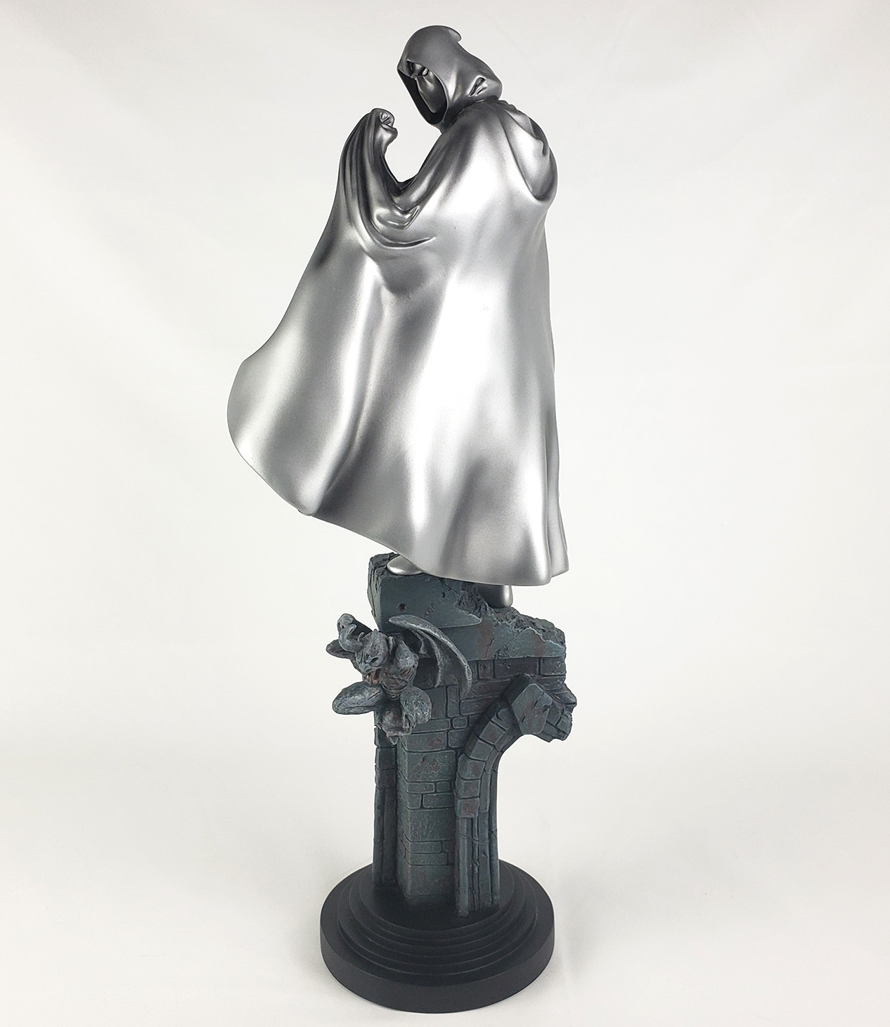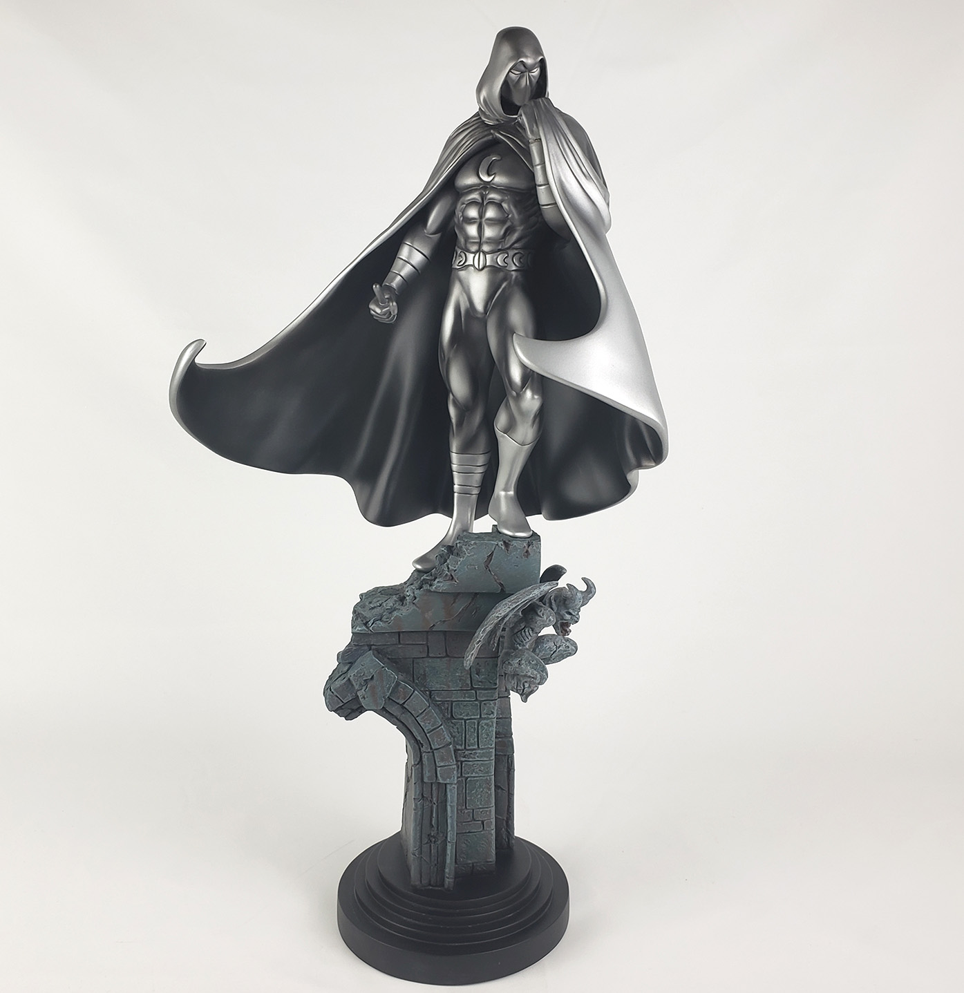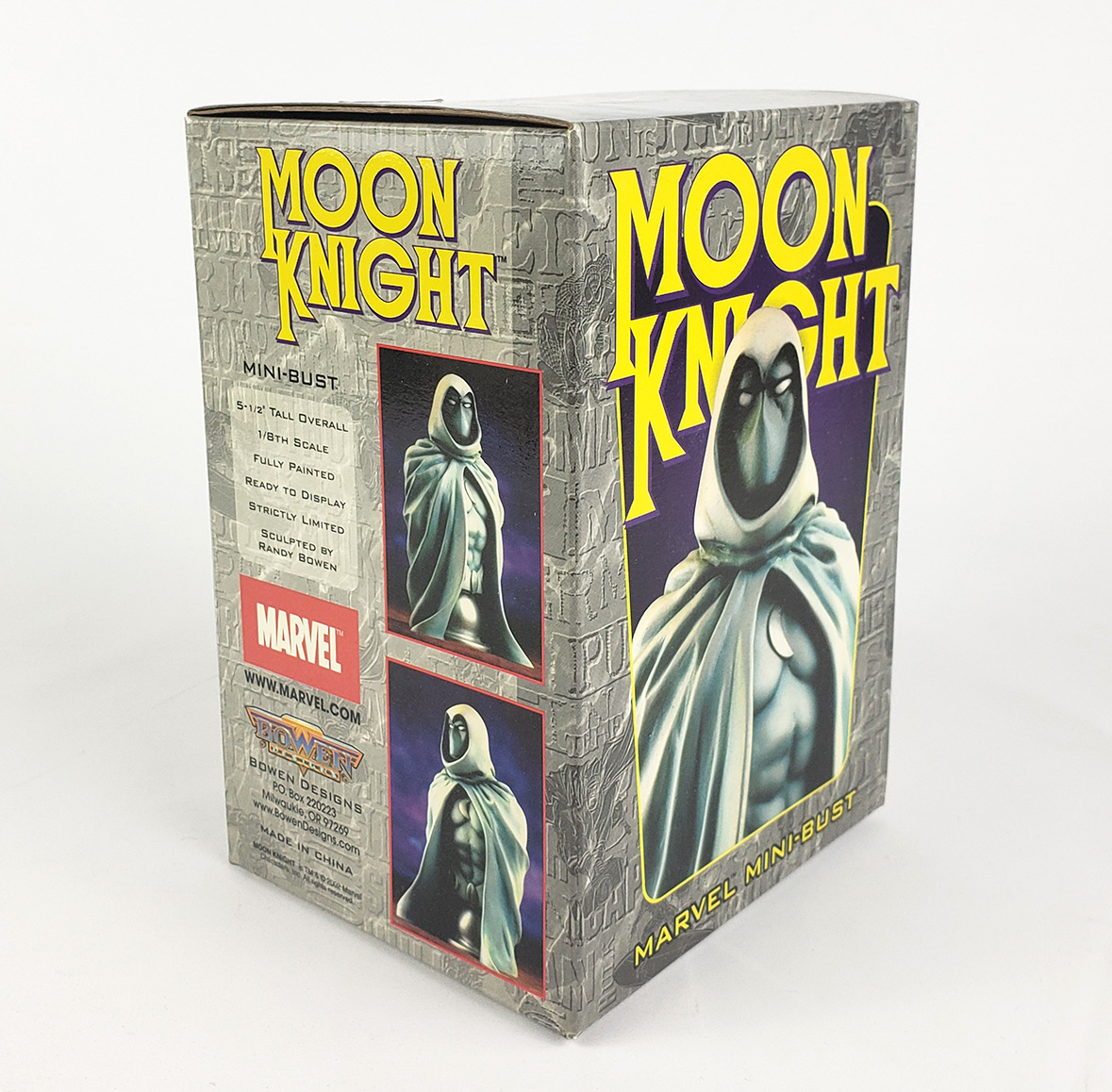 In 2006 the Fan Favorite Statue Producer Bowen Designs released their second Moon Knight product, a Full figure statue. It was part of Bowens Phase 3 Marvel Statues, #63 to be exact. It had an edition size of 2000 statues, and launched for $190. Not only was this the first full figure Statue of Moon Knight, it is also the only statue to acknowledge that Moon Knight's classic costume was Silver and not white. This statue was sculpted by the Kucharek Brothers and came in two painted varieties. The other version, a White variant, was released around the same time and is considerably more rare. The statue comes in two pieces: the figure, and the base. Although relatively durable, the two pieces do not make a tight connection. Furthermore, it is inappropriately top heavy leading to stability issues. It needs to be displayed securely to keep it from falling over. This statue is rare, and sells for higher than its introductory price.