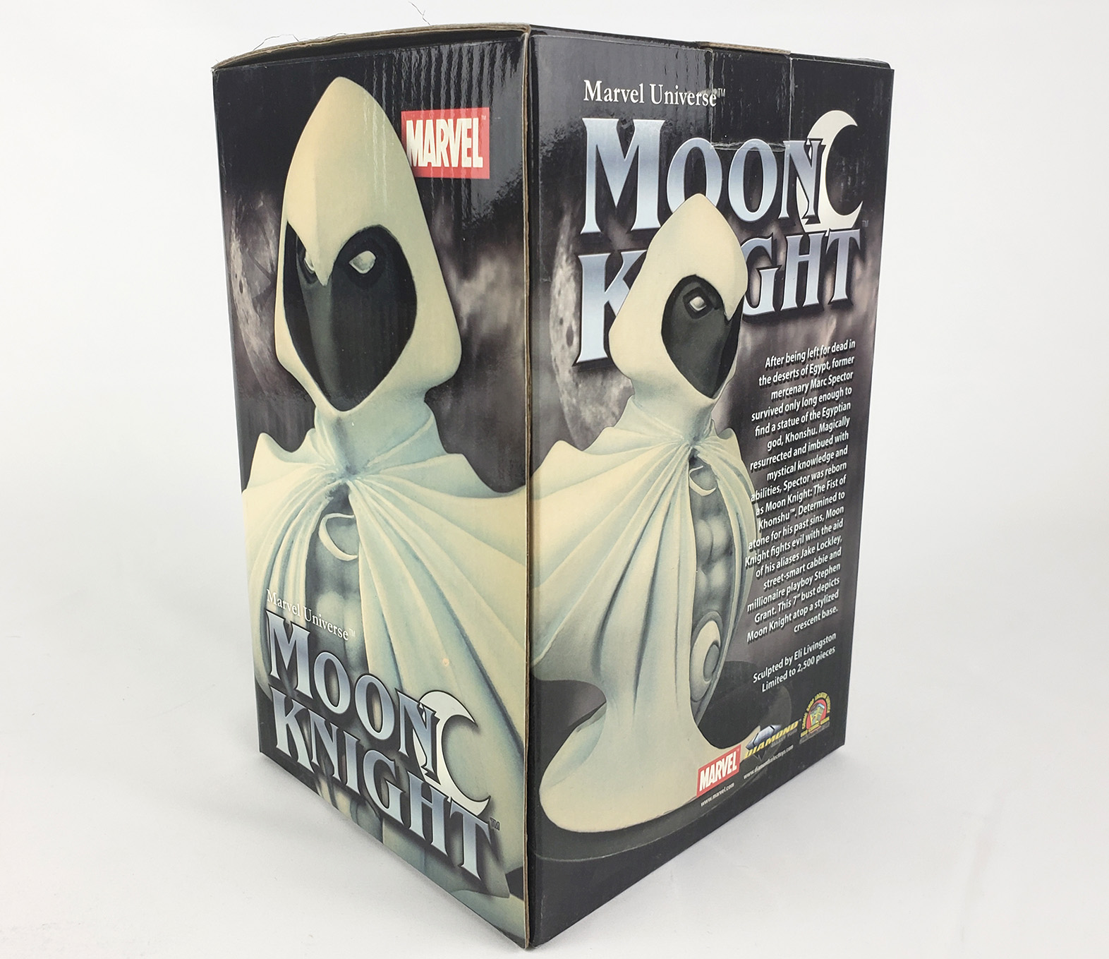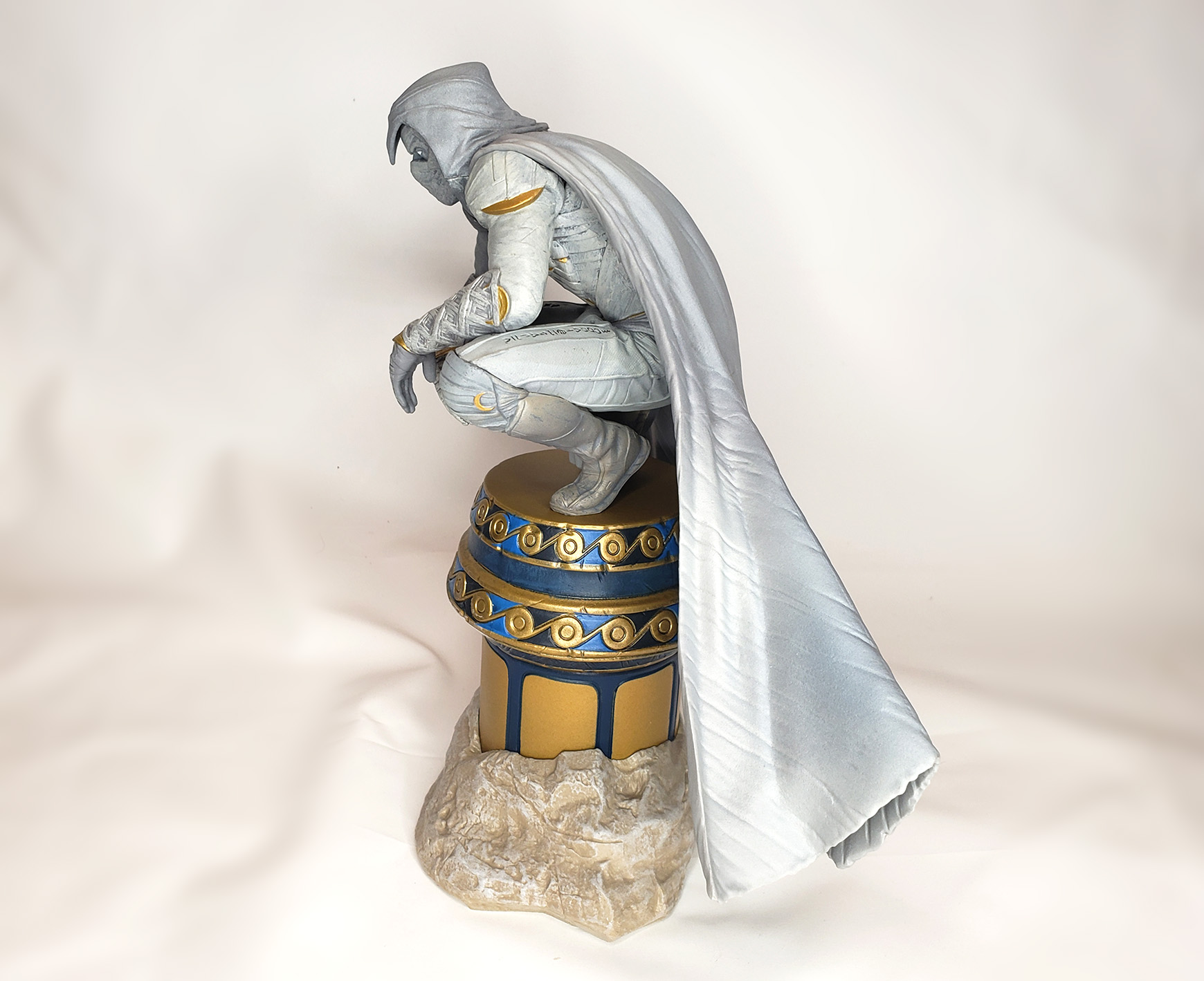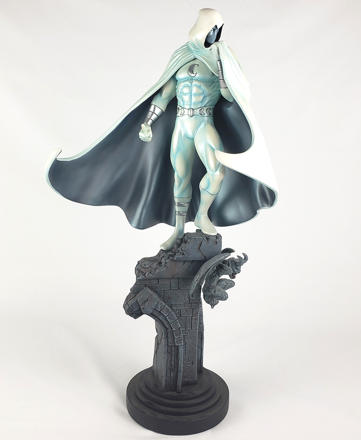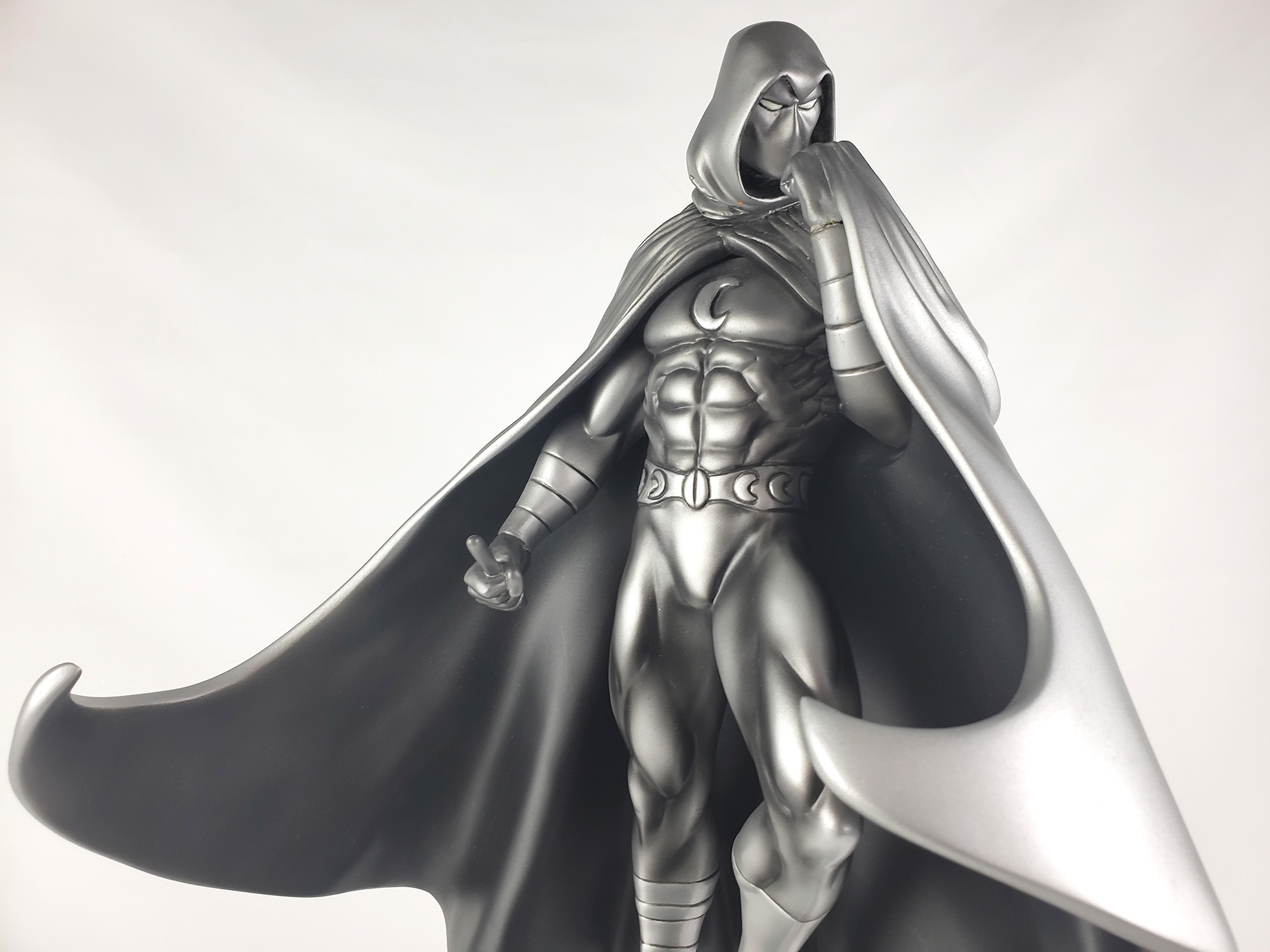 In 2006 the Fan Favorite Statue Producer Bowen Designs released their second Moon Knight product, a Full figure statue. It was part of Bowens Phase 3 Marvel Statues, #63 to be exact. It had an edition size of 2000 statues, and launched for $190. Not only was this the first full figure Statue of Moon Knight, it is also the only statue to acknowledge that Moon Knight's classic costume was Silver and not white. This statue was sculpted by the Kucharek Brothers and came in two painted varieties. The other version, a White variant, was released around the same time and is considerably more rare. The statue comes in two pieces: the figure, and the base. Although relatively durable, the two pieces do not make a tight connection. Furthermore, it is inappropriately top heavy leading to stability issues. It needs to be displayed securely to keep it from falling over. This statue is rare, and sells for higher than its introductory price.
