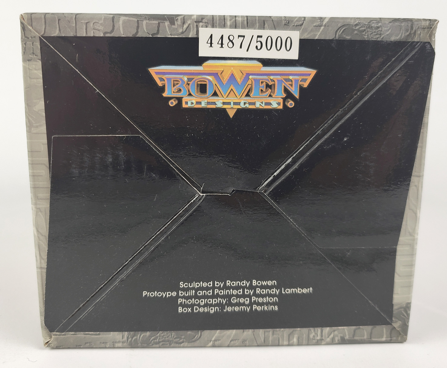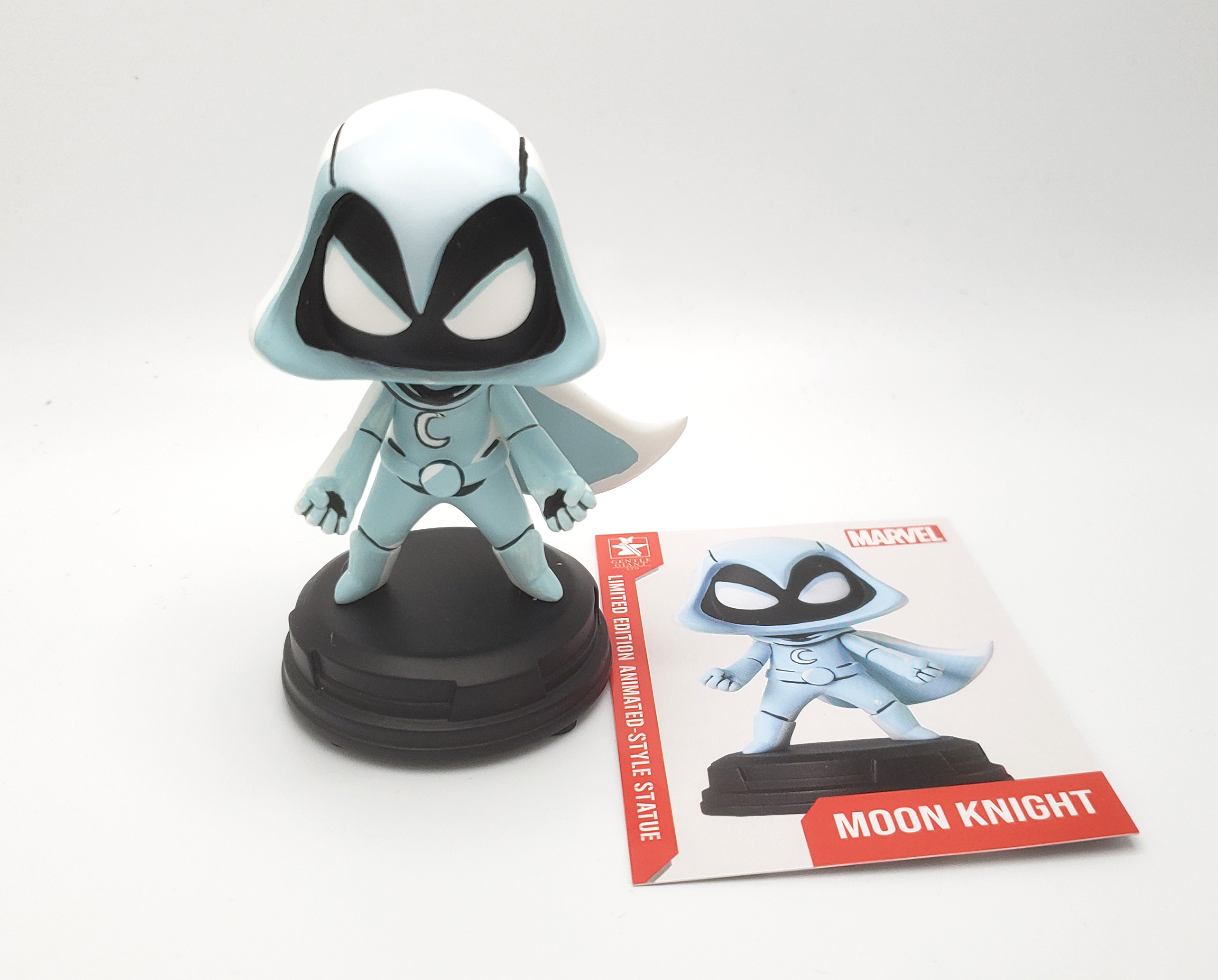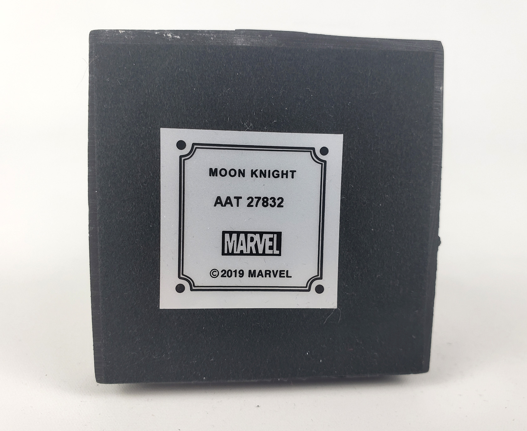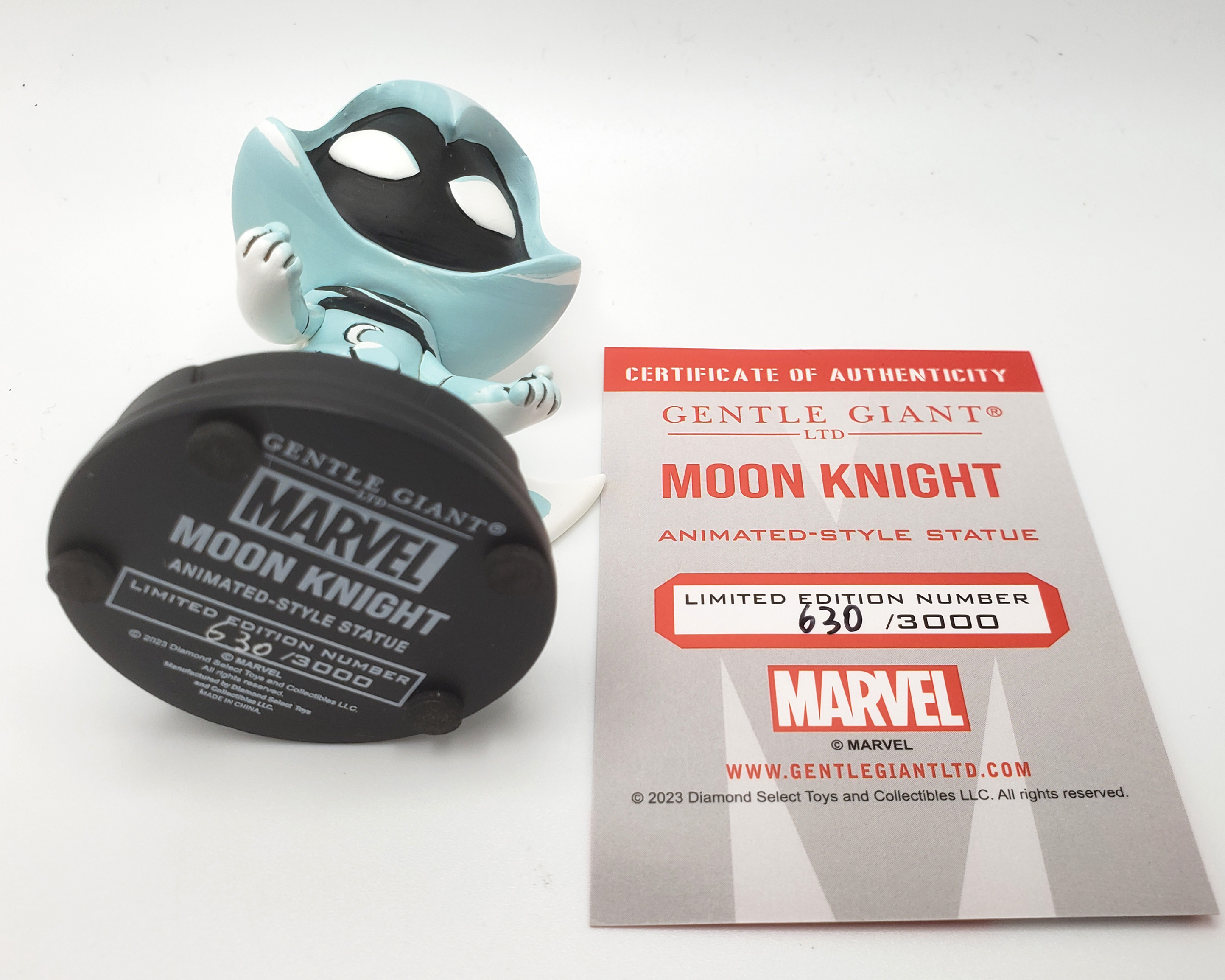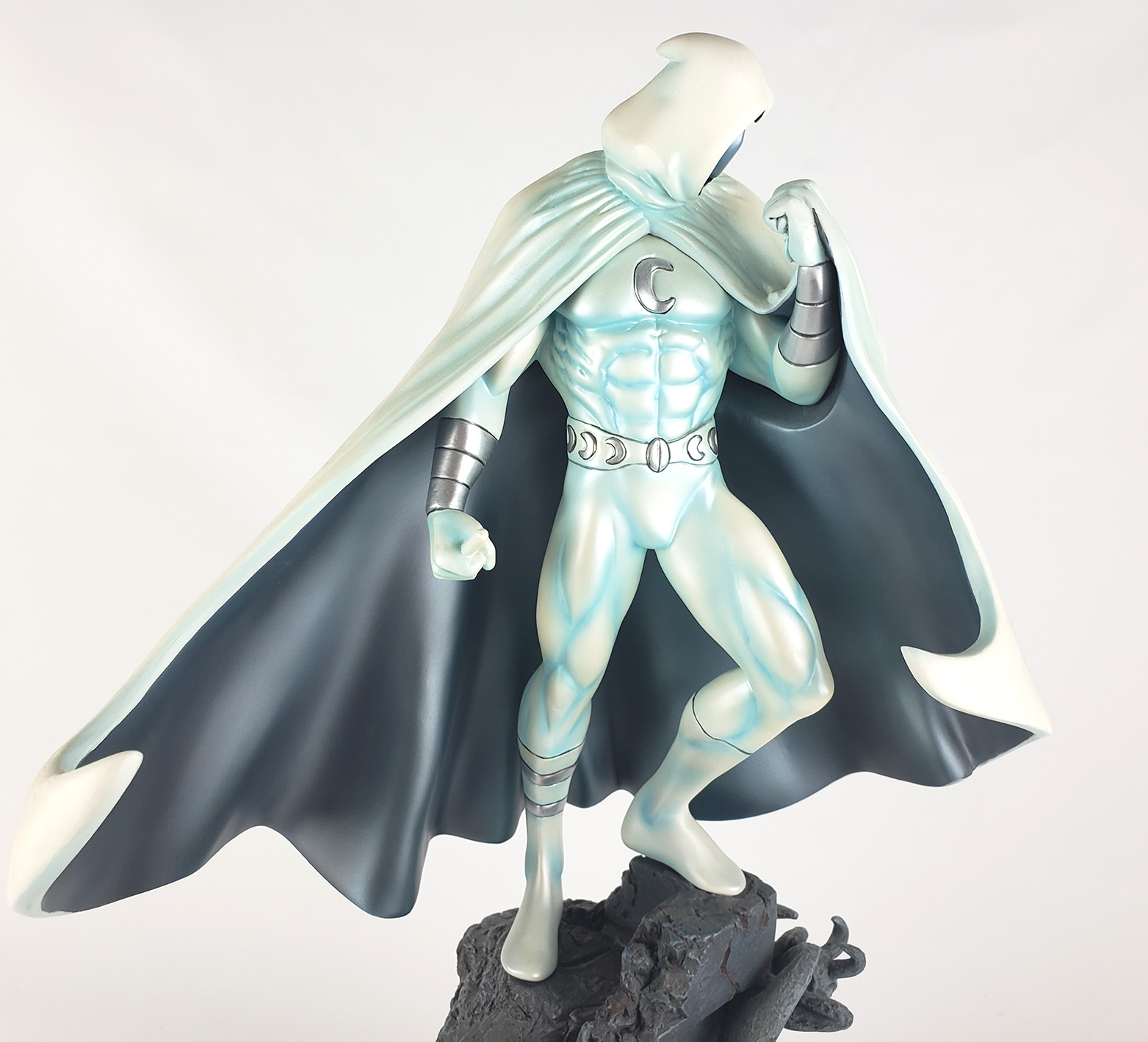In 2006 the Fan Favorite Statue Producer Bowen Designs released their second Moon Knight product, a Full figure statue. It was part of Bowens Phase 3 Marvel Statues, #63 to be exact. It had an edition size of 2000 statues, and launched for $190. Not only was this the first full figure Statue of Moon Knight, it is also the only statue to acknowledge that Moon Knight's classic costume was Silver and not white. This statue was sculpted by the Kucharek Brothers and came in two painted varieties. The other version, a White variant, was released around the same time and is considerably more rare. The statue comes in two pieces: the figure, and the base. Although relatively durable, the two pieces do not make a tight connection. Furthermore, it is inappropriately top heavy leading to stability issues. It needs to be displayed securely to keep it from falling over. This statue is rare, and sells for higher than its introductory price.