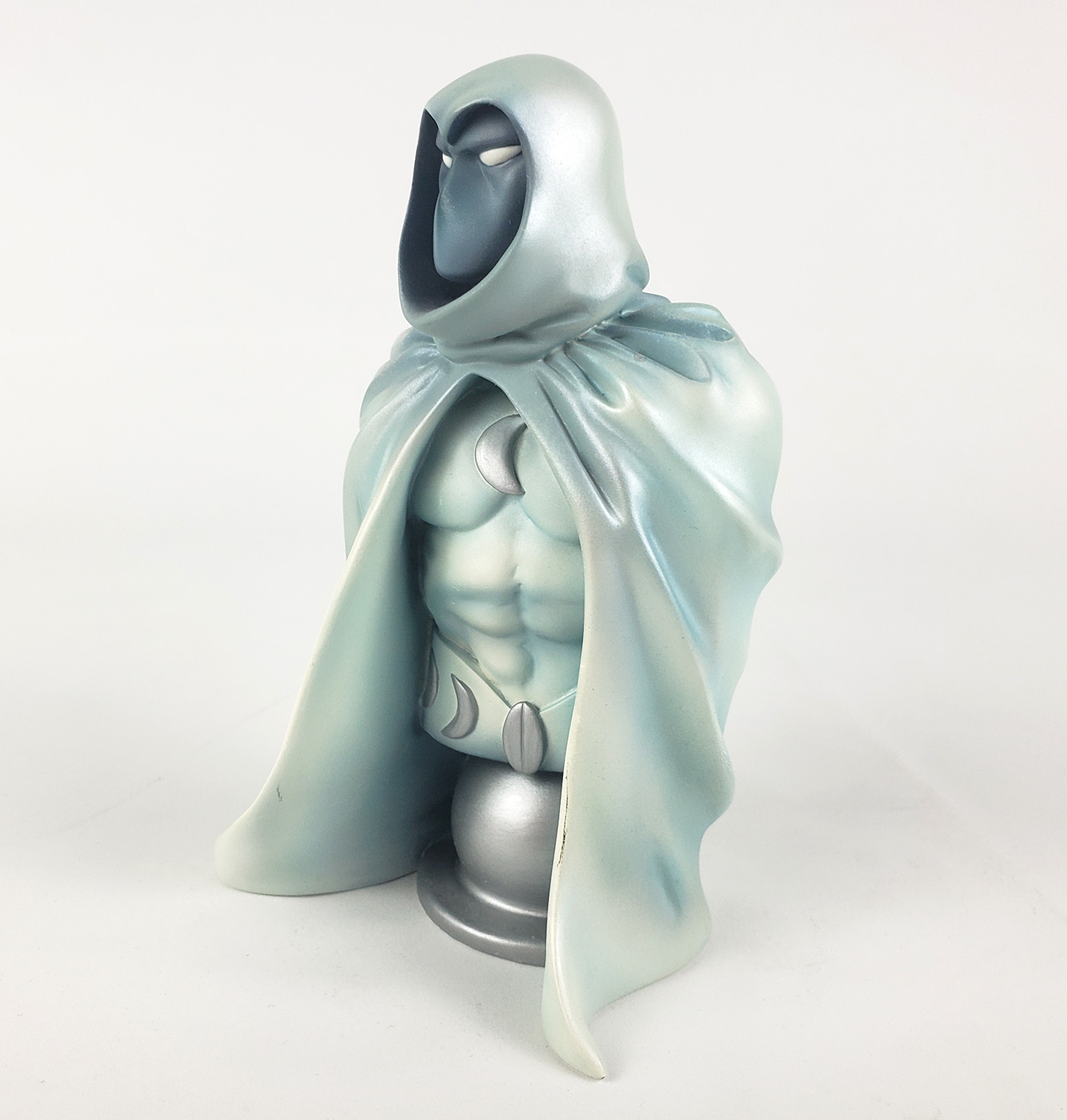 In 2002, Bowen designs released the first Official Moon Knight Statue ever made. It was Sculpted by famed artist Randy Bowen himself. Moon Knight became Mini-Bust #52 of their Marvel Phase 1 designs. This bust had an Edition size of 5000 pieces, making it one of the larger runs for a Moon Knight statue. It retailed for $40, which was pretty standard for 2002. This bust has a predominantly white paint with light blue accents, and a dark grey mask. The costume design used in this statue is clearly based on the classic volume 1 costume from his original 80's run. It is 5 1/2 inches tall and very sturdy thanks to the cape design around the base. Over the years the price has gone up considerably on this piece. It has been highly sought after, and images of it have been used for fan art more than any other sculpture I have seen. Over 20 years later, this bust still stands as one of the best Moon Knight statues created.