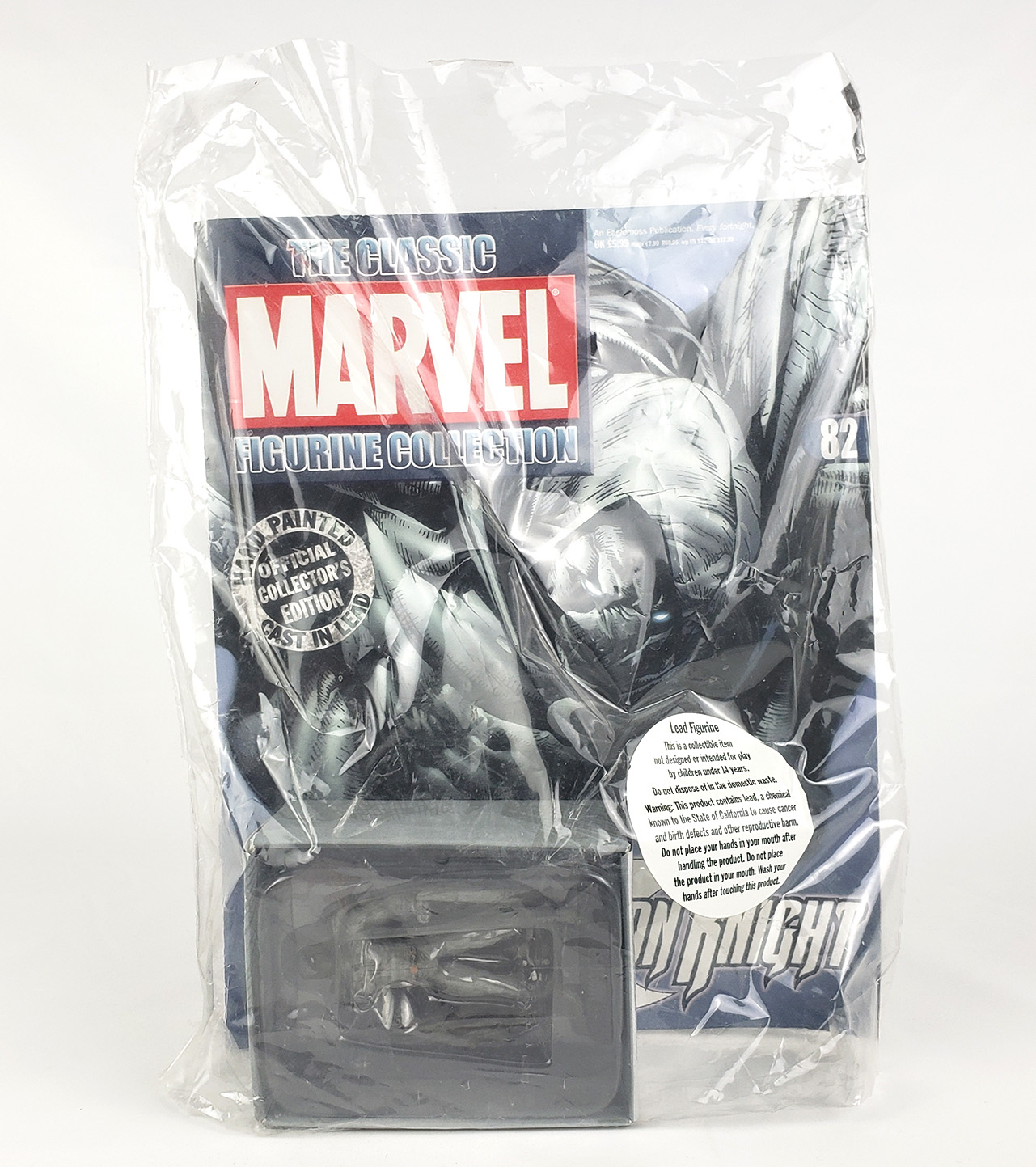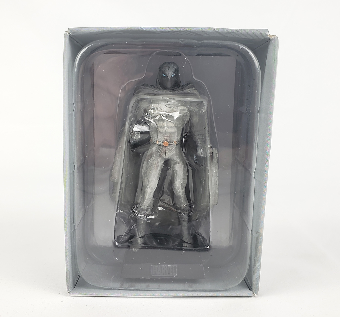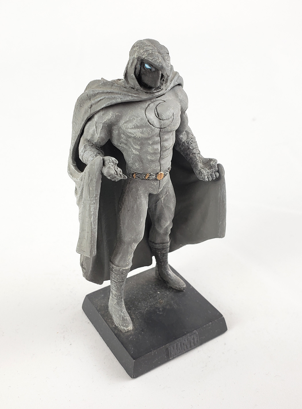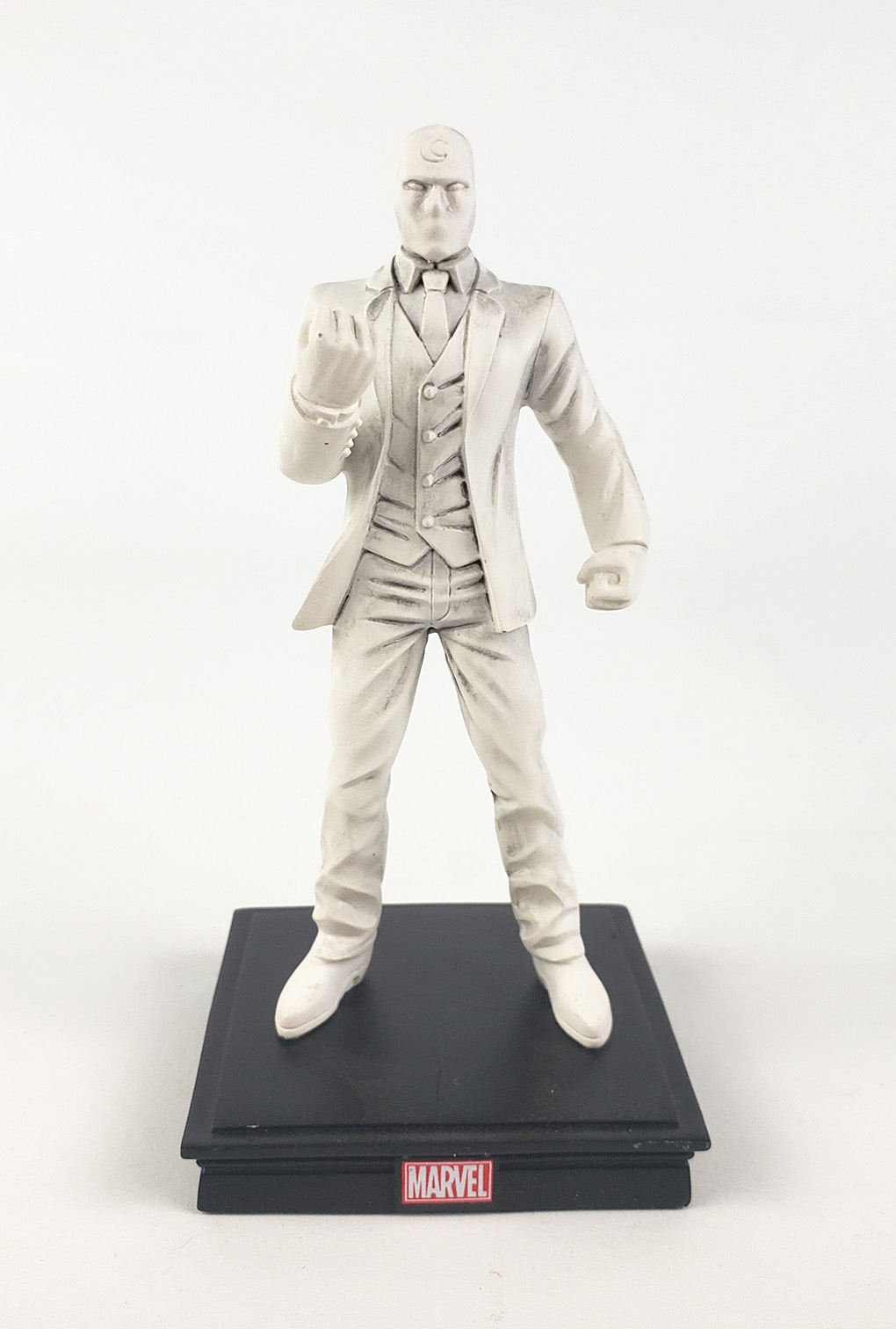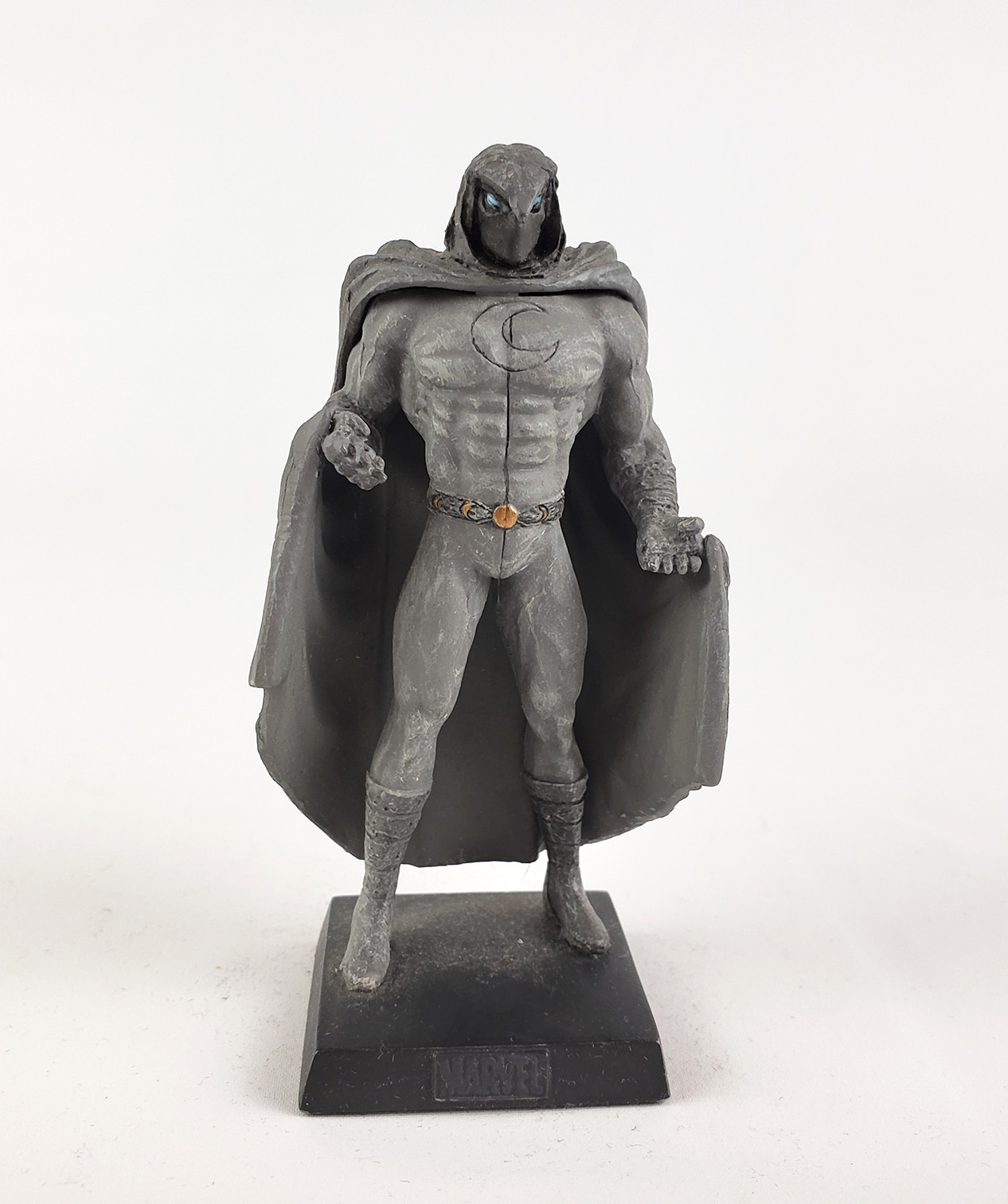 In 2009, Moon Knight became part of Eaglemoss Publication's "Classic Marvel Figurine Collection." This was a series of Magazines that spotlighted a different character with each issue. These magazines shipped with a 3.5 inch lead statuette of the character covered in the magazine. Moon Knight was figure/magazine #82. This mini statue is heavy despite its size. It is hand painted, and is primarily a grey flat color. The statuette features some gold accents on the belt as well as a black mask. Each figure is numbered on the base. The Detail is superb, with well realized costume details, including a seam down the middle and a tattered cape. This statuette is still surprisingly affordable to find online, and goes nicely on any desk or similar display.