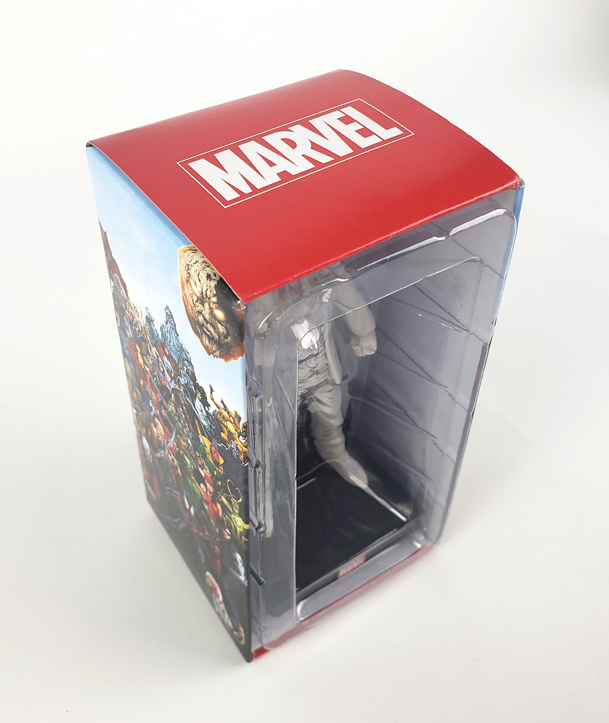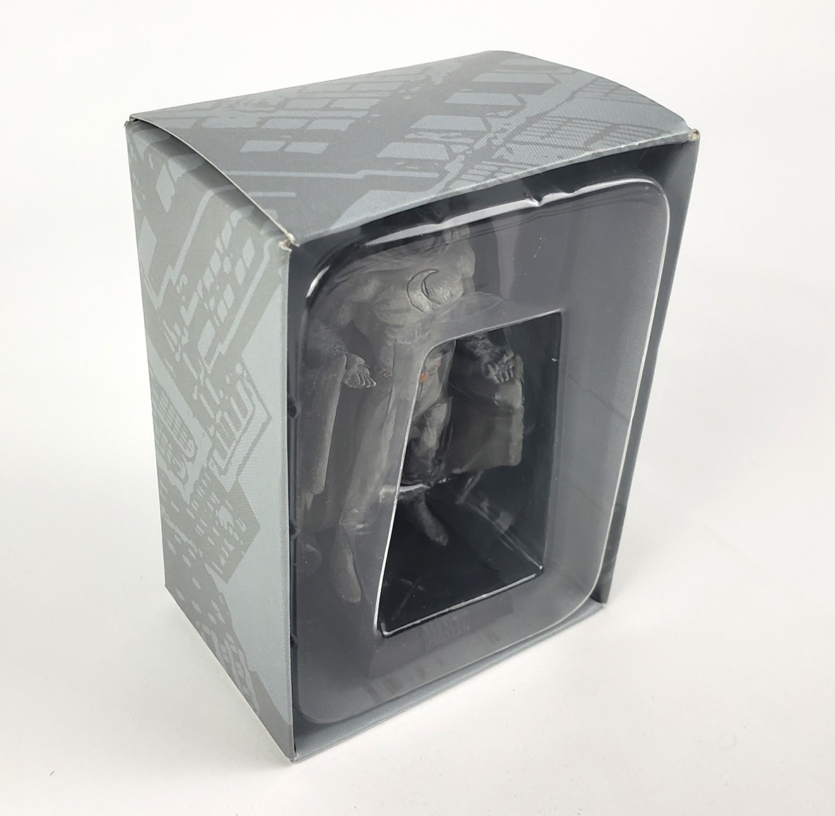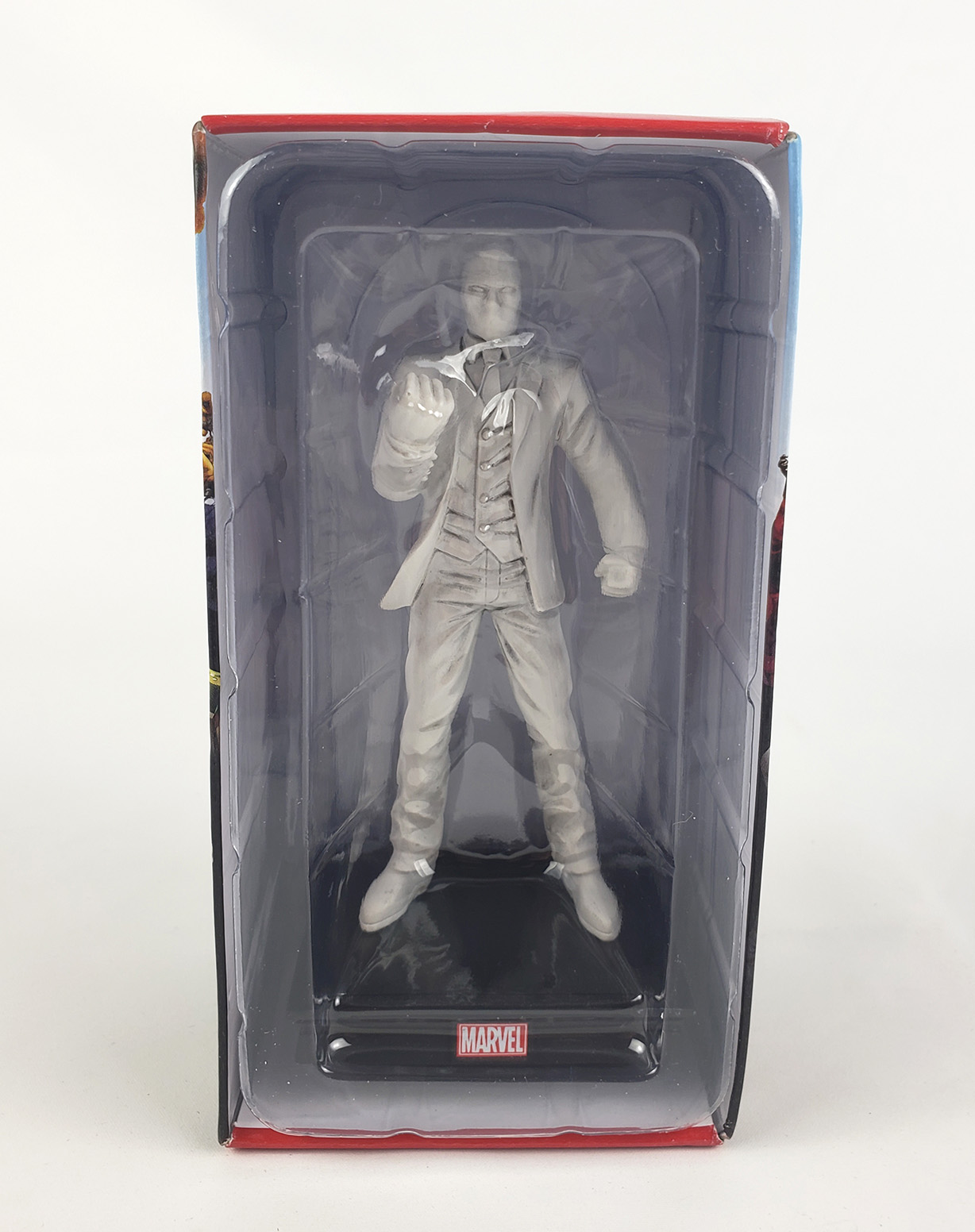 This 3.5 inch Statuette/Figure is the only Mr Knight themed Statue officially produced as of 2025. It was distributed by Panini in multiple markets accross the world in 2019 (and possibly earlier). It has not been made available within the United States. Each region features the same exact figure accompanied by a magazine. The magazine style/content (and language) varies depending on location, as does its issue number. The Italian, Mexican, and Spanish magazines feature nearly identical covers and are unbound so they can fold out into a poster featuring art by Declan Shalvey. The reading material appears to be identical outside of the specifics of the language. The German one (pictured) is considerably different, as it is a traditional style magazine bound with staples along the spine, and therefore does not open into a poster. It also features an alternative cover. It is similar in size and form to the Eaglemoss Statuette released earlier in English markets.