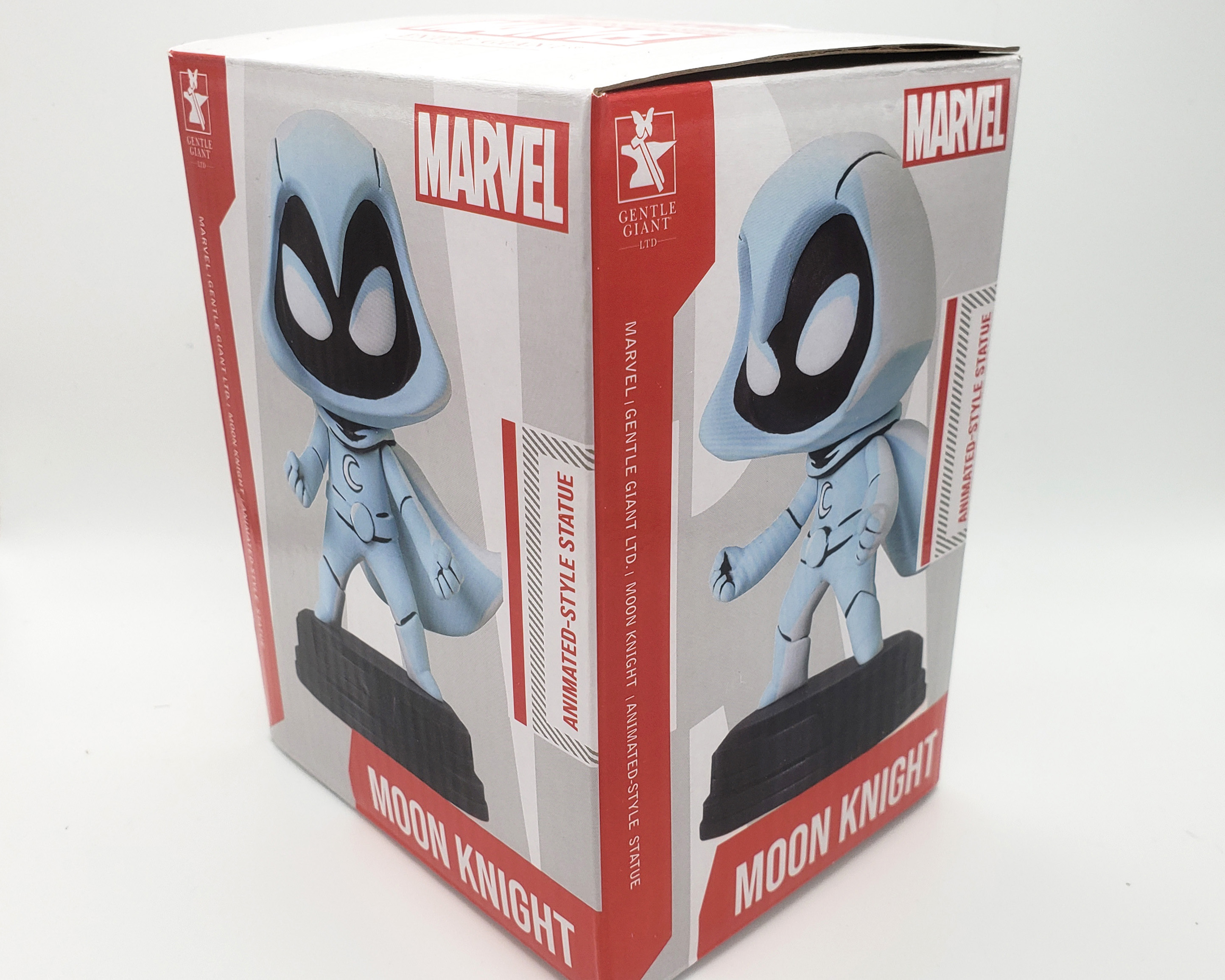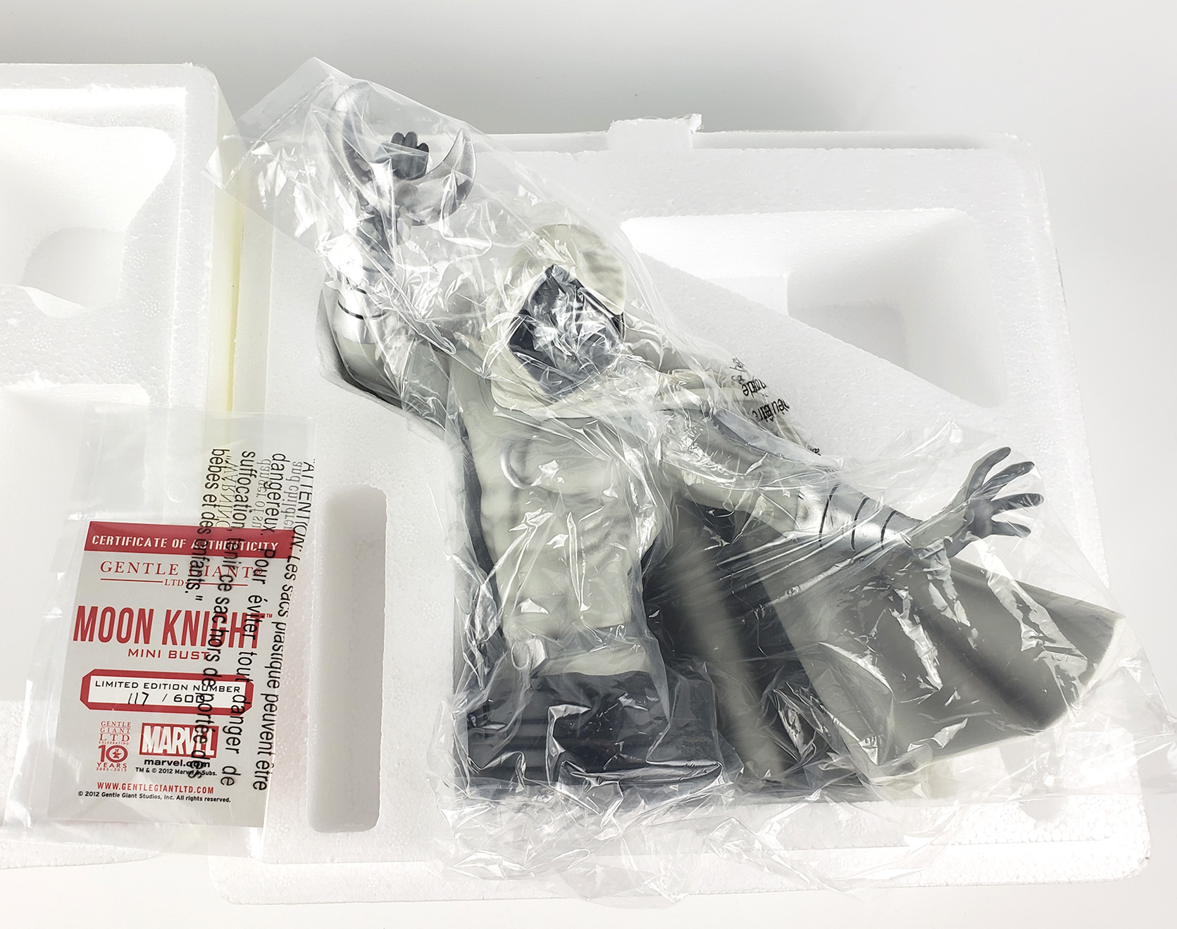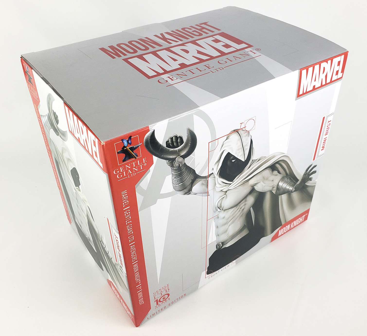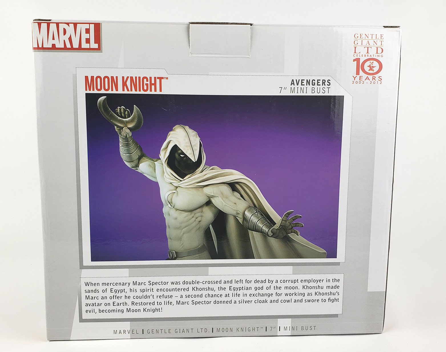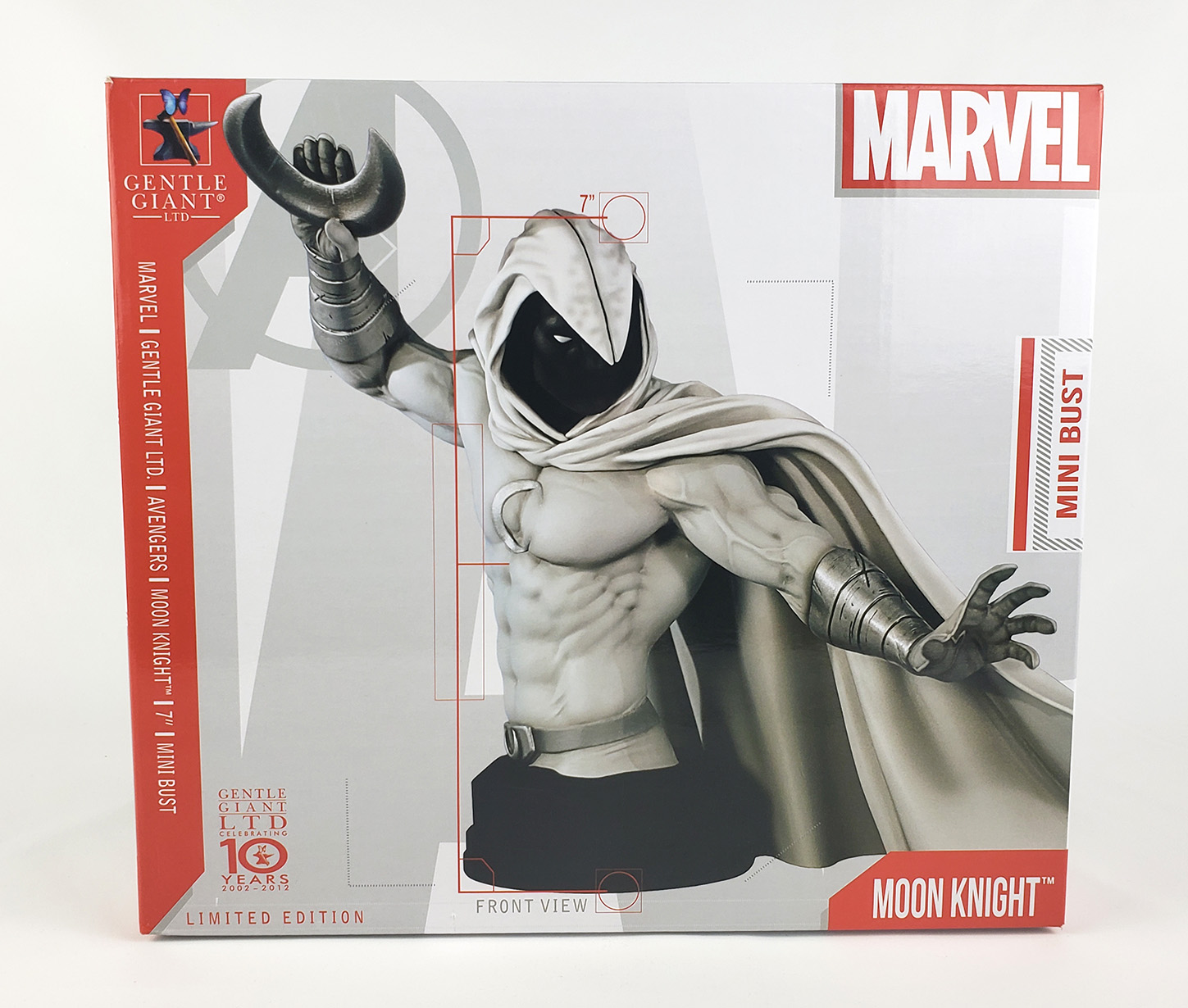 In late 2012, Gentle Giant released the third ever Moon Knight bust. Unlike the previous 2 busts, this one included his arms in the sculpture, as well as a large crescent dart. Standing at just over 7 inches tall, this highly detailed sculpture has a considerable width to it at around 9.25 inches. The statue is heavy and stable, and feels extremly durable. It launched at a reasonable $70, but has seen significant price increases online after its release. This statue has a relatively low production run of only 600 pieces. It depicts Moon Knights costume as being primarily white with a silver belt, emblem and gloves. His mask is black, and his cowl features a seam down the middle.