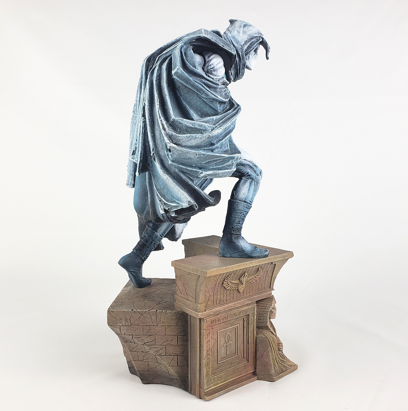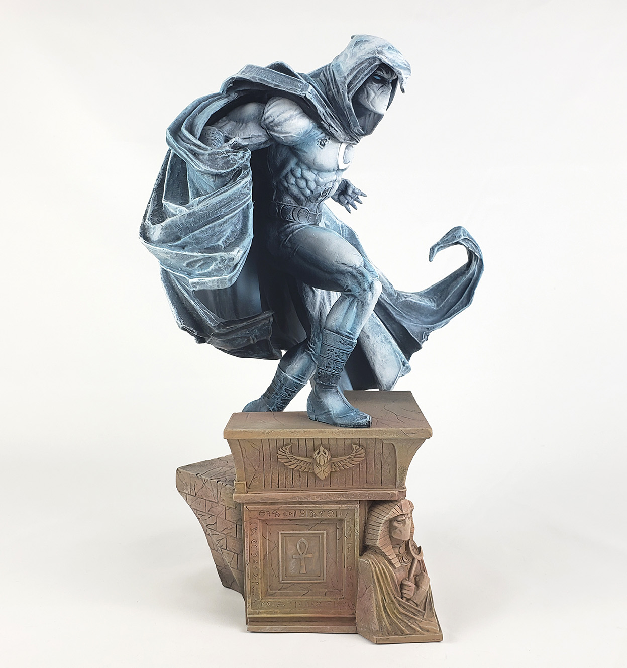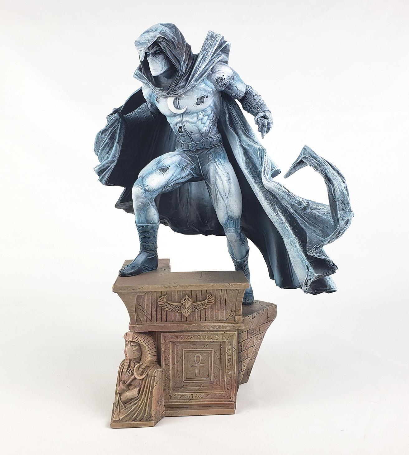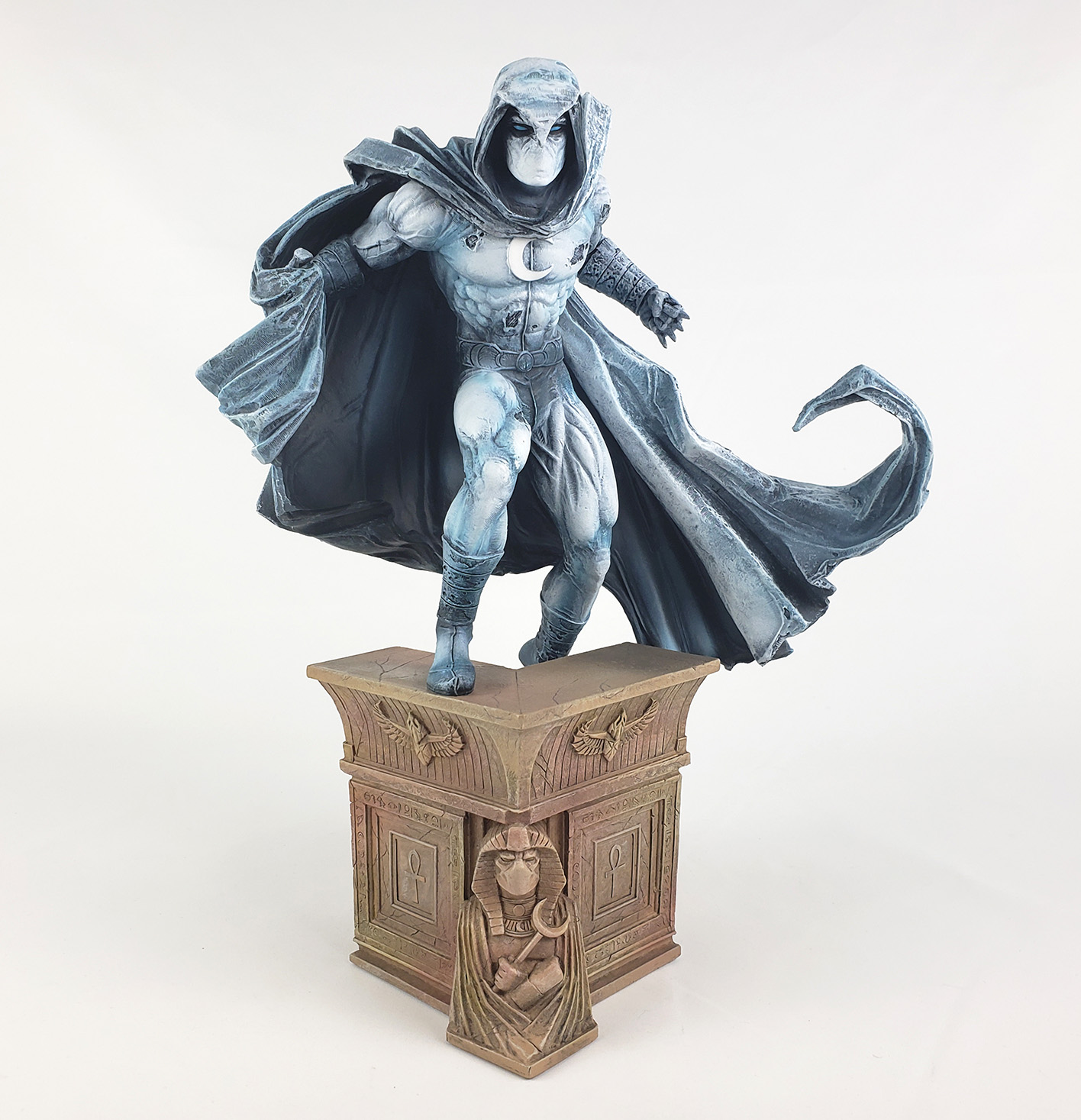 In the spring of 2018, Diamond Select Toys released their second Moon Knight piece, a full Moon Knight statue. Standing roughly 14 inches tall, This heavy statue is made out of pure resin. This sculpture depicts Moon Knight with a tattered white costume featuring blue and grey accents. This ipiece has incredible detail in both the sculpt and paint job. It feels durable and stable thanks to its wide base. It is limited to only 3,000 pieces, and was hand sculpted by Jean St. Jean. It feels like a very appropriate size for most displays. its intial retail I beleive was around $180, but i've seen it listed for up to $220. It is one of the highest quality Statues of Moon Knight to date.