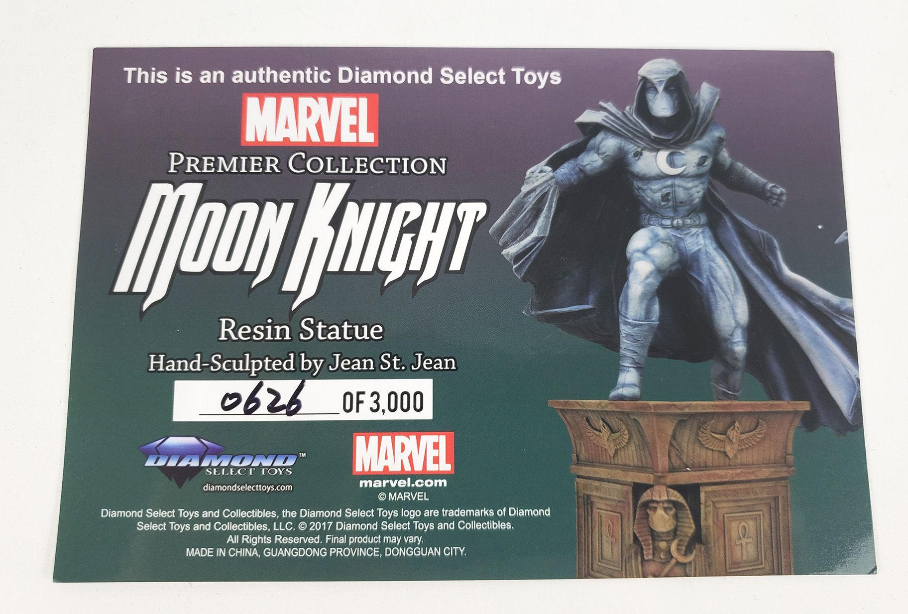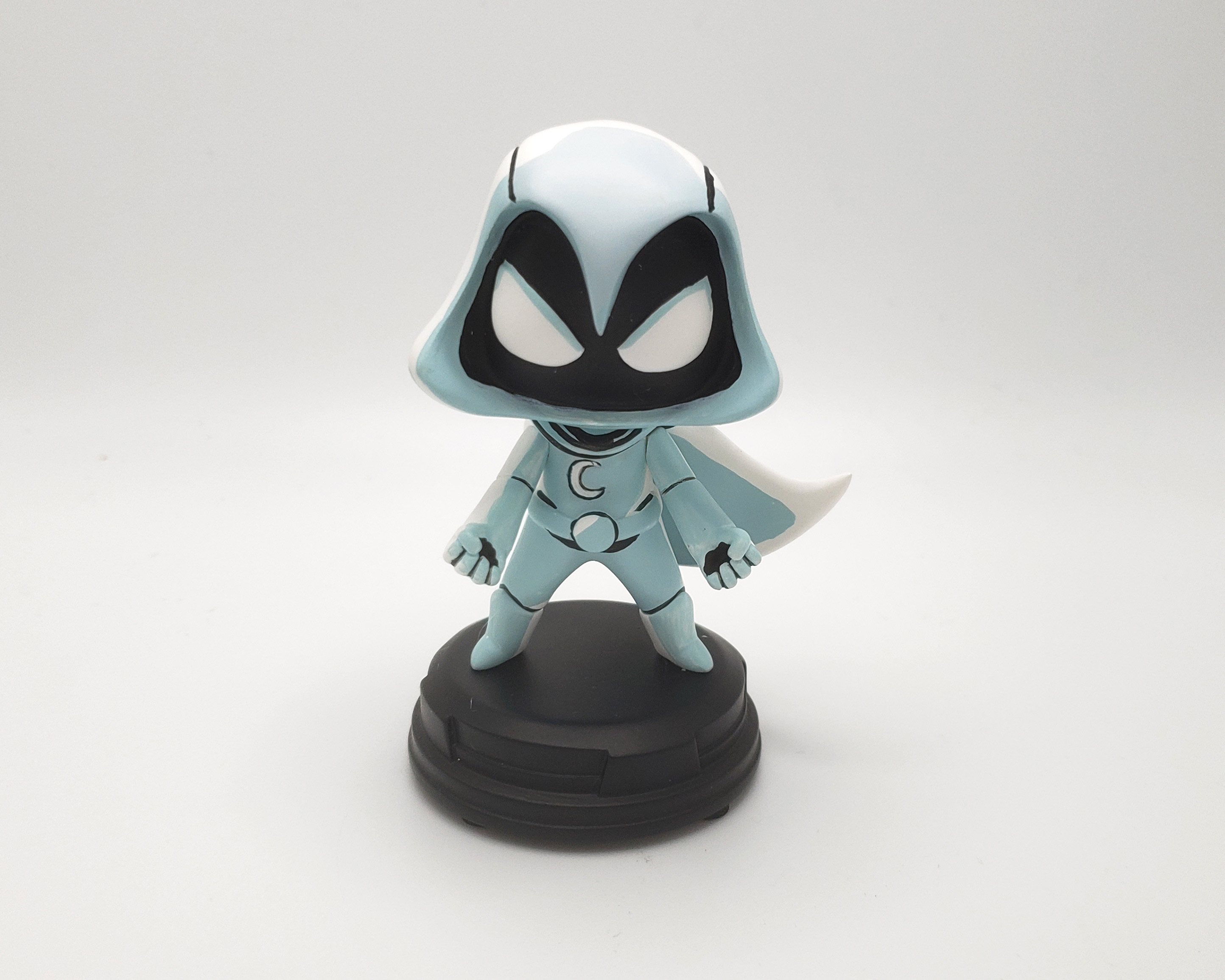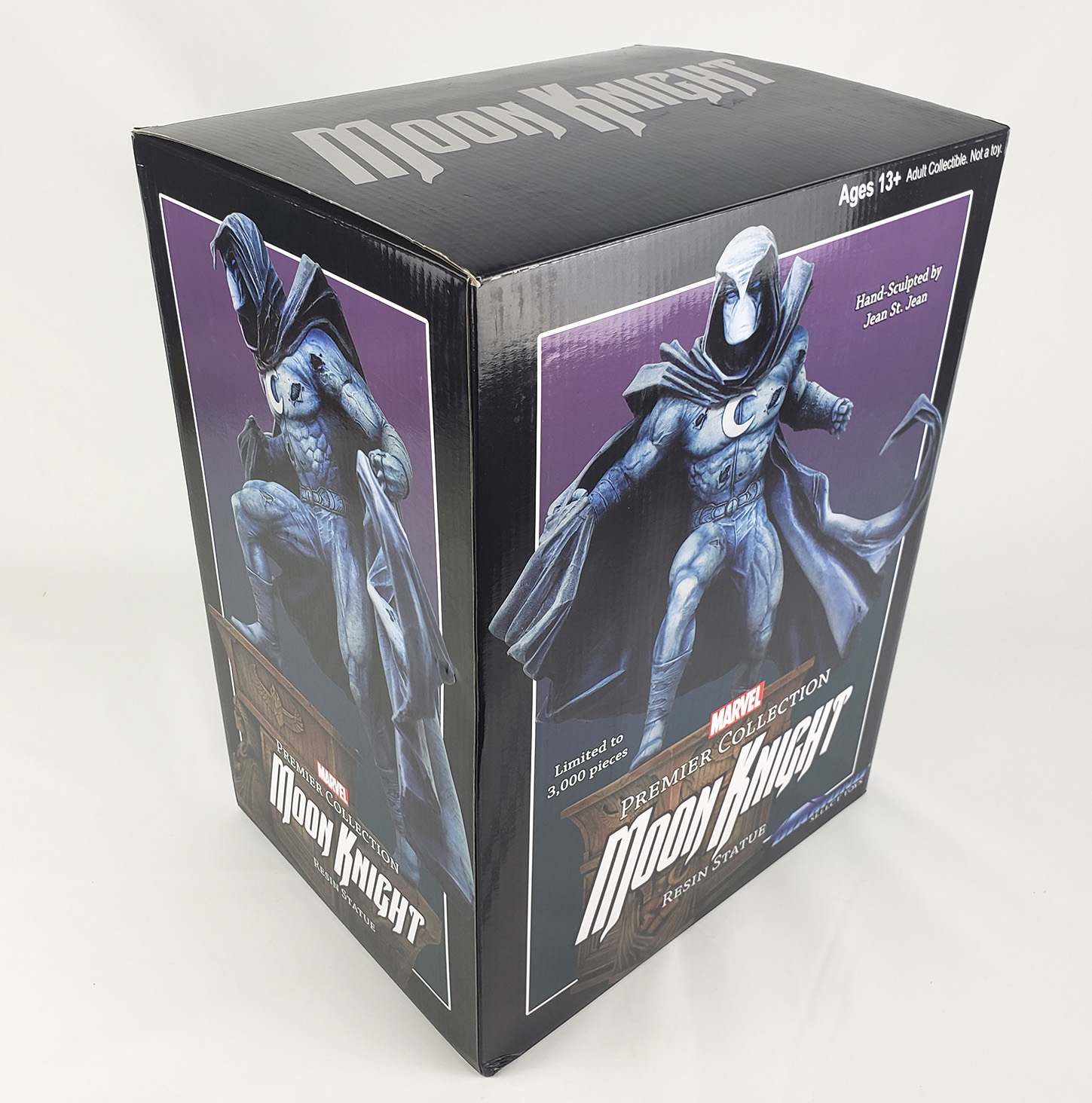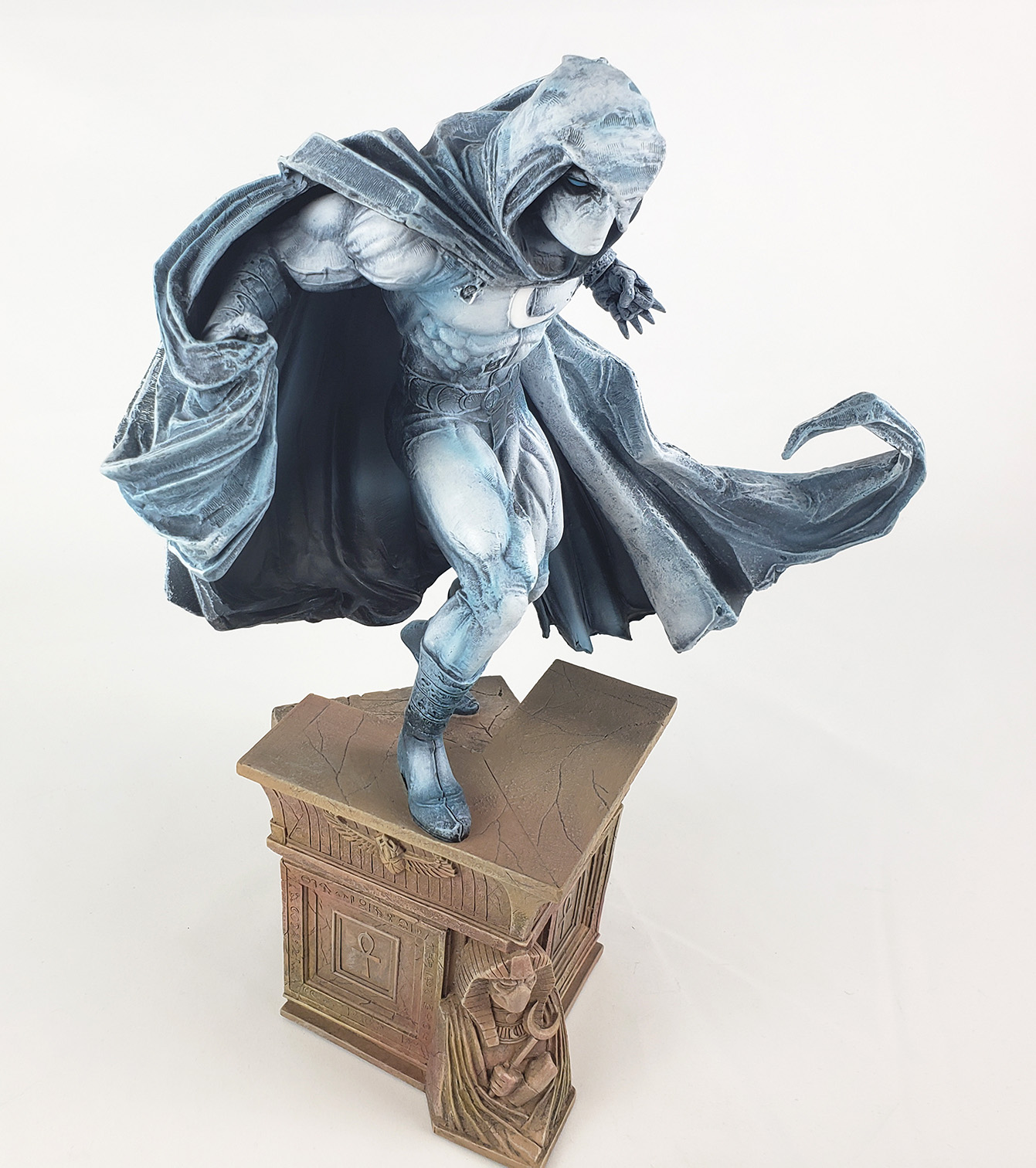In the spring of 2018, Diamond Select Toys released their second Moon Knight piece, a full Moon Knight statue. Standing roughly 14 inches tall, This heavy statue is made out of pure resin. This sculpture depicts Moon Knight with a tattered white costume featuring blue and grey accents. This ipiece has incredible detail in both the sculpt and paint job. It feels durable and stable thanks to its wide base. It is limited to only 3,000 pieces, and was hand sculpted by Jean St. Jean. It feels like a very appropriate size for most displays. its intial retail I beleive was around $180, but i've seen it listed for up to $220. It is one of the highest quality Statues of Moon Knight to date.